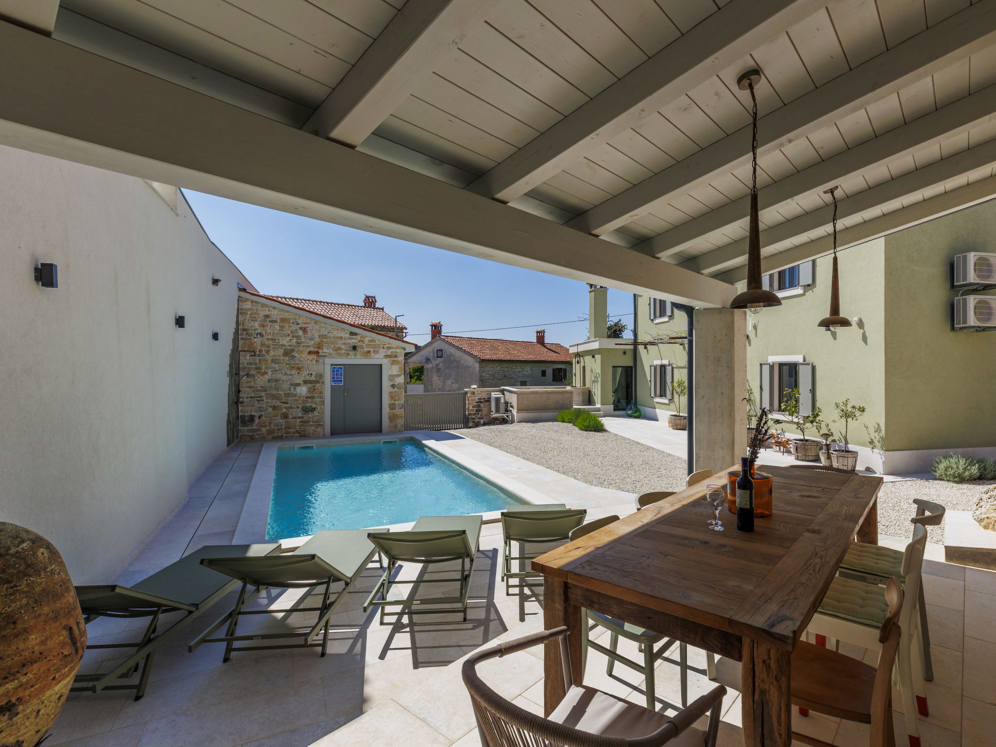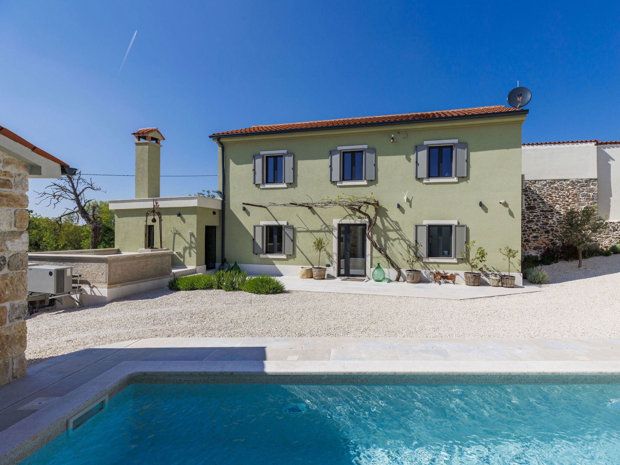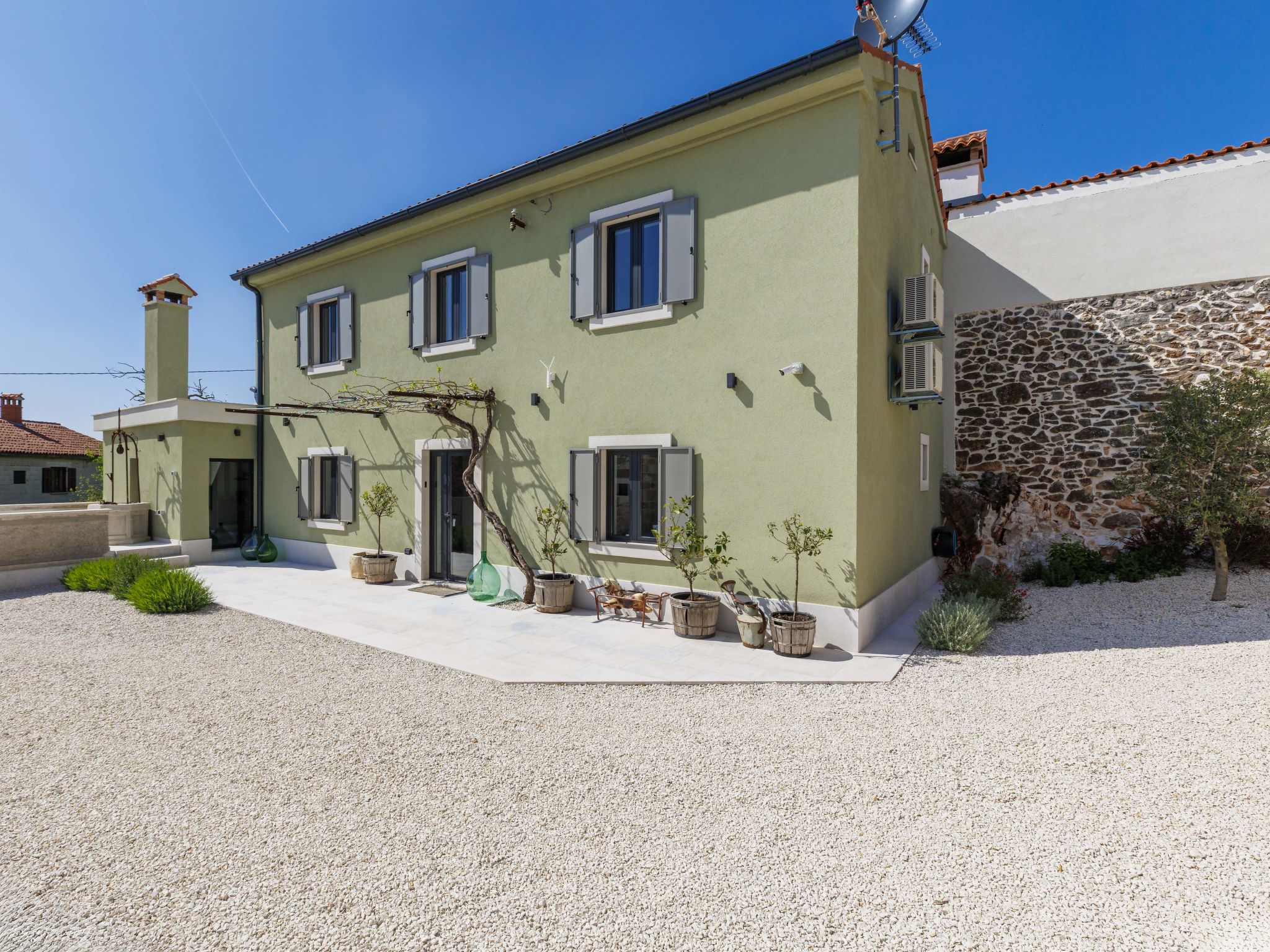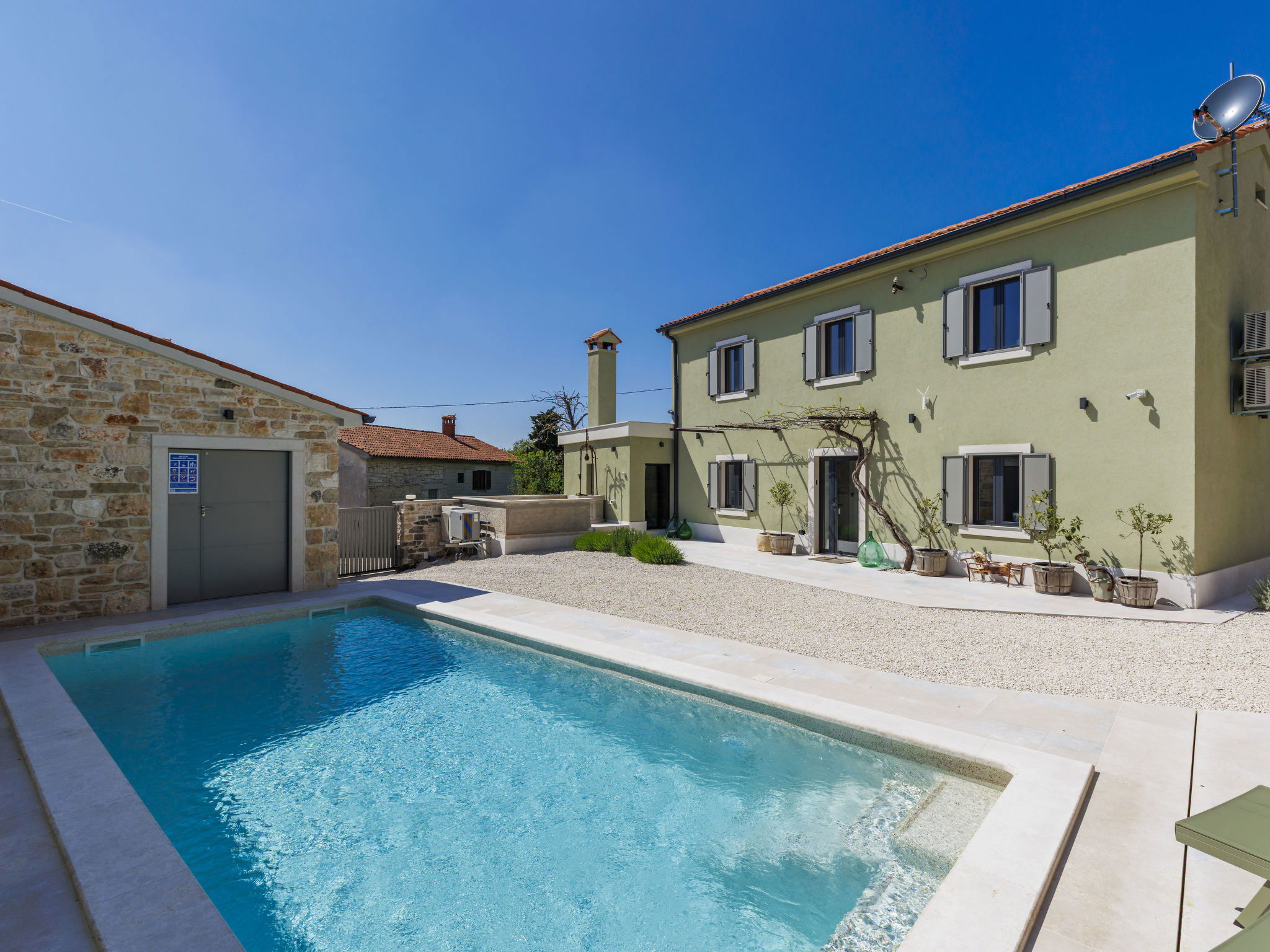 Belle maison "La Gioia", de 2 étages. Dans le hameau de Rudani, à 7 km du centre de Žminj, à 20 km de la mer. A usage privé: terrain 750 m2 (clôturé), piscine rectangulaire, chauffée (7 x 3 m, profondeur 140 cm, disponibilité saisonnière: 01.Avr. - 01.Nov.) avec marches intérieures et systeme d'électolyseur au sel. Douche extérieure, terrasse (20 m2), meubles de jardin, barbecue. Infrastructures de la Maison: accès internet, air-conditionné, lave-linge. Place de parking près de la maison sur le terrain. Borne de recharge électrique. Supermarché 9 km, café 7 km, cyber café 7 km, arrêt de bus 10 km, plage de graviers 20 km. Le propriétaire n'accepte pas les groupes de jeunes. Veuillez noter: Aéroport 32 km de la maison. L'unité comprend 2 maisons louées ensemble. Piscine chauffée (en sus). Si vous souhaitez que la piscine soit chauffée, veuillez le notifier 7 jours à l'avance.