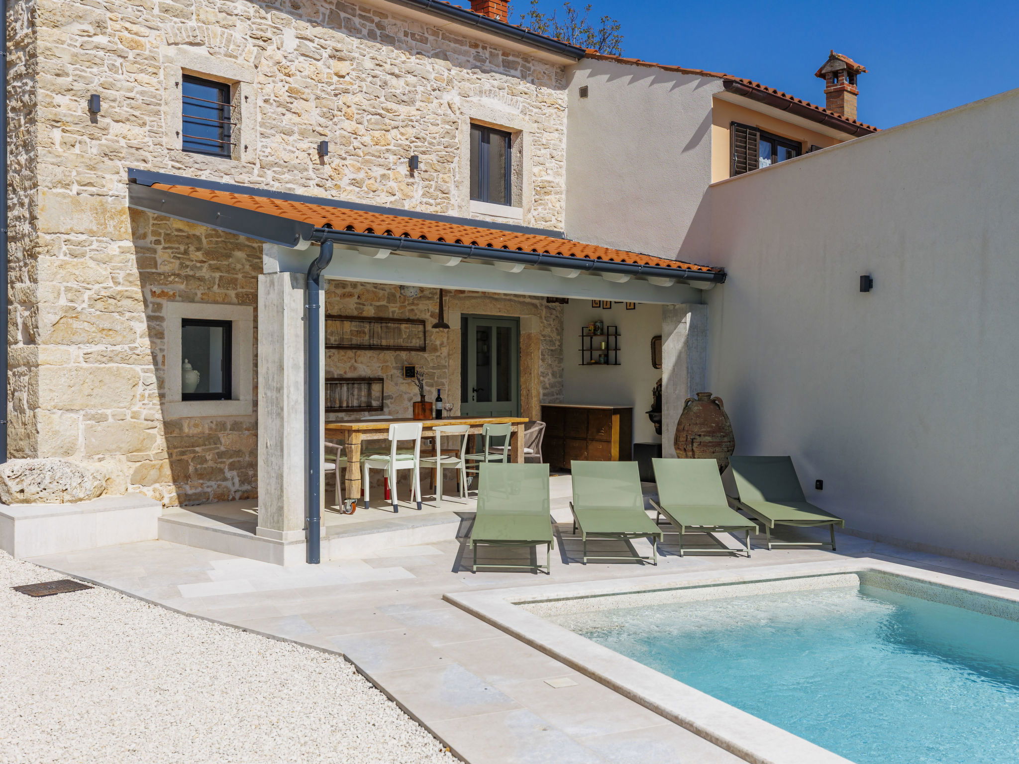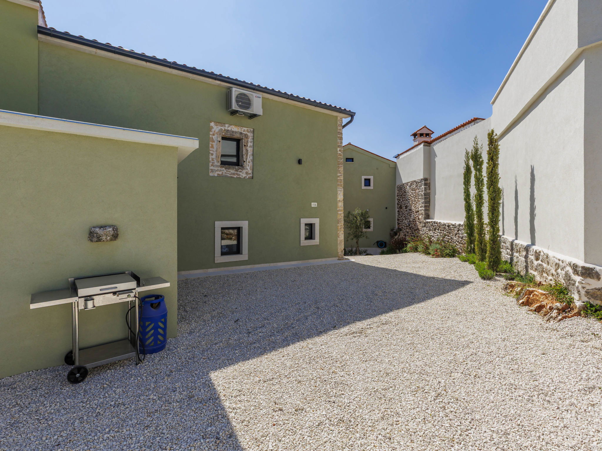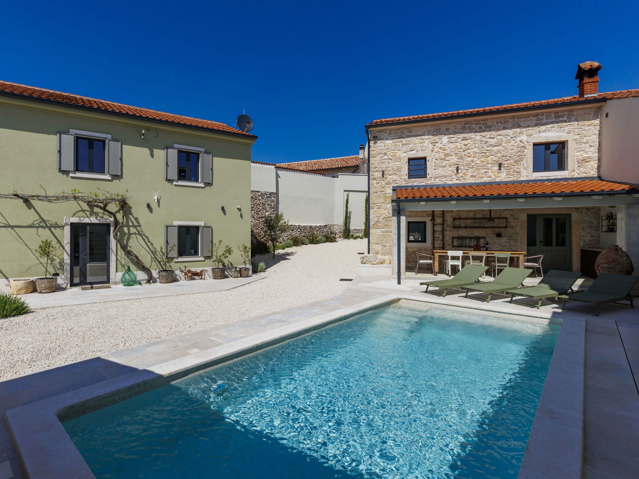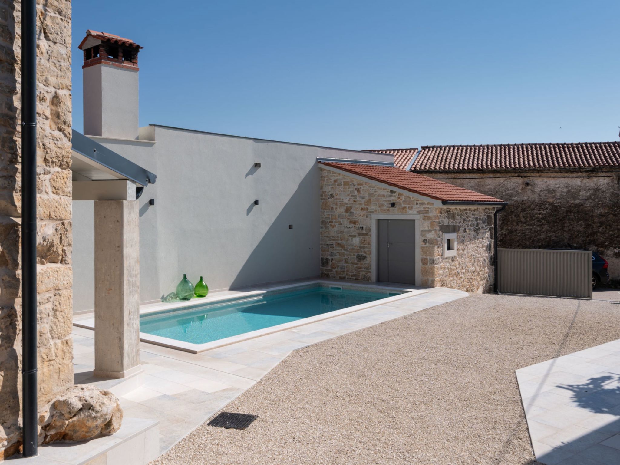Belle maison "La Gioia", de 2 étages. Dans le hameau de Rudani, à 7 km du centre de Žminj, à 20 km de la mer. A usage privé: terrain 750 m2 (clôturé), piscine rectangulaire, chauffée (7 x 3 m, profondeur 140 cm, disponibilité saisonnière: 01.Avr. - 01.Nov.) avec marches intérieures et systeme d'électolyseur au sel. Douche extérieure, terrasse (20 m2), meubles de jardin, barbecue. Infrastructures de la Maison: accès internet, air-conditionné, lave-linge. Place de parking près de la maison sur le terrain. Borne de recharge électrique. Supermarché 9 km, café 7 km, cyber café 7 km, arrêt de bus 10 km, plage de graviers 20 km. Le propriétaire n'accepte pas les groupes de jeunes. Veuillez noter: Aéroport 32 km de la maison. L'unité comprend 2 maisons louées ensemble. Piscine chauffée (en sus). Si vous souhaitez que la piscine soit chauffée, veuillez le notifier 7 jours à l'avance.