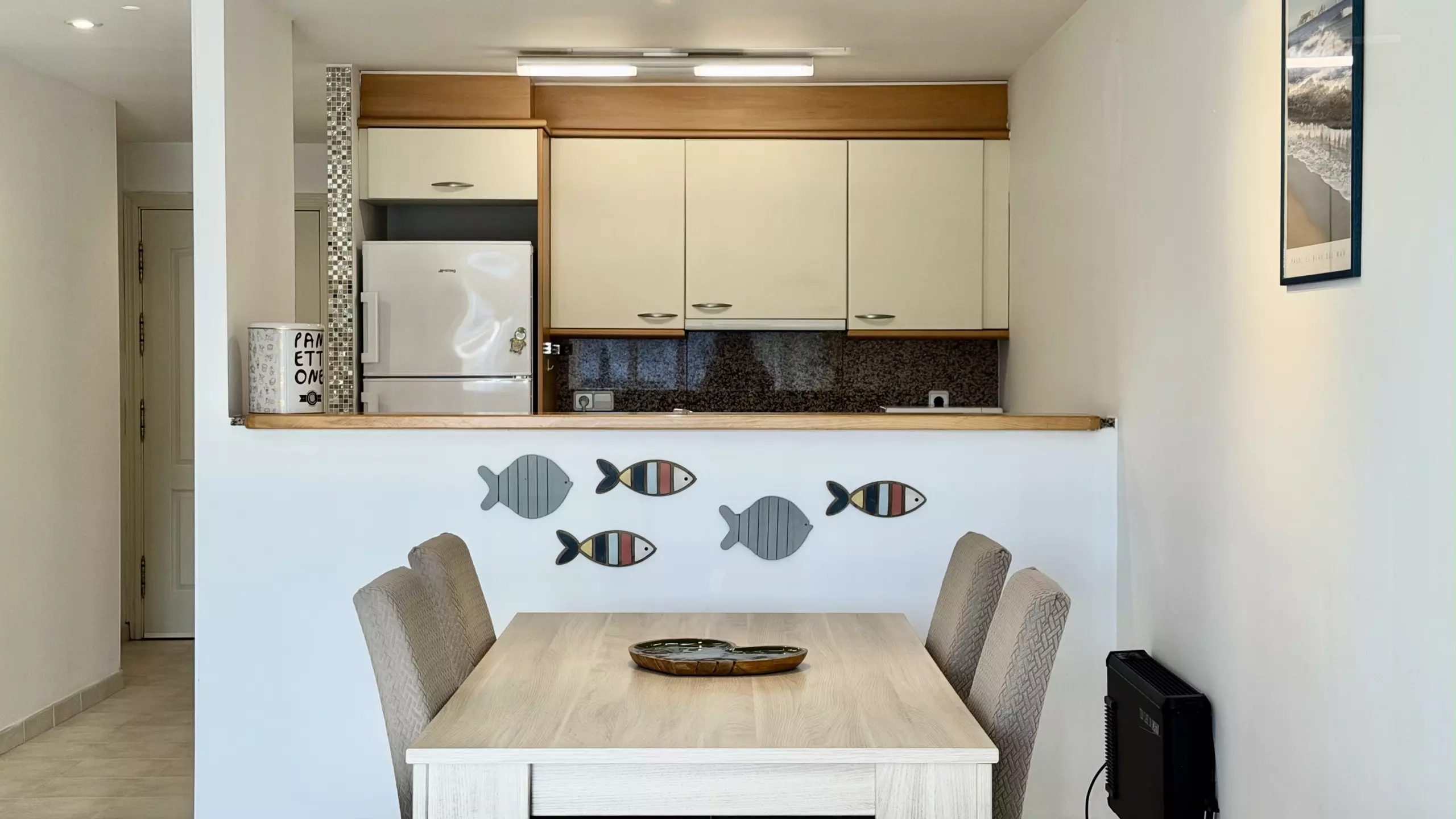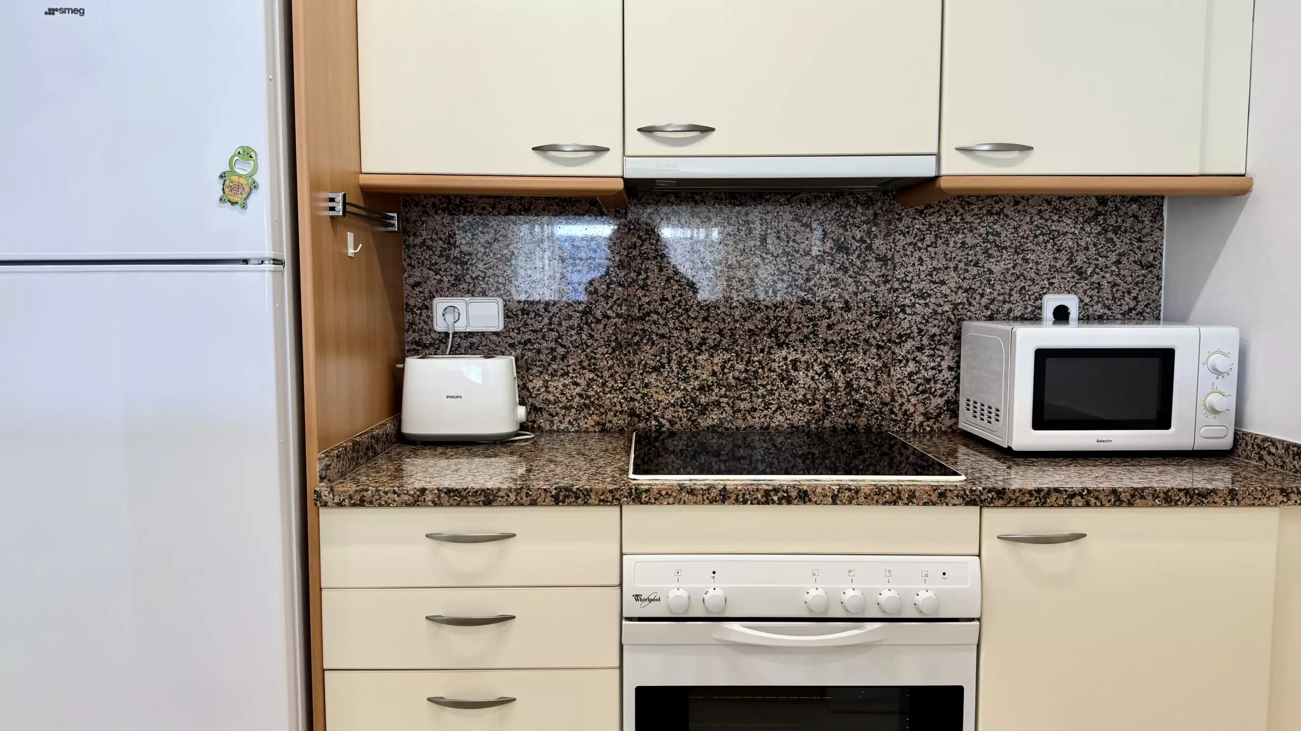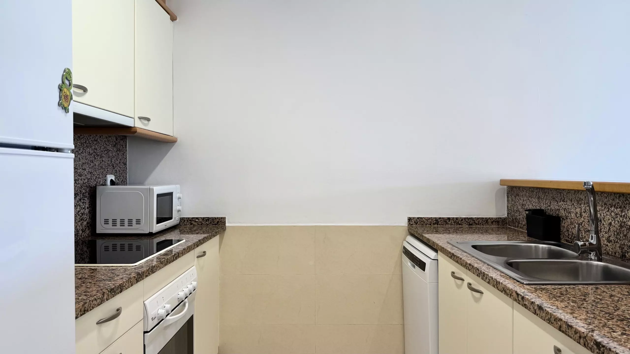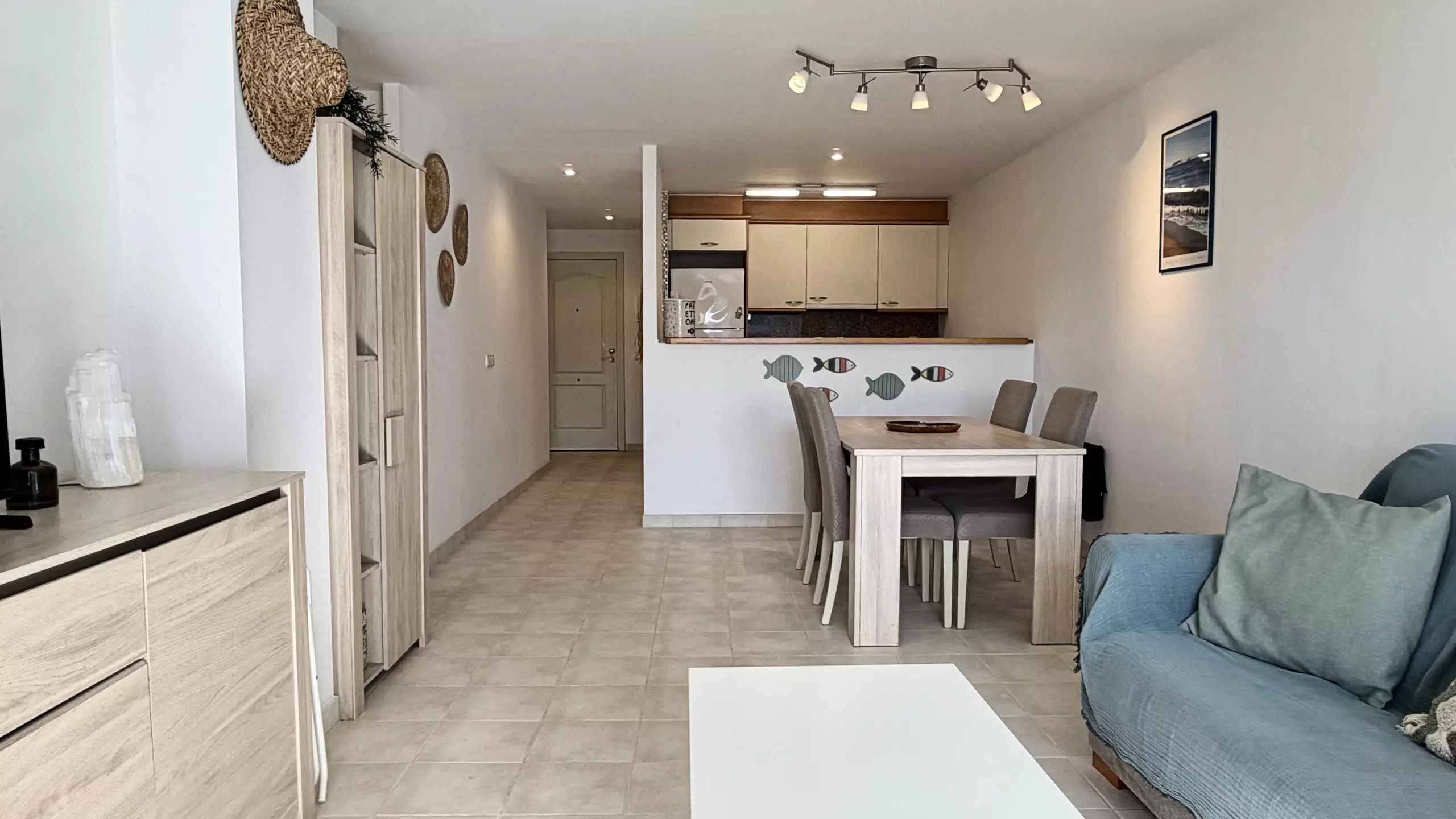 La cuisine américaine est entièrement équipée d'appareils électroménagers modernes, y compris un lave-linge, un lave-vaisselle, un four, un micro-ondes, un grille-pain et une machine à café. Elle dispose d'un réfrigérateur et d'un congélateur pour maintenir les aliments frais pendant le séjour. L'appartement offre 3 lits : un lit double et deux lits individuels, s'adaptant parfaitement aux différentes configurations familiales.