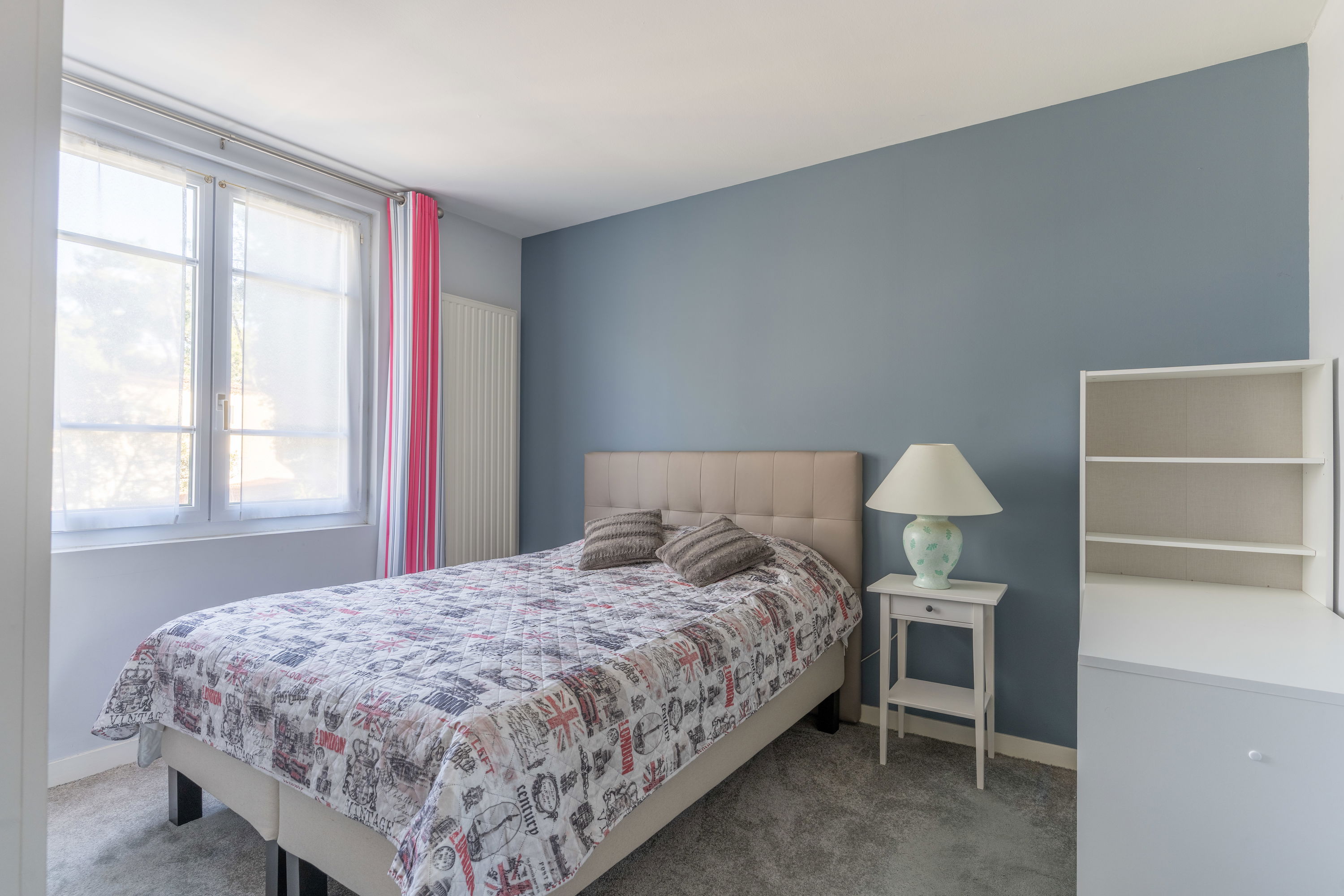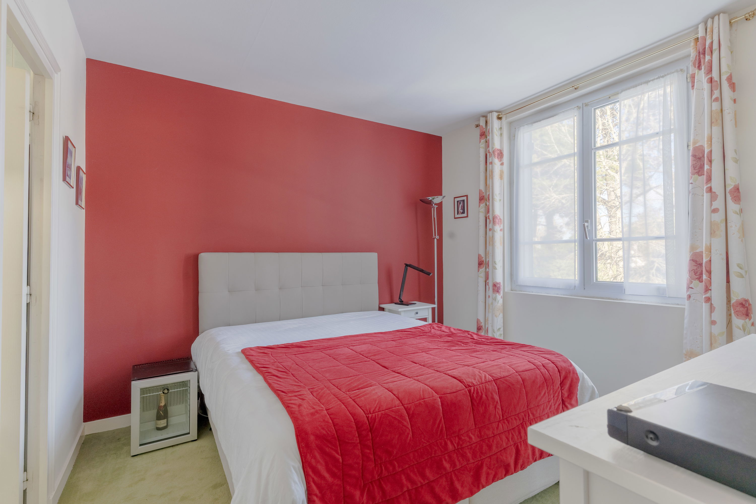 Chambre 1 : lit 160x200, placard, bureau, vue jardin/piscine
