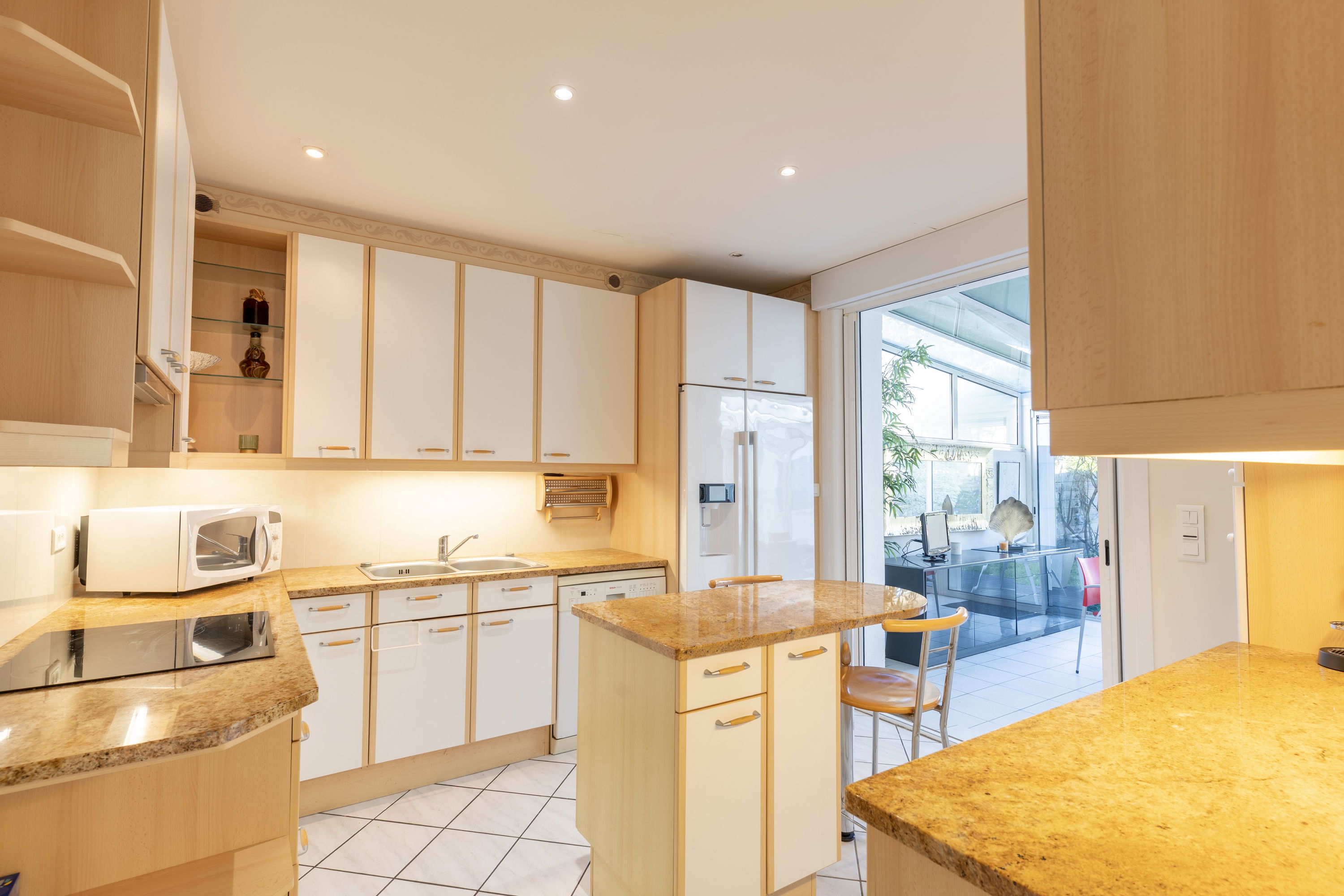La cuisine s’ouvre sur une grande véranda de 26 m² avec espace repas, donnant directement sur le jardin et la piscine.