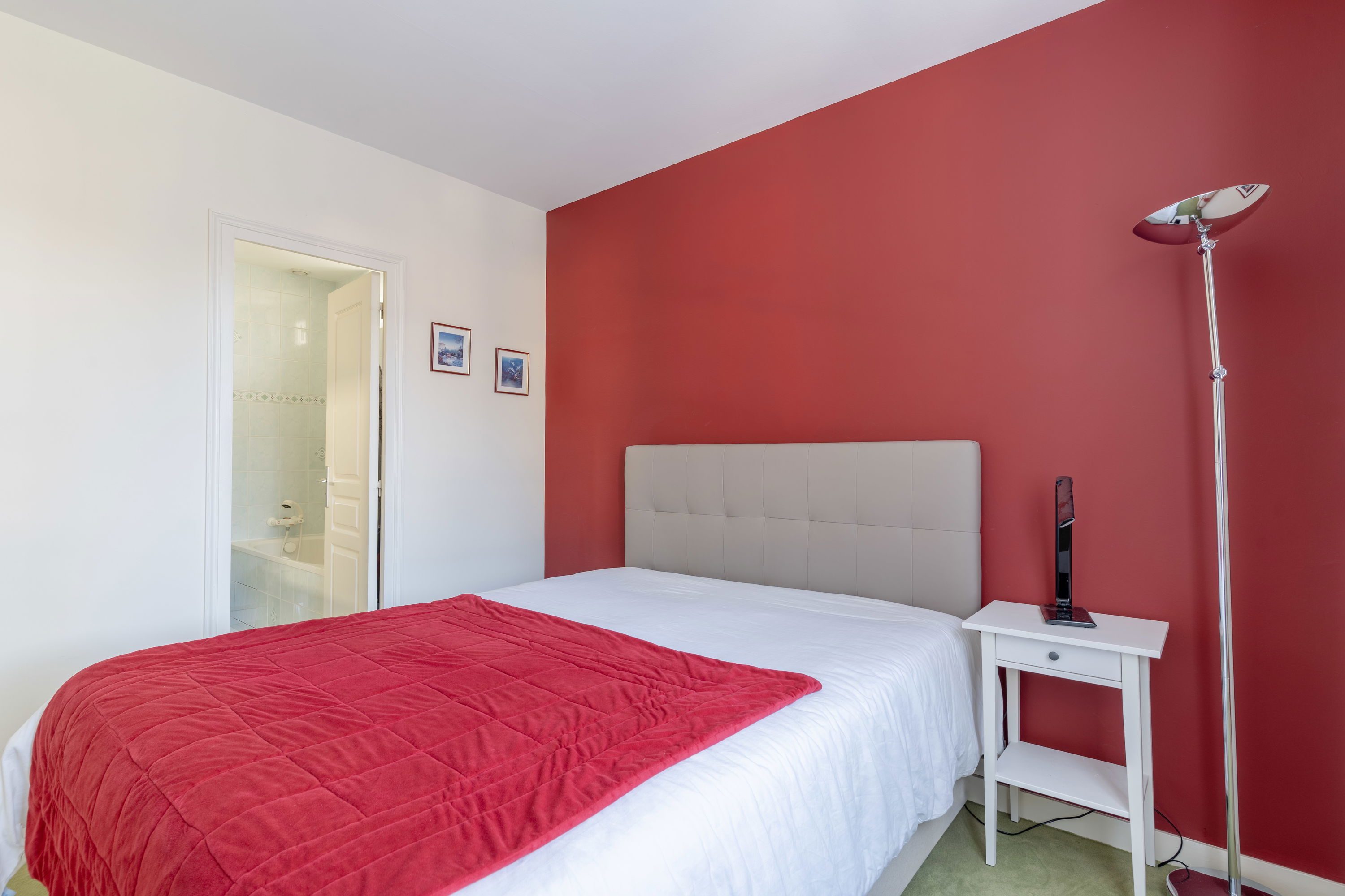 Chambre 2 (suite) : lit 160x200, rangements, salle de bain privative (baignoire + douche)
