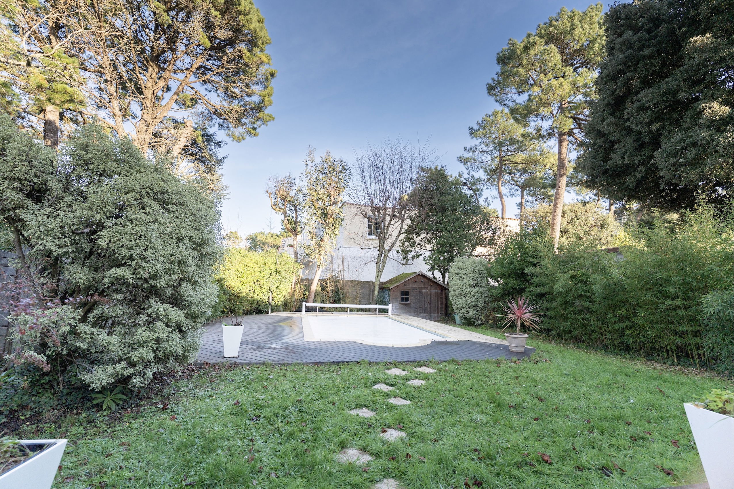 Implantée sur un terrain clos de 474 m² sans vis-à-vis à l’arrière, la villa dispose d’un jardin agréable avec piscine chauffée (7 x 3,5 m) sécurisée par rideau et alarme — parfaite pour des vacances en famille.