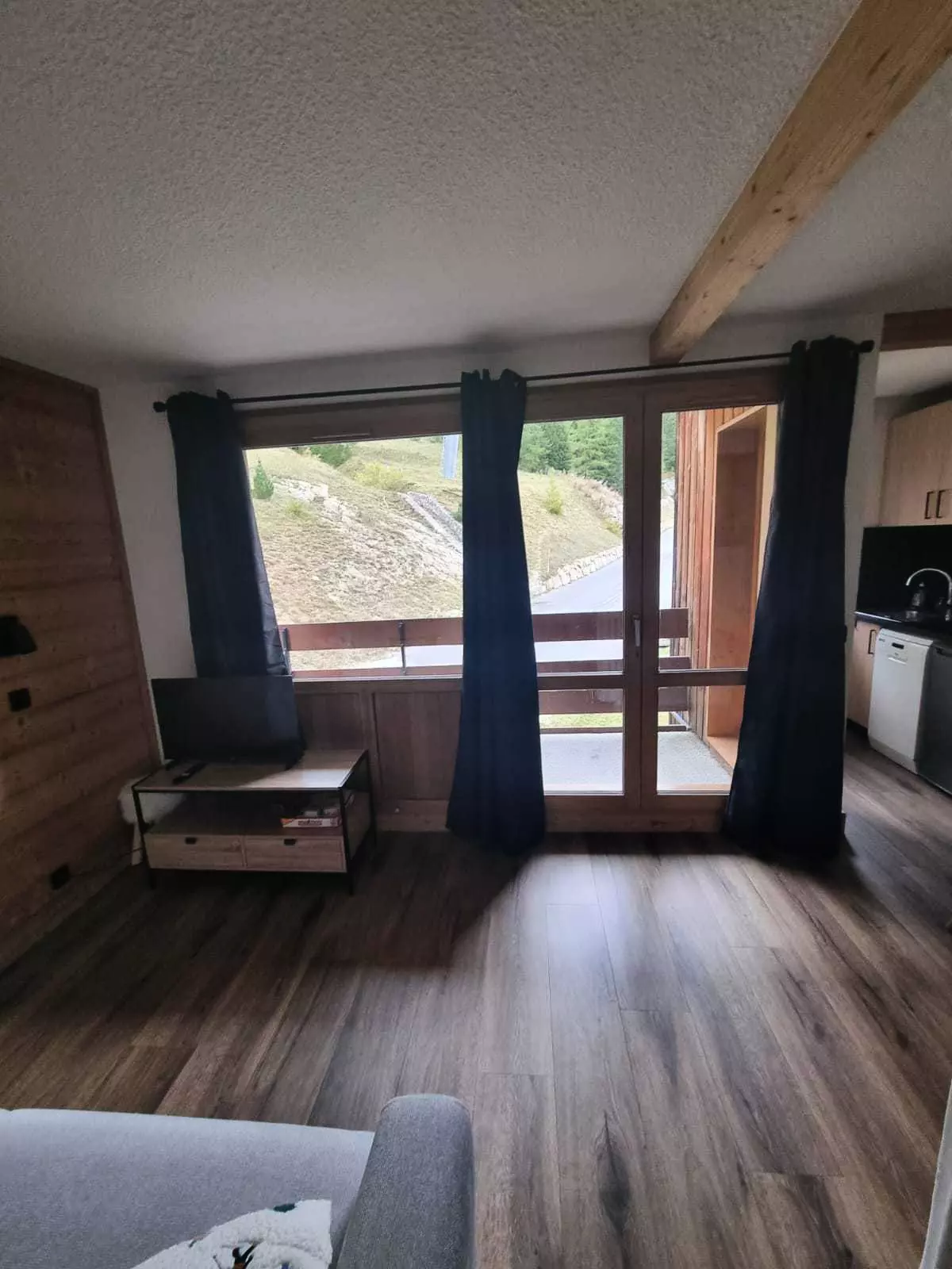 Il est situé au sud est et au 4ème étage avec un balcon (vue pistes et vue sur la route de Belle Plagne).