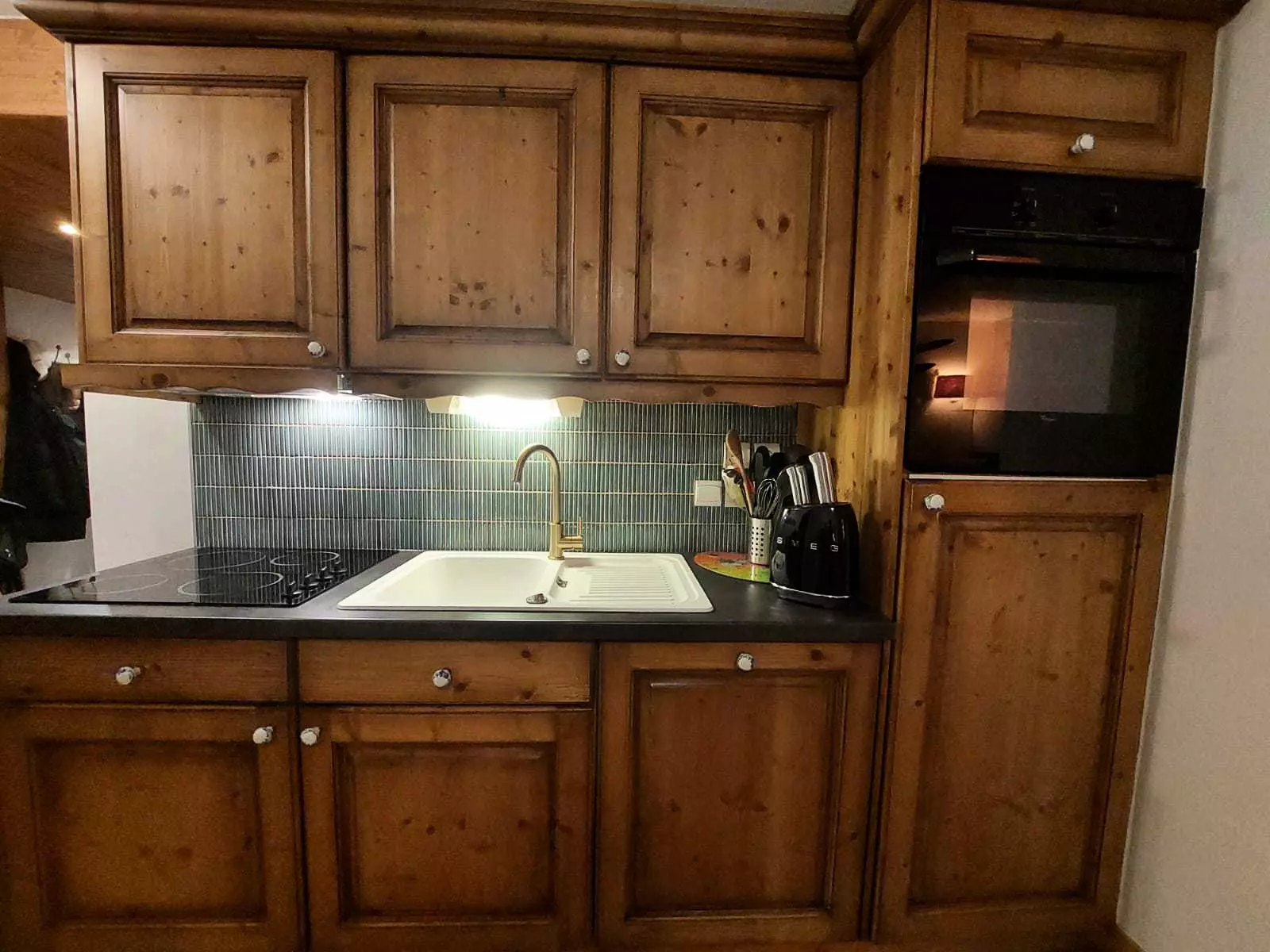 Cuisine ouverte avec 4 plaques vitrocéramiques, un four, un micro-ondes, un lave-vaisselle et un grand frigo.