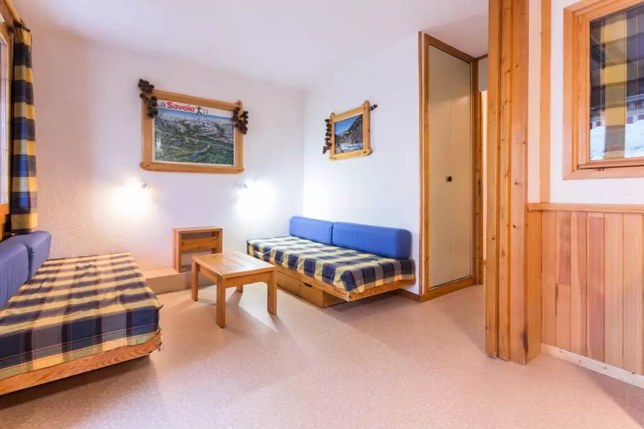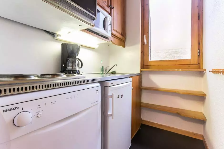 Ce studio cabine en rez de neige à proximité des pistes se compose d'une kitchenette équipée (de plaques électriques, cafetière, four, micro-ondes, lave-vaisselle, grille-pain et bouilloire), d'une salle de bain baignoire rénovée et wc séparé. Dans la salle à manger vous avez à votre disposition deux lits simples. Le coin cabine dispose d'un ensemble lits superposés (interdit aux enfants de moins de 6 ans) et d'un lit simple. Le séjour donne sur une petite terrasse exposée sud.