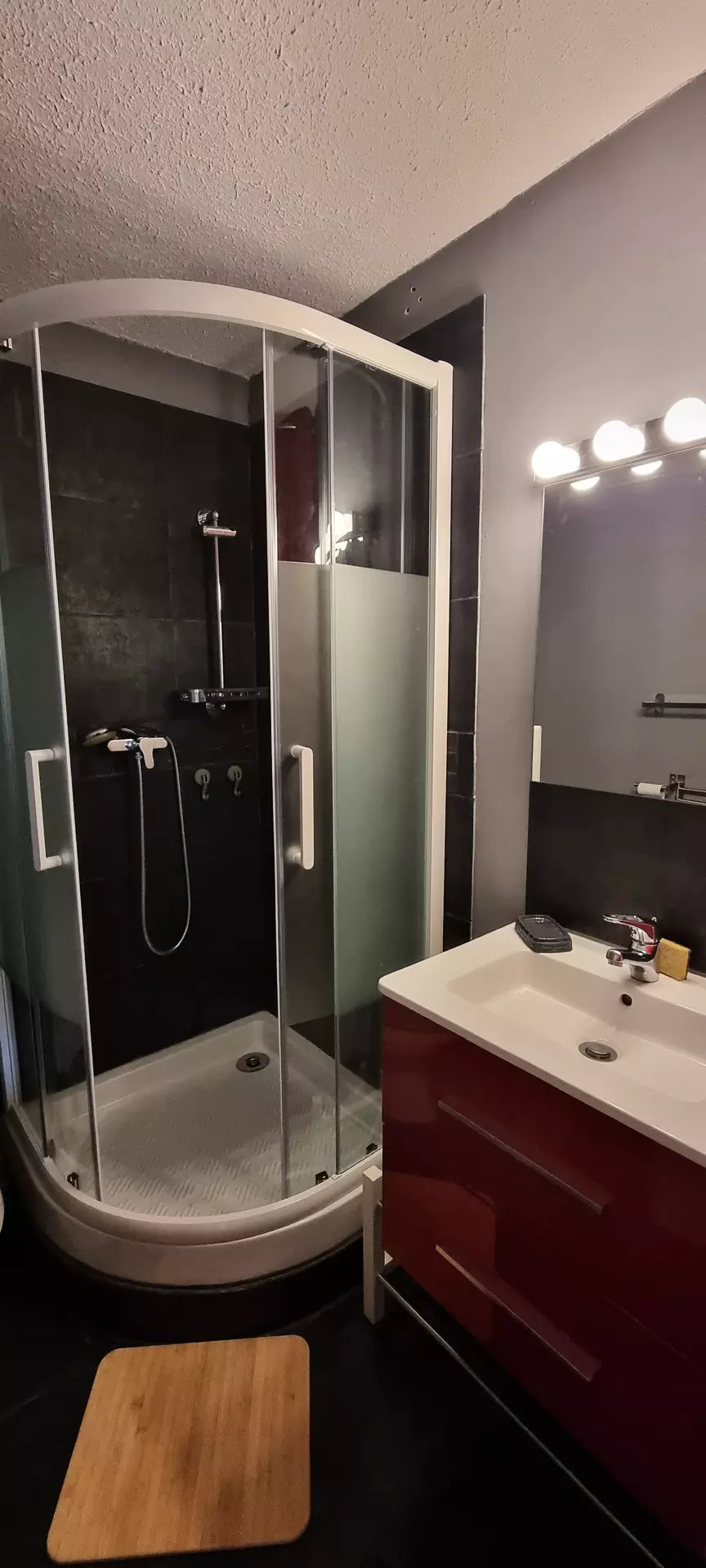Salle de bain avec cabine de douche et WC.
