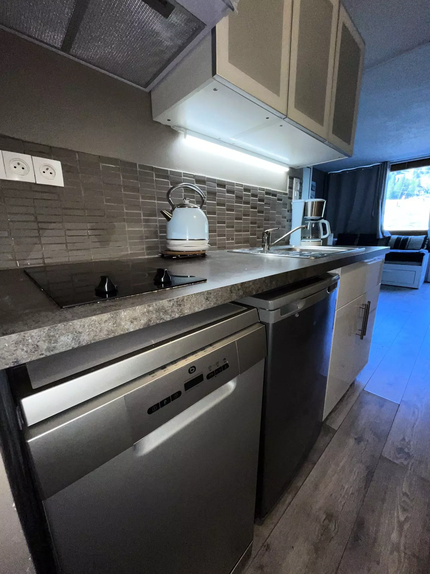 La cuisine ouverte sur le séjour est équipée de plaques vitrocéramiques, d'une hotte, d'un réfrigérateur, d'un micro-ondes, d'un lave vaisselle.