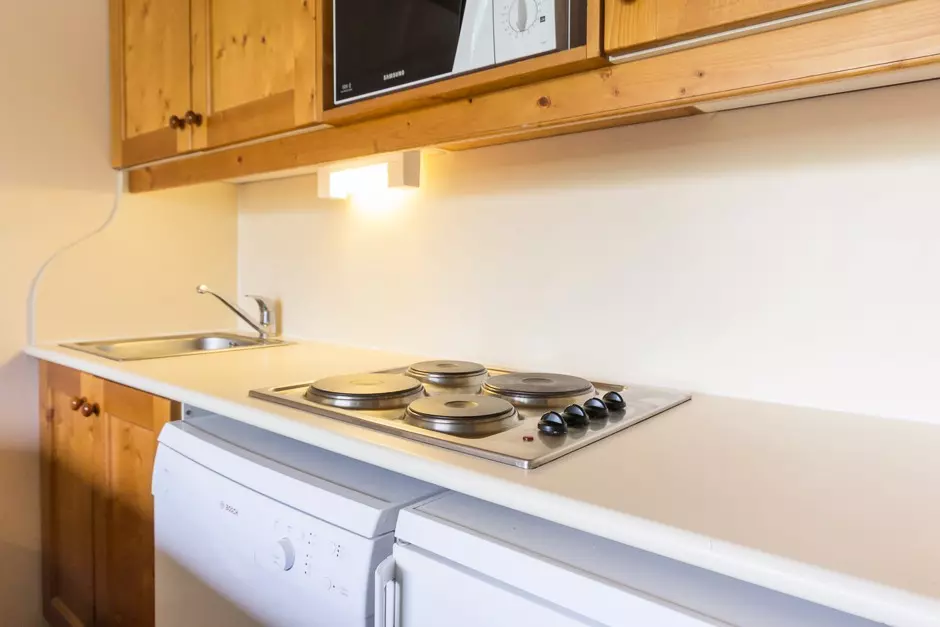 Pour votre confort la cuisine ouverte sur le séjour, est équipée de 4 plaques électrique, 1 réfrigérateur, 1 micro-ondes et 1 lave-vaisselle.