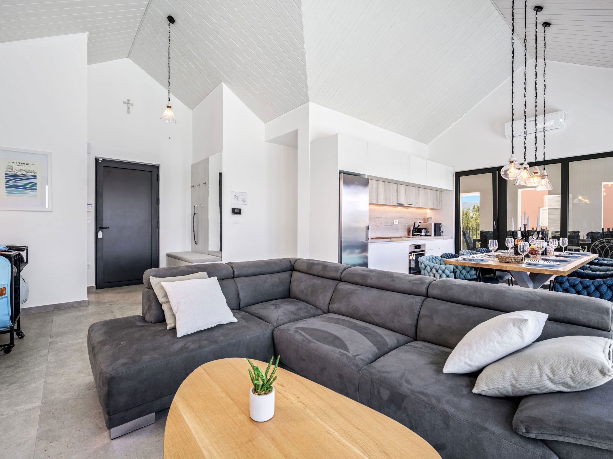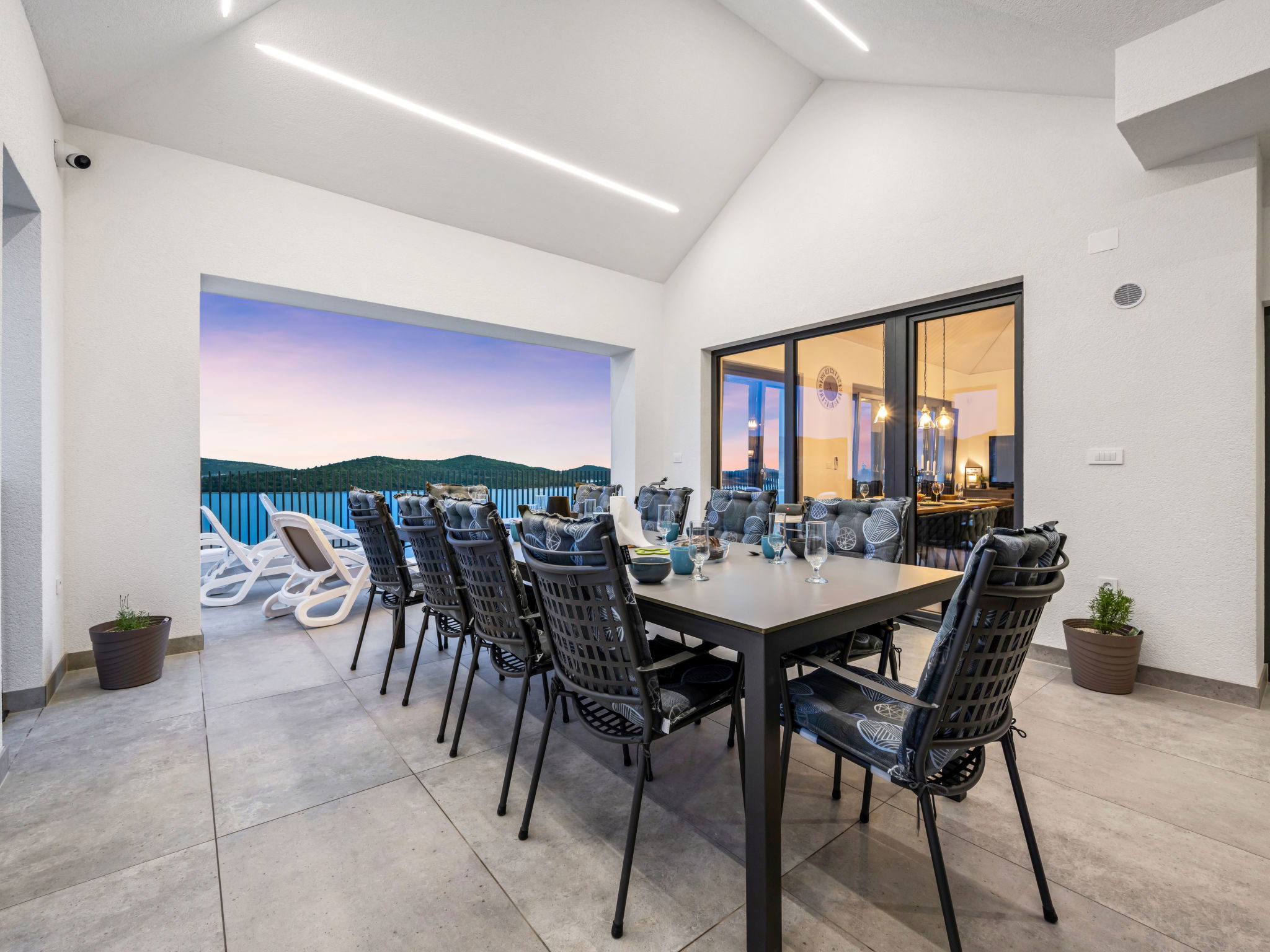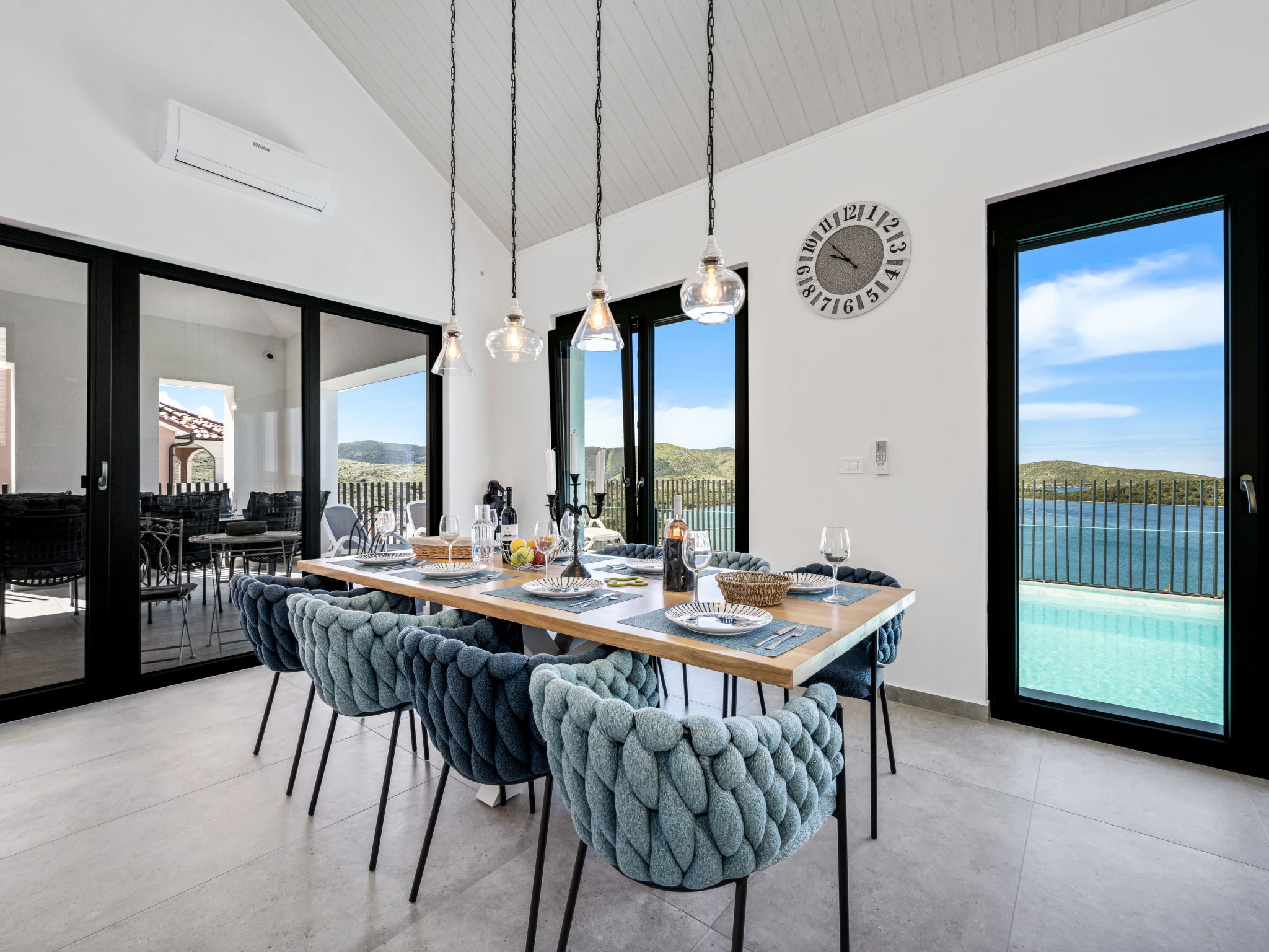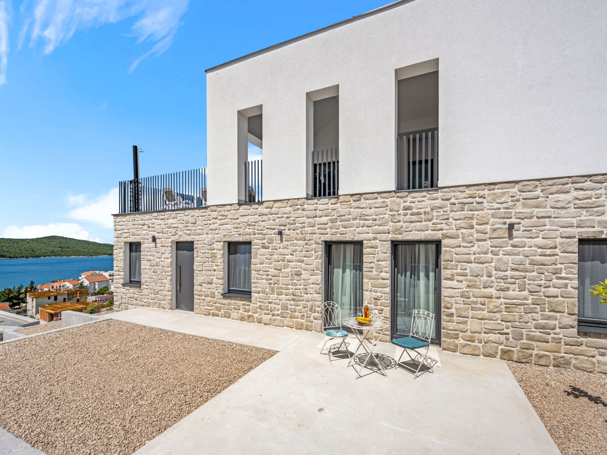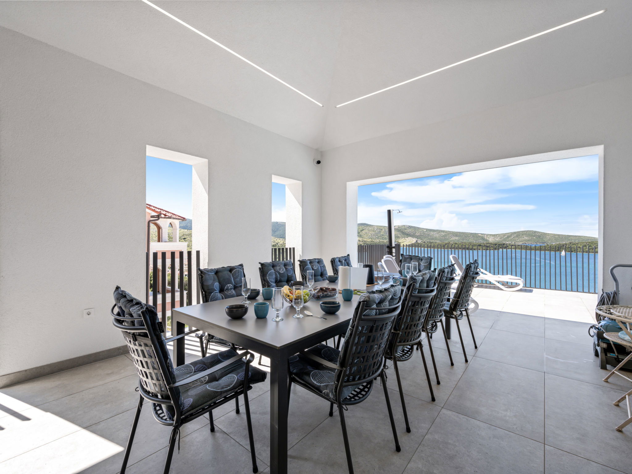 Villa 5 pièces 260 m2. Séjour/salle à manger avec TV (satellite) et air-conditionné. Sortie sur la terrasse. 2 chambres, chaque chambre avec: 1 grand-lit (180 cm, longueur 200 cm), douche/WC, TV (satellite) et air-conditionné. Sortie sur la terrasse. 2 chambres, chaque chambre avec: 2 lits (90 cm, longueur 200 cm), TV (satellite) et air-conditionné. Sortie sur la terrasse. Cuisine ouverte (four, lave-vaisselle, 4 plaques à induction, grille-pain, bouilloire électrique, micro-ondes, congélateur, cafetière électrique). WC séparé. Chauffage par le sol, chauffage à air chaud. Terrasse 20 m2. Meubles de terrasse, chaises longues (4). Vue sur la mer. A disposition: coffre-fort, fer à repasser, moustiquaire, chaise haute pour enfant, lit bébé, sèche-cheveux. Internet (Connexion WIFI, gratuit). Veuillez noter: maximum 2 animaux/ chiens autorisés. Extincteur.