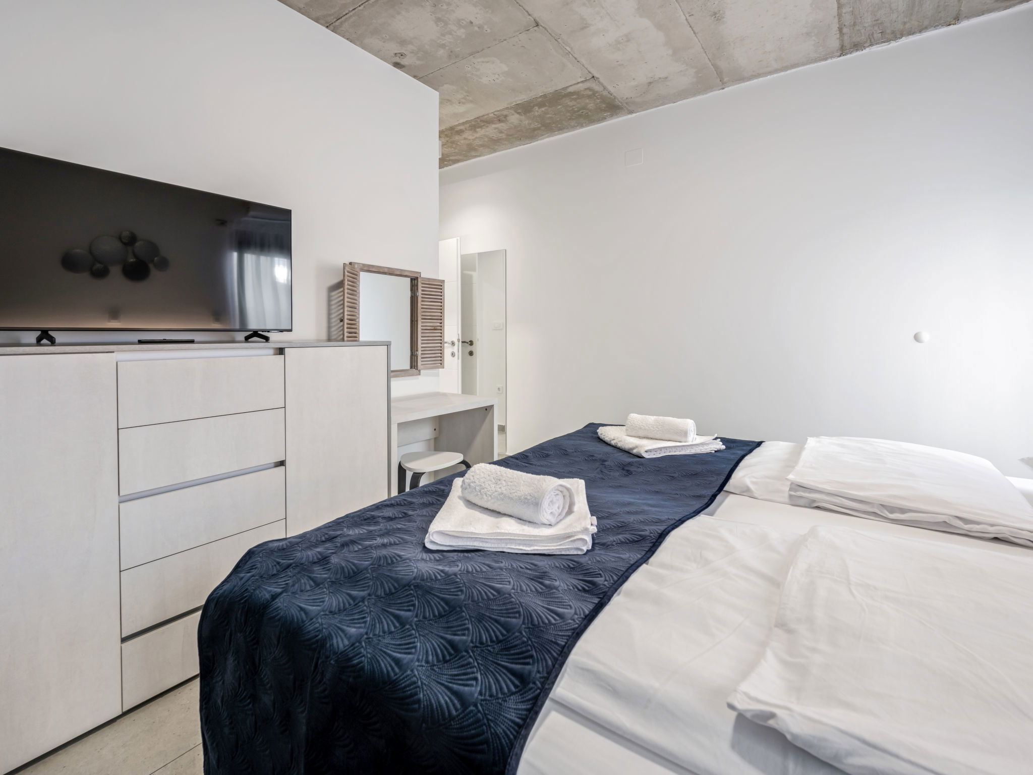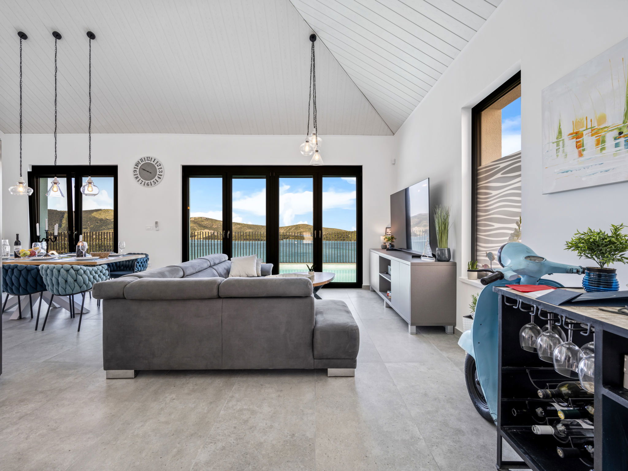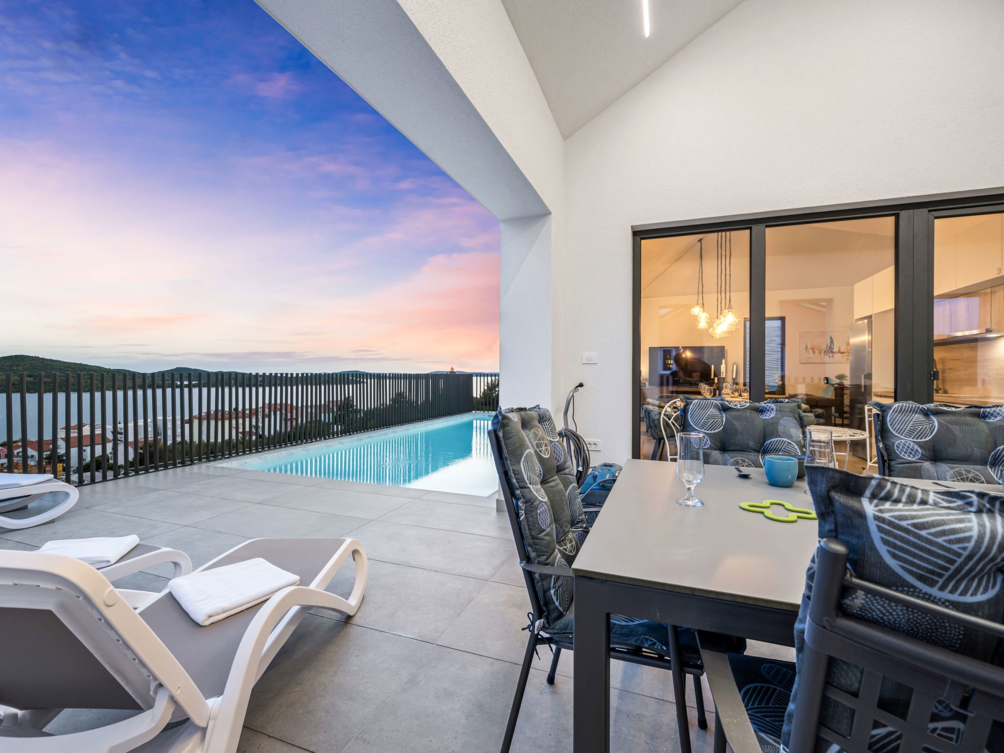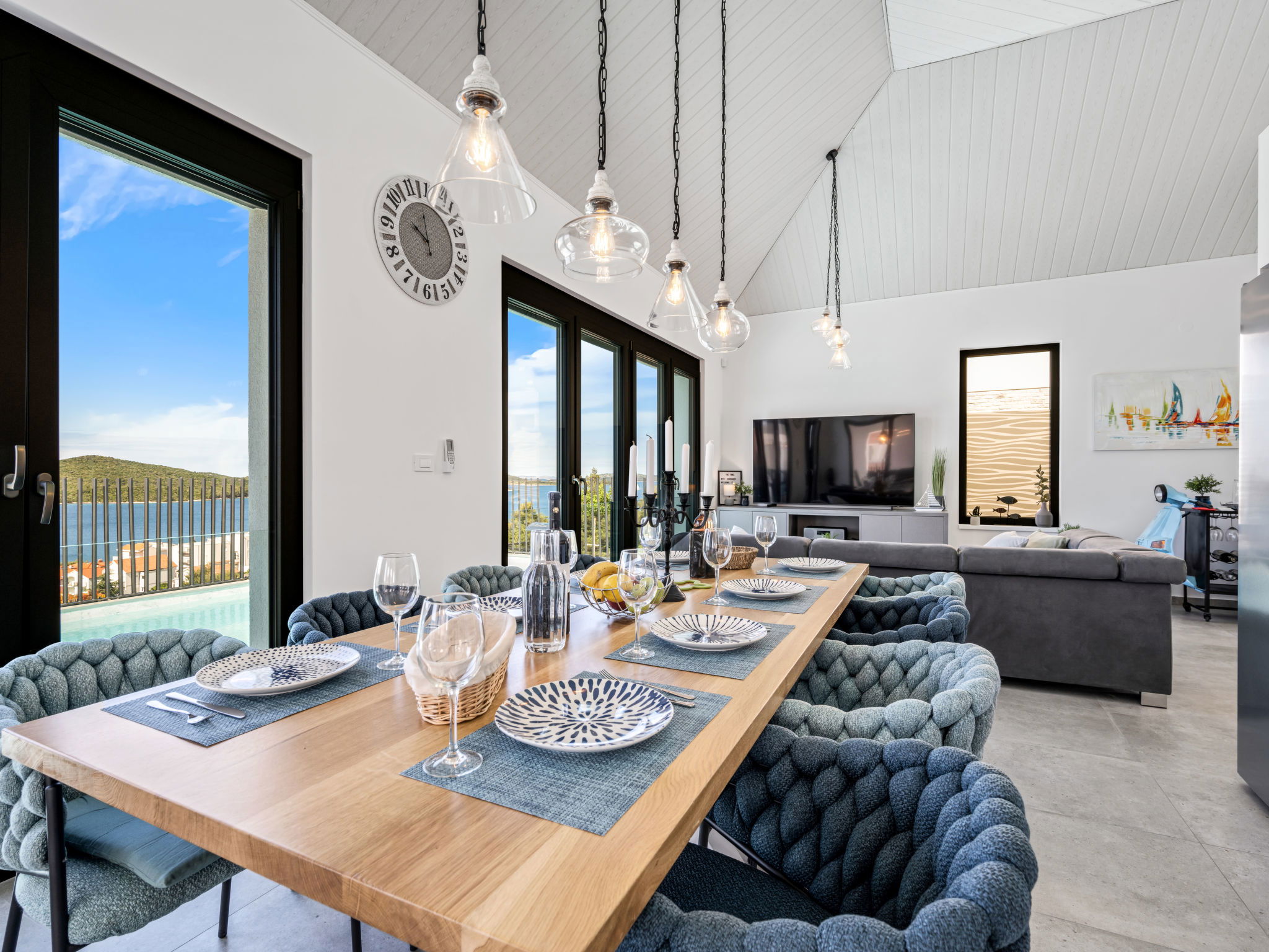 Villa 5 pièces 260 m2. Séjour/salle à manger avec TV (satellite) et air-conditionné. Sortie sur la terrasse. 2 chambres, chaque chambre avec: 1 grand-lit (180 cm, longueur 200 cm), douche/WC, TV (satellite) et air-conditionné. Sortie sur la terrasse. 2 chambres, chaque chambre avec: 2 lits (90 cm, longueur 200 cm), TV (satellite) et air-conditionné. Sortie sur la terrasse. Cuisine ouverte (four, lave-vaisselle, 4 plaques à induction, grille-pain, bouilloire électrique, micro-ondes, congélateur, cafetière électrique). WC séparé. Chauffage par le sol, chauffage à air chaud. Terrasse 20 m2. Meubles de terrasse, chaises longues (4). Vue sur la mer. A disposition: coffre-fort, fer à repasser, moustiquaire, chaise haute pour enfant, lit bébé, sèche-cheveux. Internet (Connexion WIFI, gratuit). Veuillez noter: maximum 2 animaux/ chiens autorisés. Extincteur.