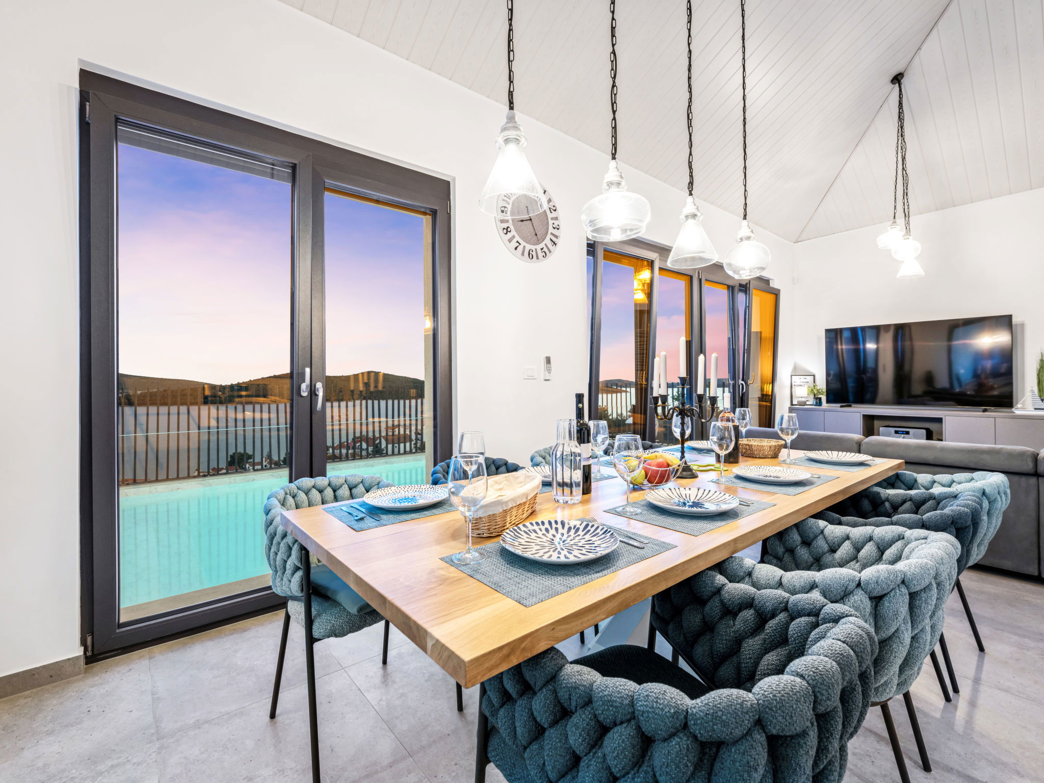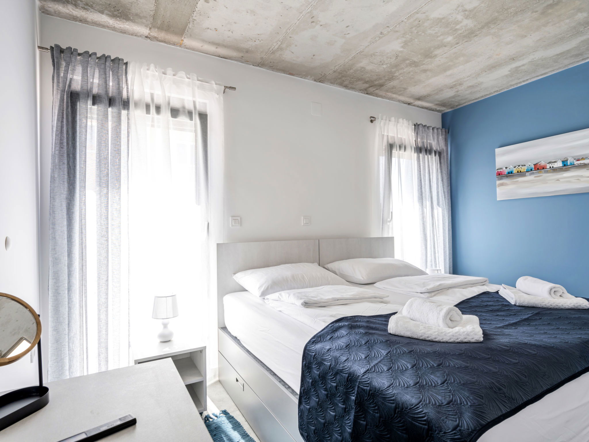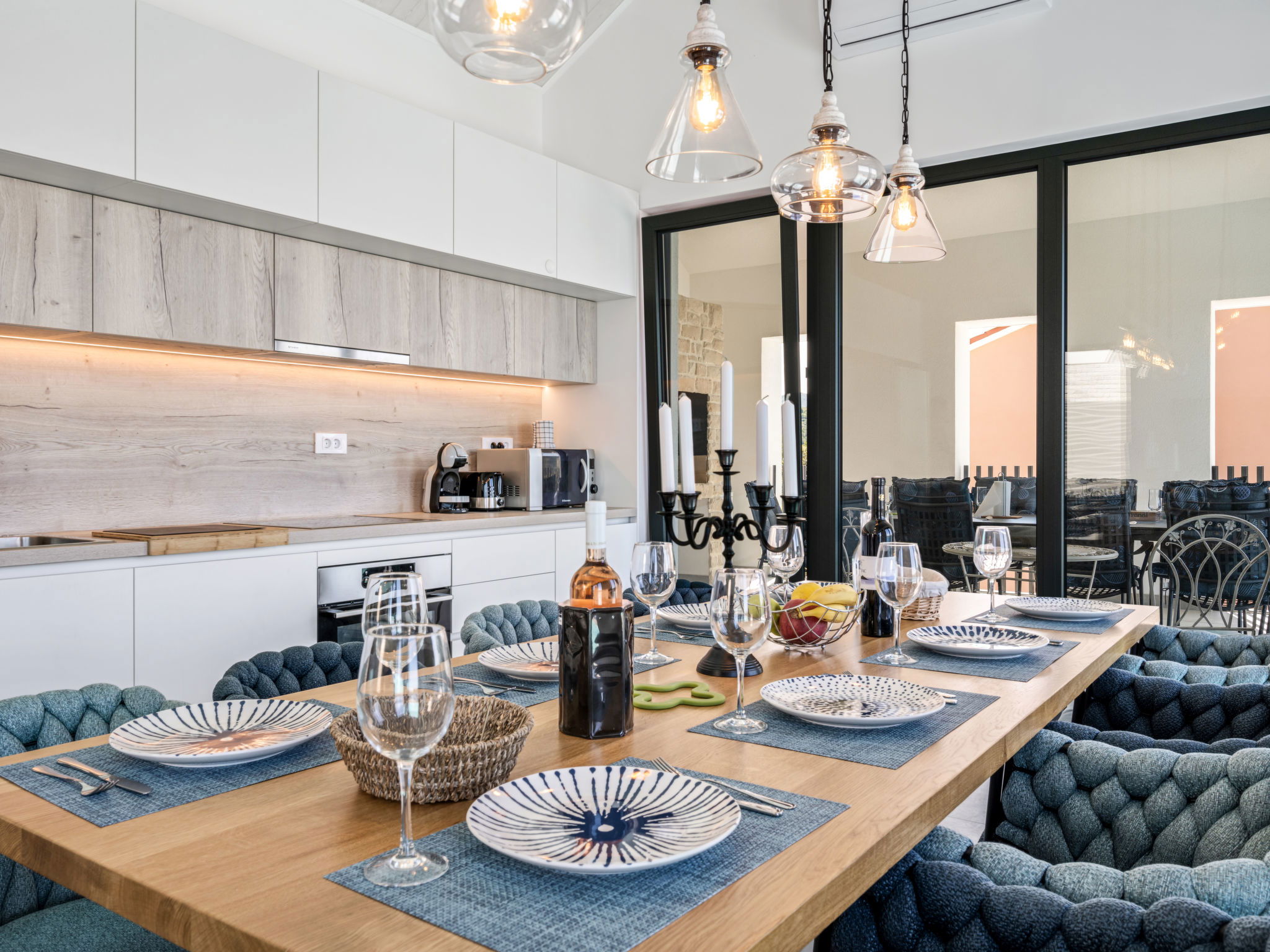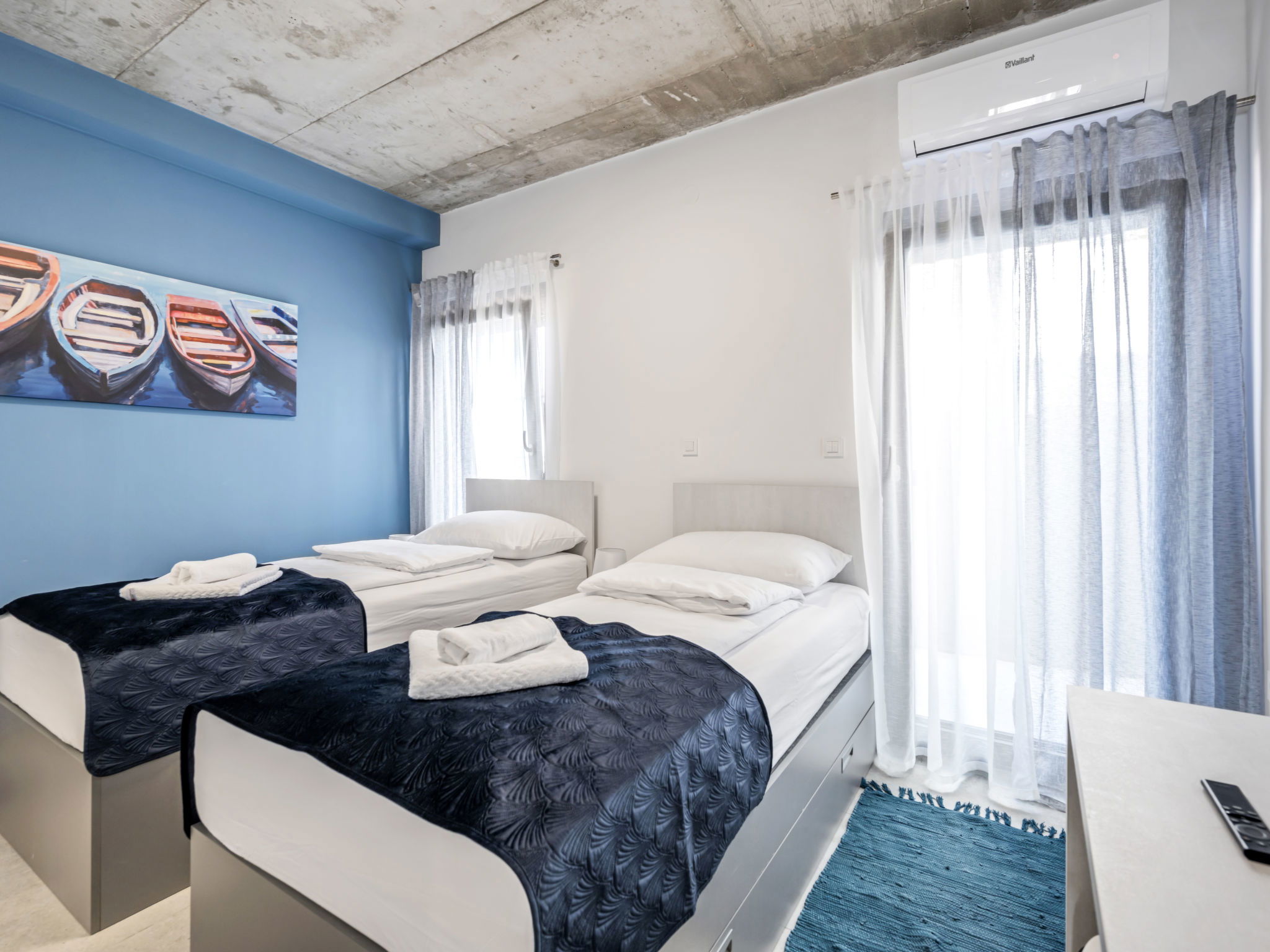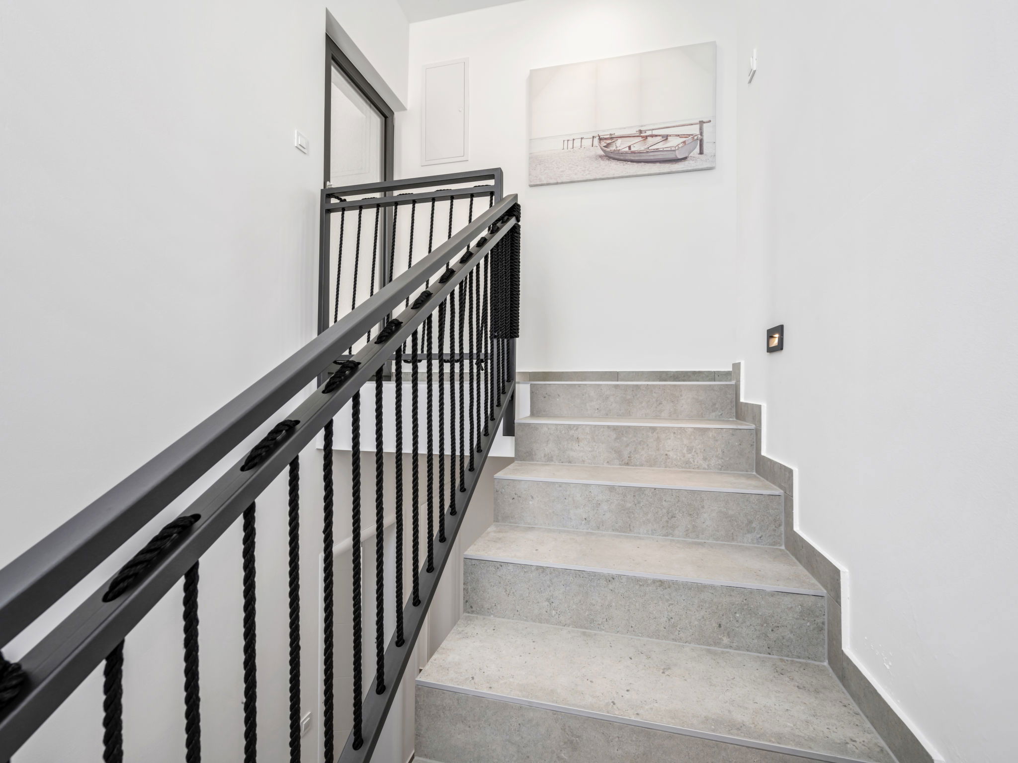 Villa 5 pièces 260 m2. Séjour/salle à manger avec TV (satellite) et air-conditionné. Sortie sur la terrasse. 2 chambres, chaque chambre avec: 1 grand-lit (180 cm, longueur 200 cm), douche/WC, TV (satellite) et air-conditionné. Sortie sur la terrasse. 2 chambres, chaque chambre avec: 2 lits (90 cm, longueur 200 cm), TV (satellite) et air-conditionné. Sortie sur la terrasse. Cuisine ouverte (four, lave-vaisselle, 4 plaques à induction, grille-pain, bouilloire électrique, micro-ondes, congélateur, cafetière électrique). WC séparé. Chauffage par le sol, chauffage à air chaud. Terrasse 20 m2. Meubles de terrasse, chaises longues (4). Vue sur la mer. A disposition: coffre-fort, fer à repasser, moustiquaire, chaise haute pour enfant, lit bébé, sèche-cheveux. Internet (Connexion WIFI, gratuit). Veuillez noter: maximum 2 animaux/ chiens autorisés. Extincteur.