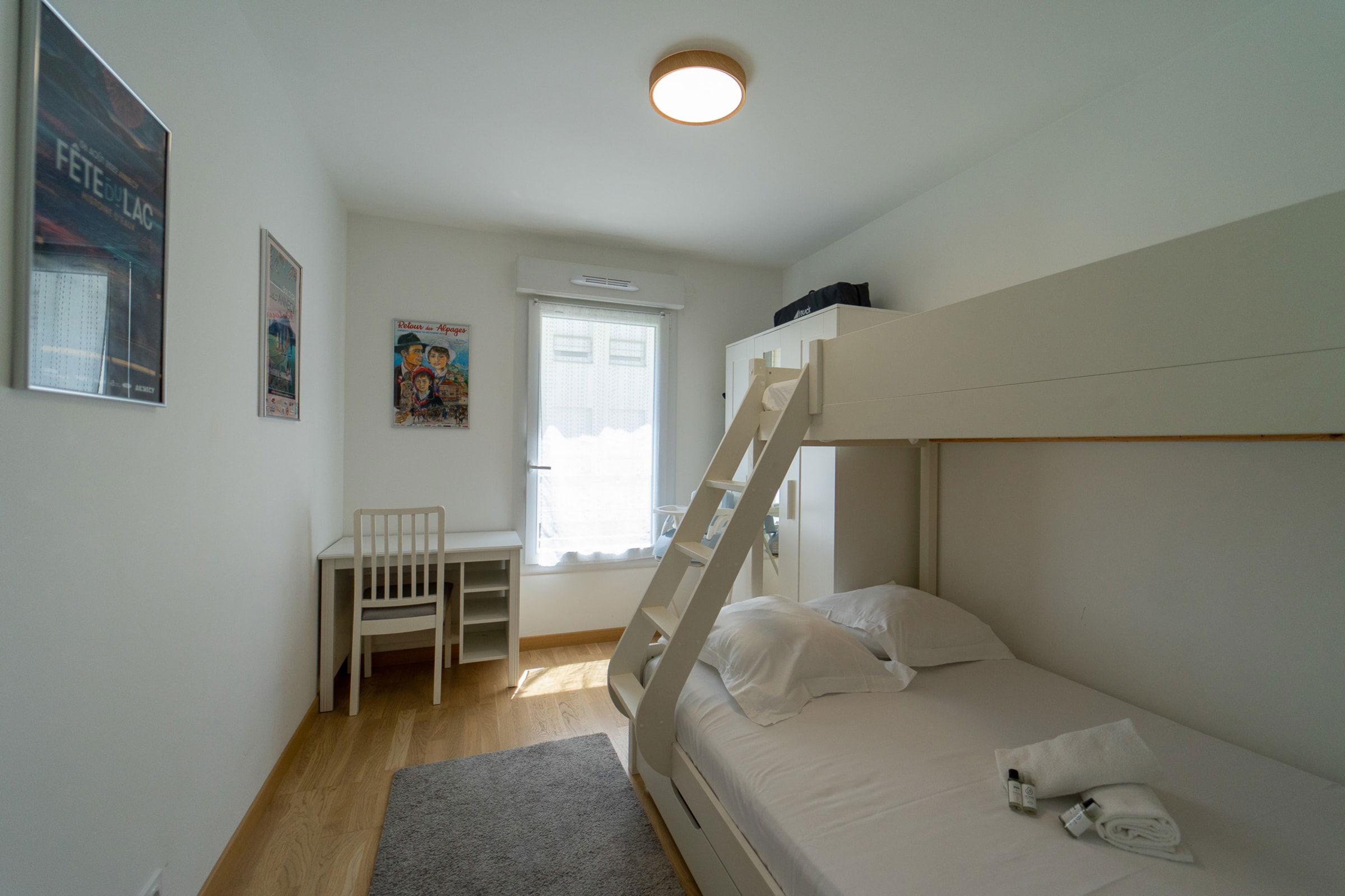 La deuxième chambre possède un lit double 140x200cm et un lit simple 90x200cm surélevé, ainsi qu’un grand placard.