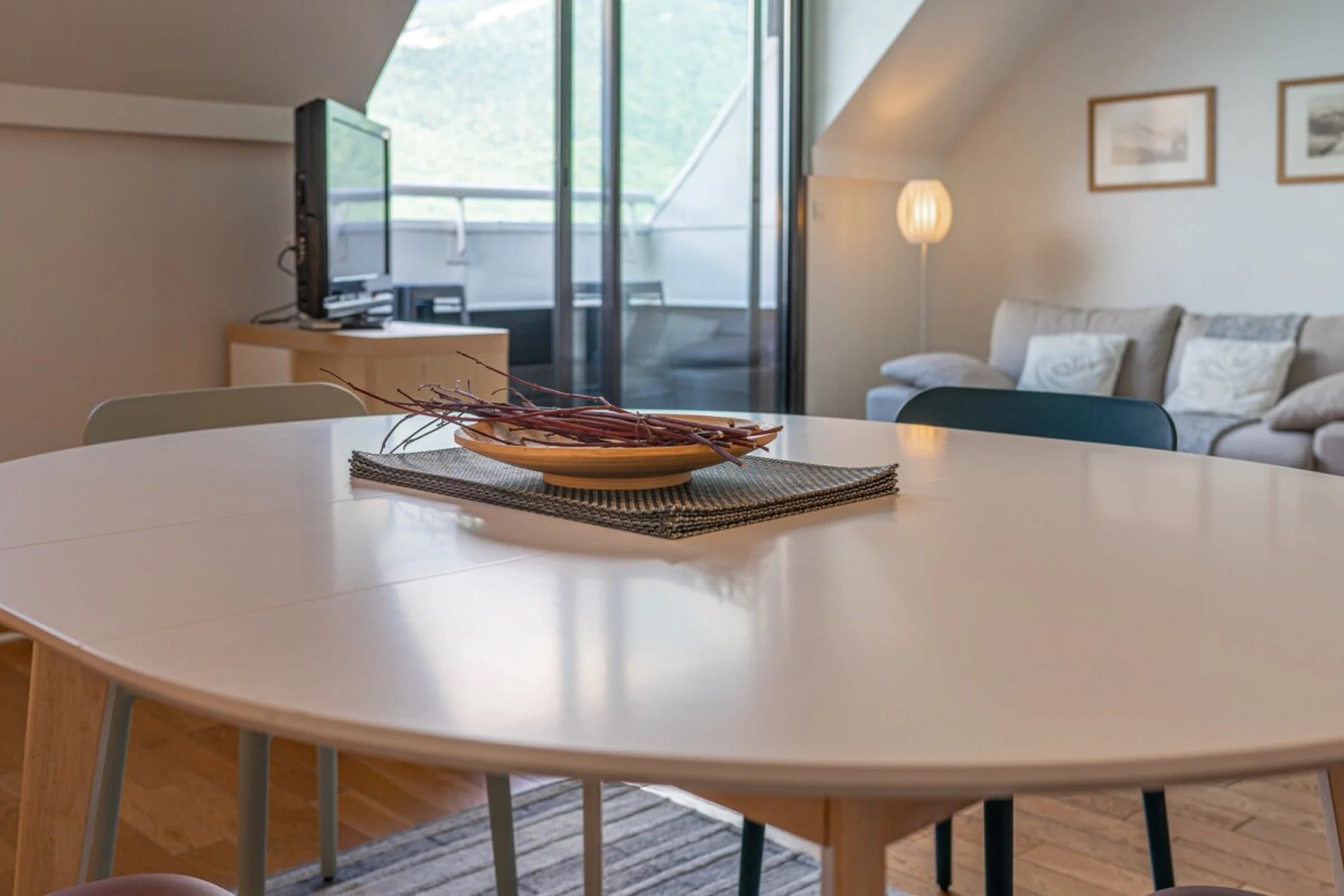 Cet appartement est un duplex, au niveau zéro vous trouverez une grand salon/séjour avec balcon sur le lac, une vaste cuisine aménagée (four, machines à café Nespresso ET filtre, grille-pain, bouilloire...) et des toilettes.