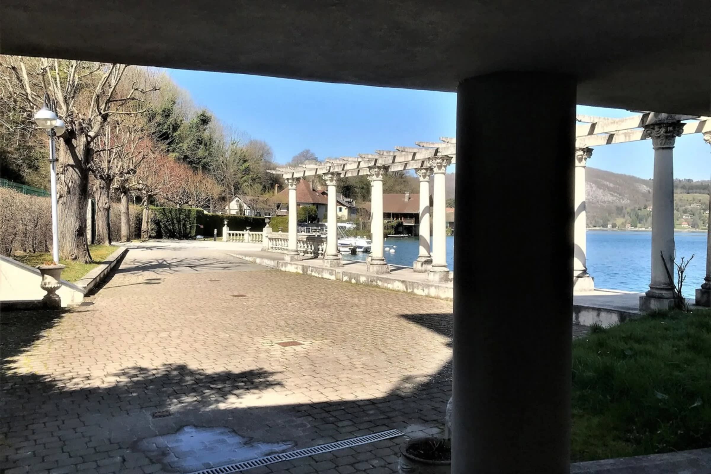 La résidence donne directement sur le lac, il y a plusieurs accès à l'eau que ce soit par les pontons ou par les marches descendant dans le lac par la belle arche de style grec.