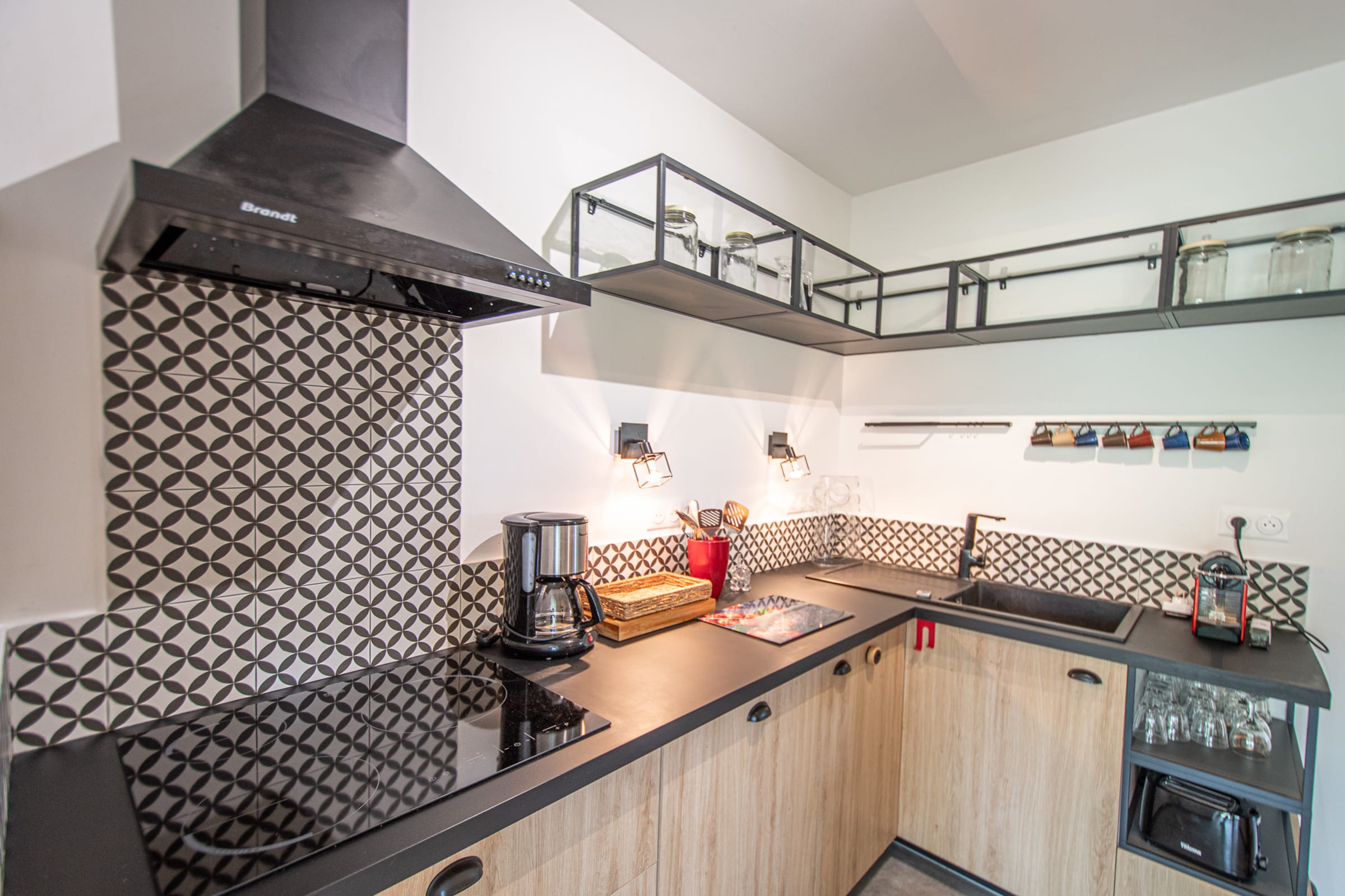 Cuisine équipée (four, micro-ondes, plaques, réfrigérateur, cafetière)