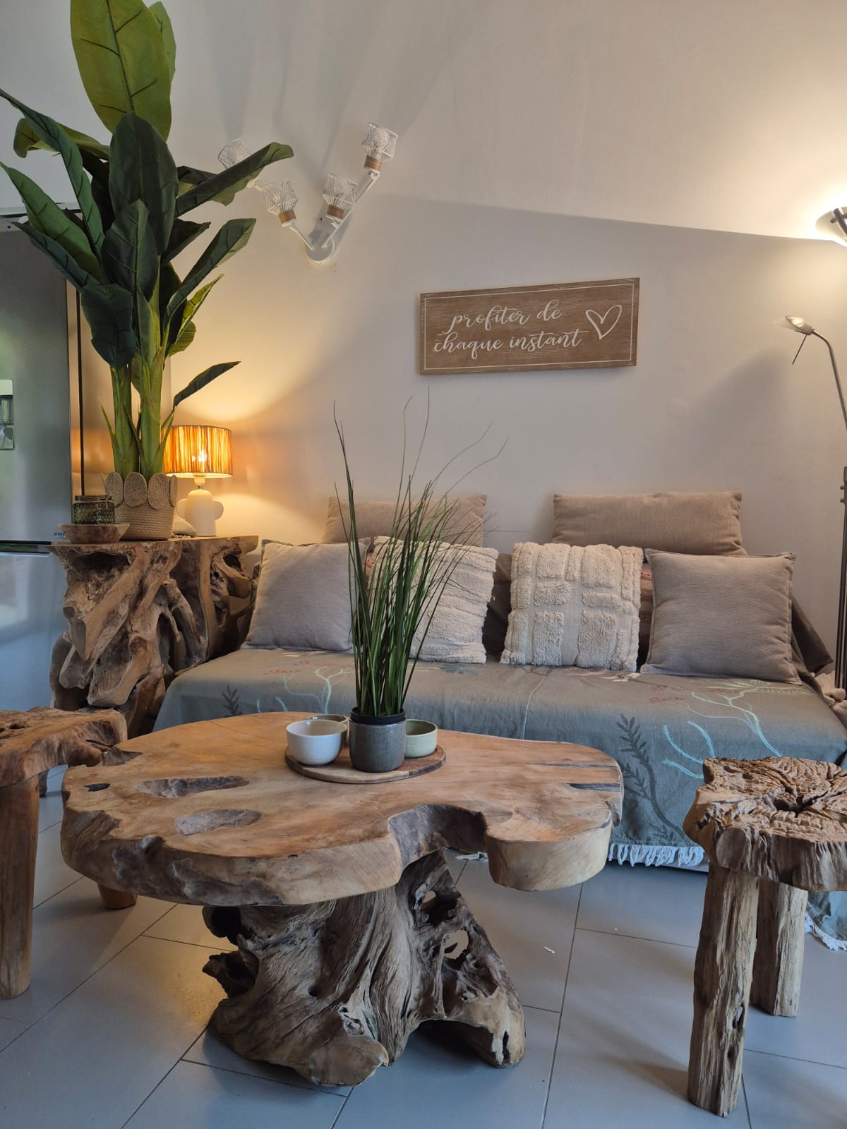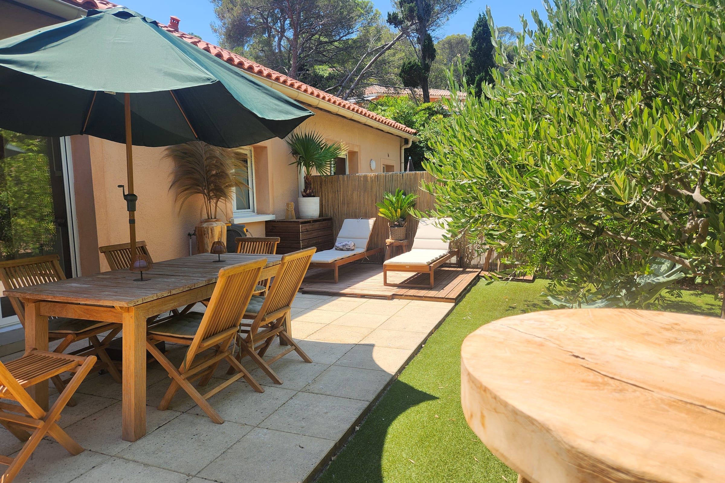 A l'extérieur vous trouverez 2 terrasses dont une avec jardinet et transat pour bronzer en toute tranquillité.