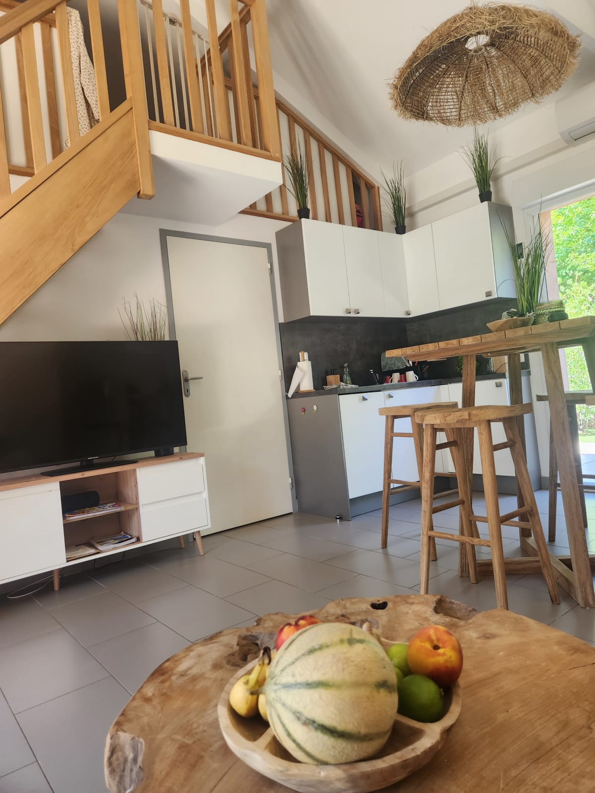 L'appartement est très bien exposé, il se compose de 2 chambres, une de plein pied climatisée et une en mezzanine, d'un salon climatisé, d'une salle à manger avec cuisine américaine,