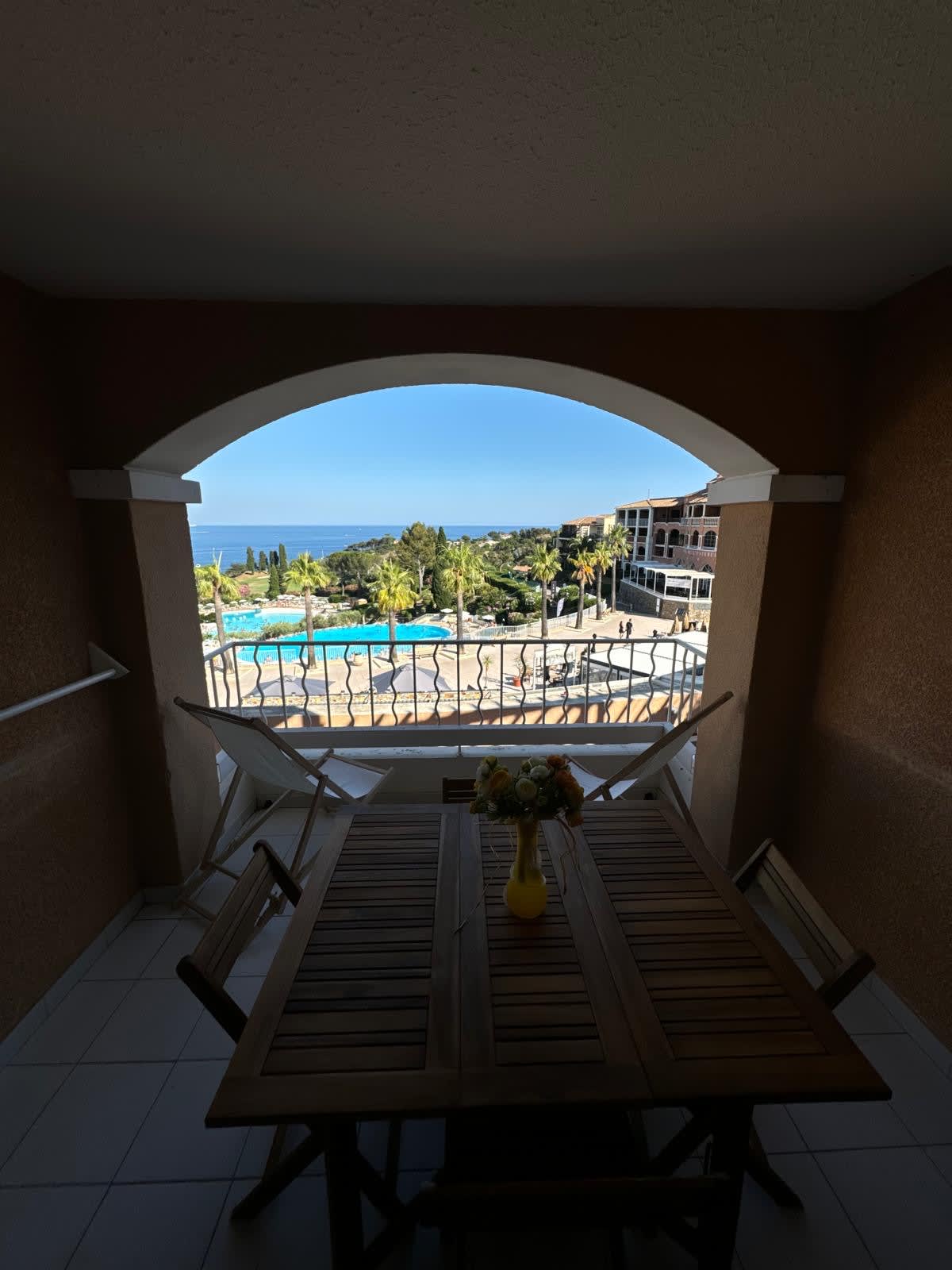 Terrasse avec vue sur la piscine et la Mer