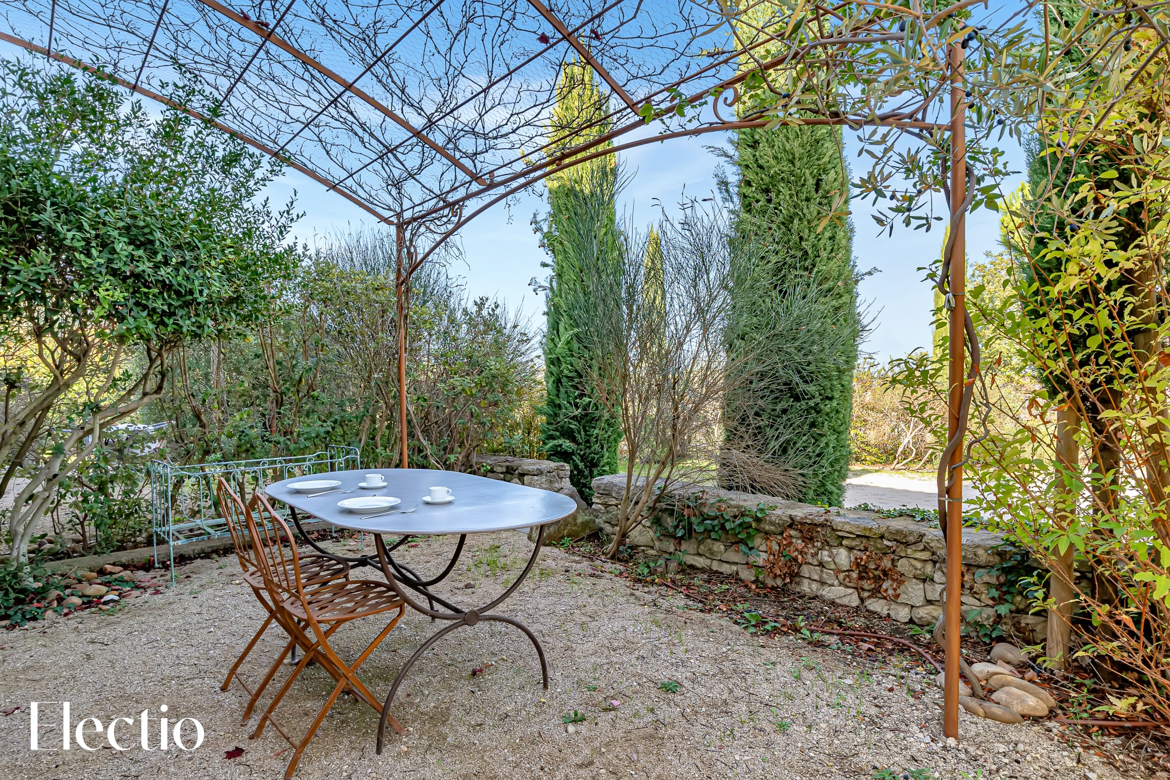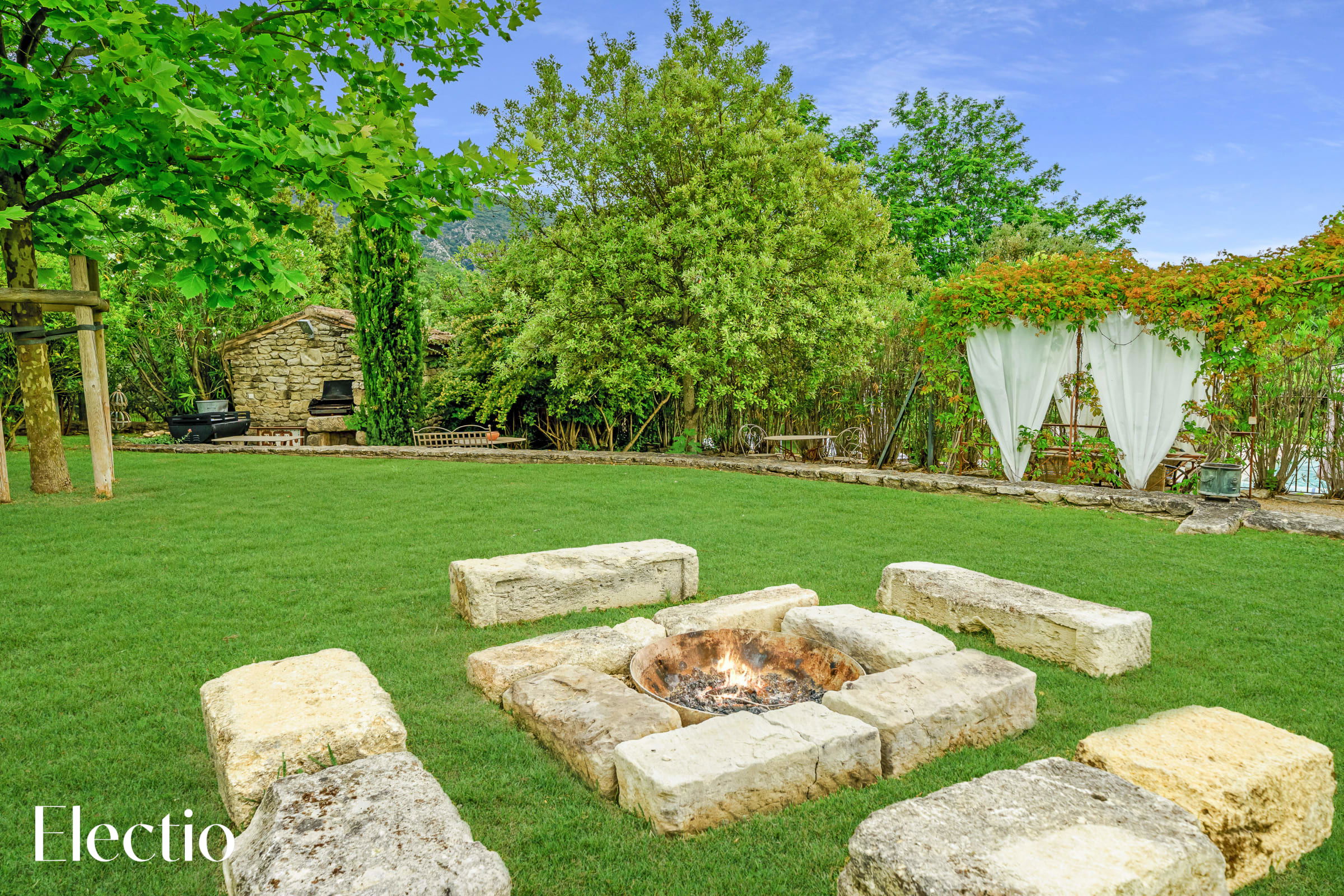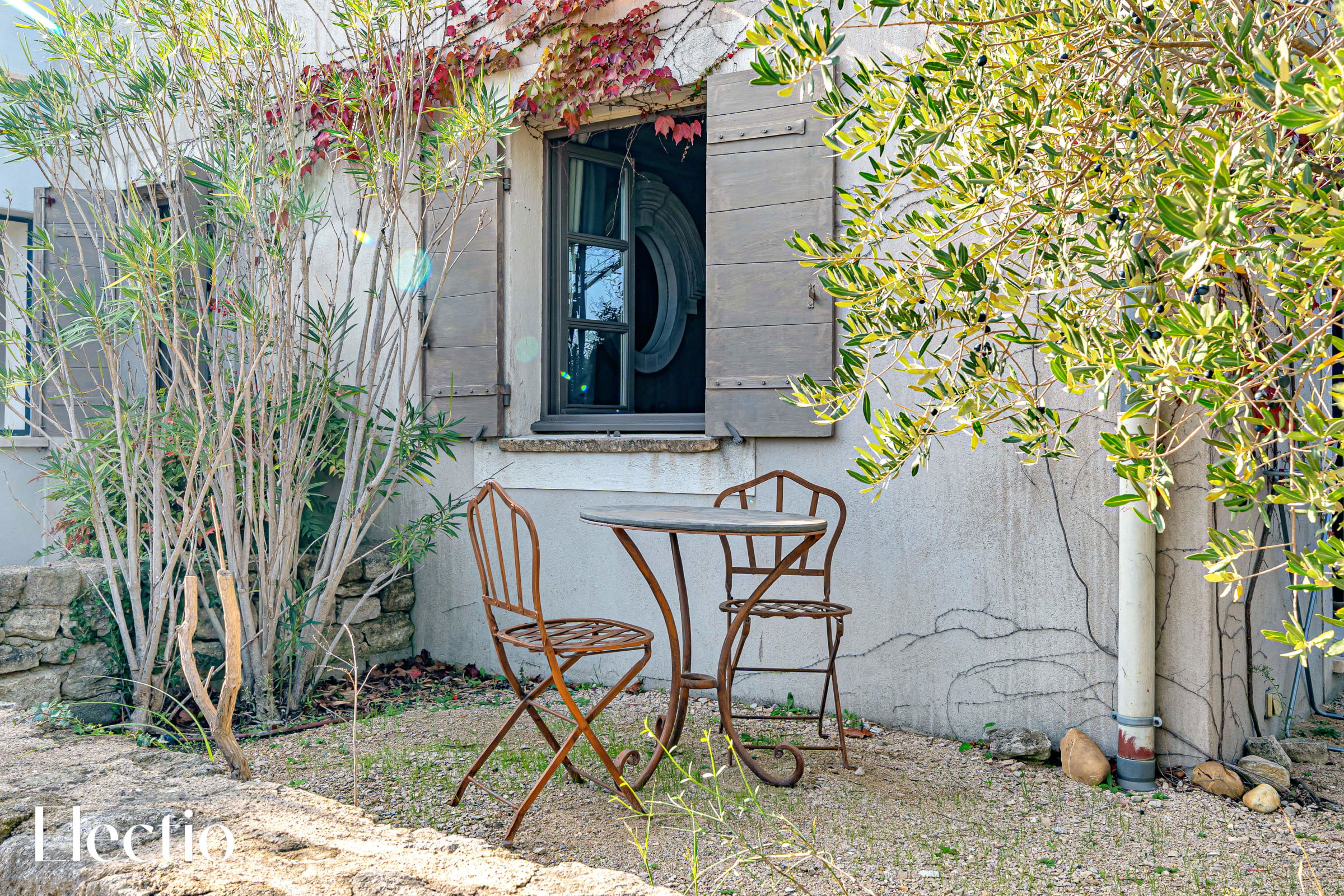 Les extérieurs de la résidence sont magnifiquement aménagés pour vous offrir une expérience authentique de la Provence. Vous y trouverez des espaces ombragés avec pergolas, des rideaux blancs, des platanes et des bancs en pierre pour vous détendre. Un barbecue au charbon de bois est à votre disposition, avec possibilité d’acheter du charbon dans un supermarché à proximité. La végétation typiquement provençale, composée d'oliviers centenaires, de genêts, de lauriers roses et de lavandes, crée une atmosphère envoûtante. Une fontaine et un clocher apportent un charme supplémentaire à l'ensemble.