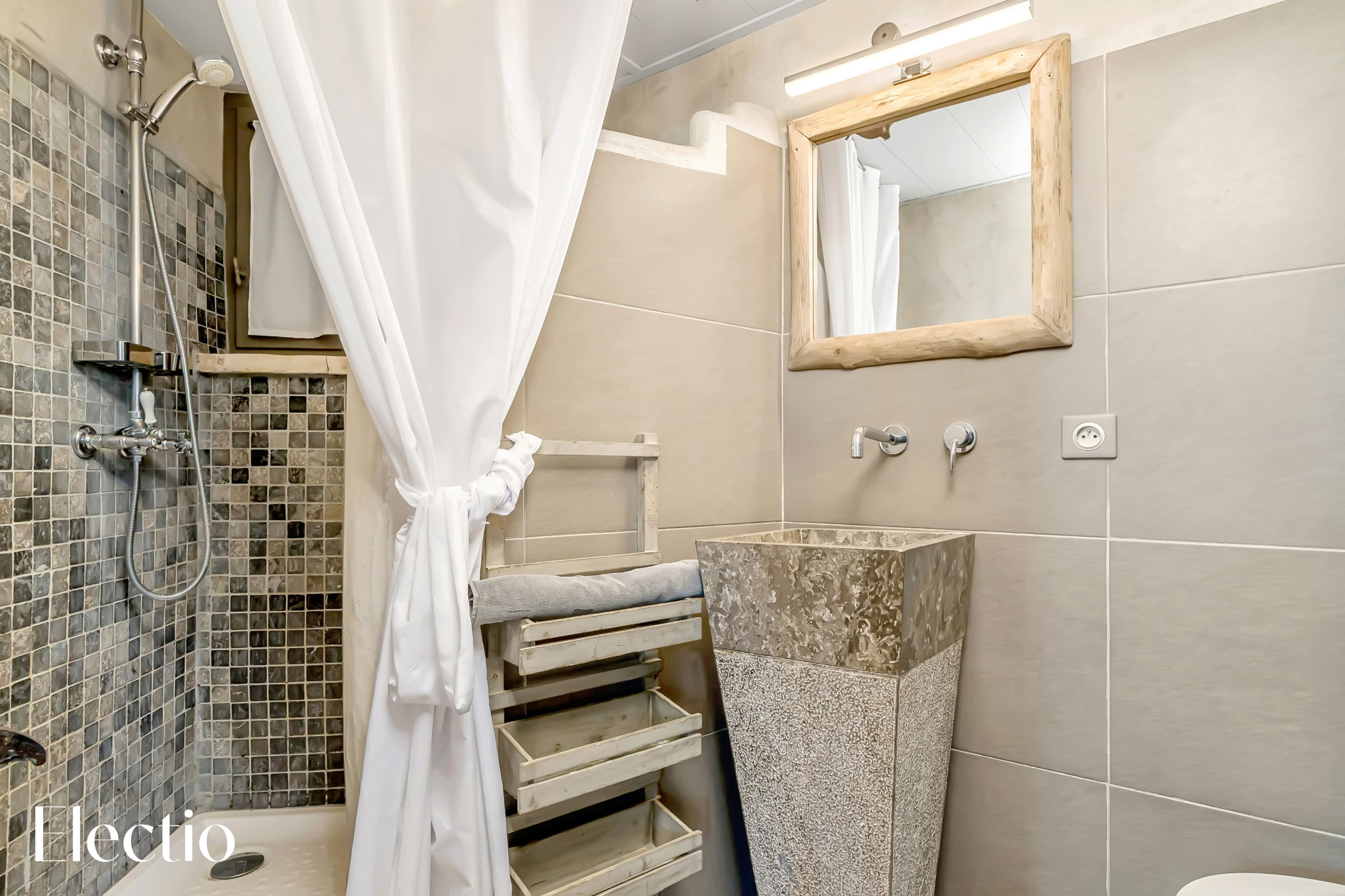 🚿 Entrez dans la salle d’eau, un espace où confort et raffinement se rencontrent. La douche à l’italienne, équipée d’une colonne de jets multiples, promet des instants de détente absolue. Le lavabo en pierre, accompagné d’un miroir épuré, ajoute une touche naturelle et sophistiquée, tandis que les toilettes se fondent discrètement dans cet ensemble harmonieux.