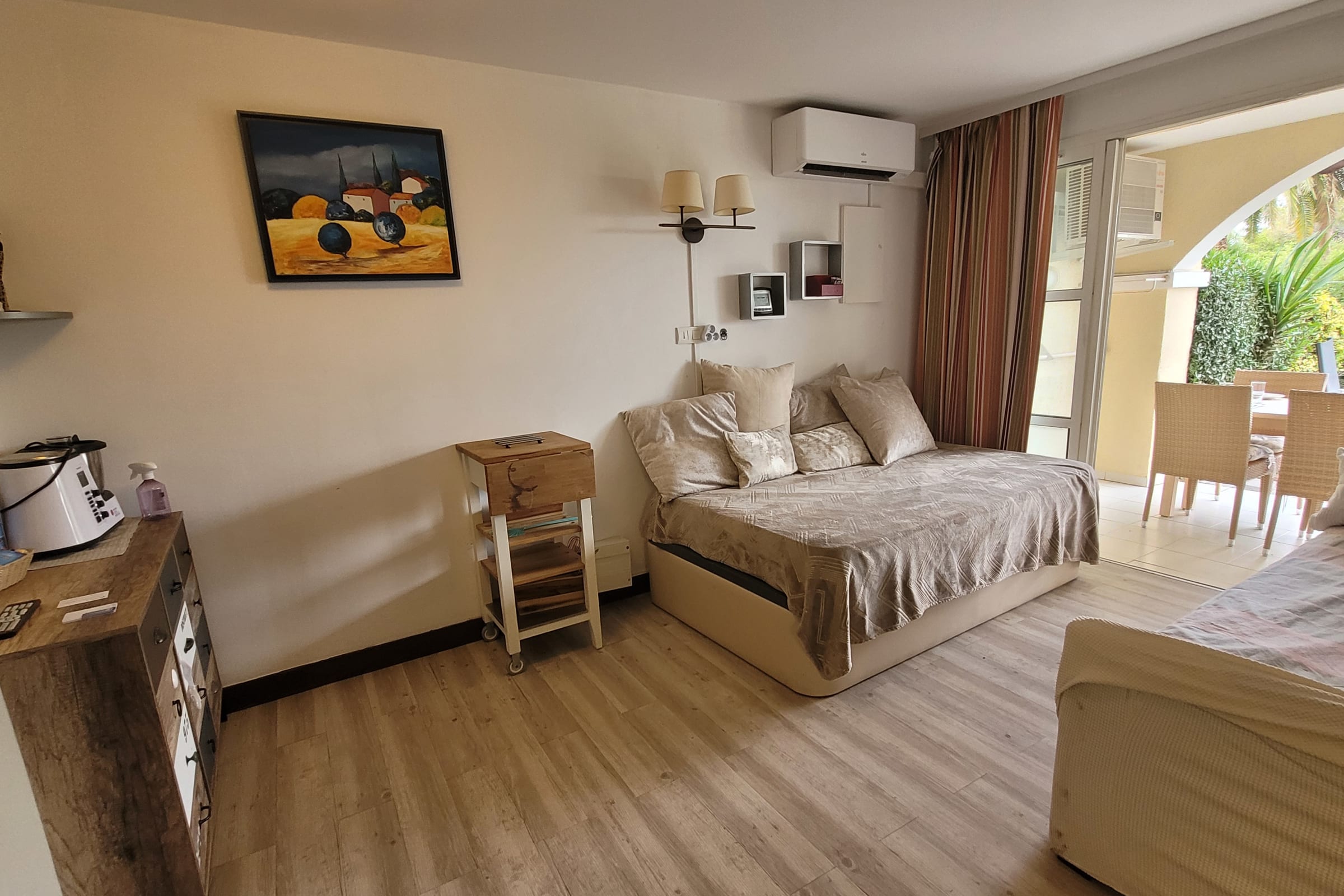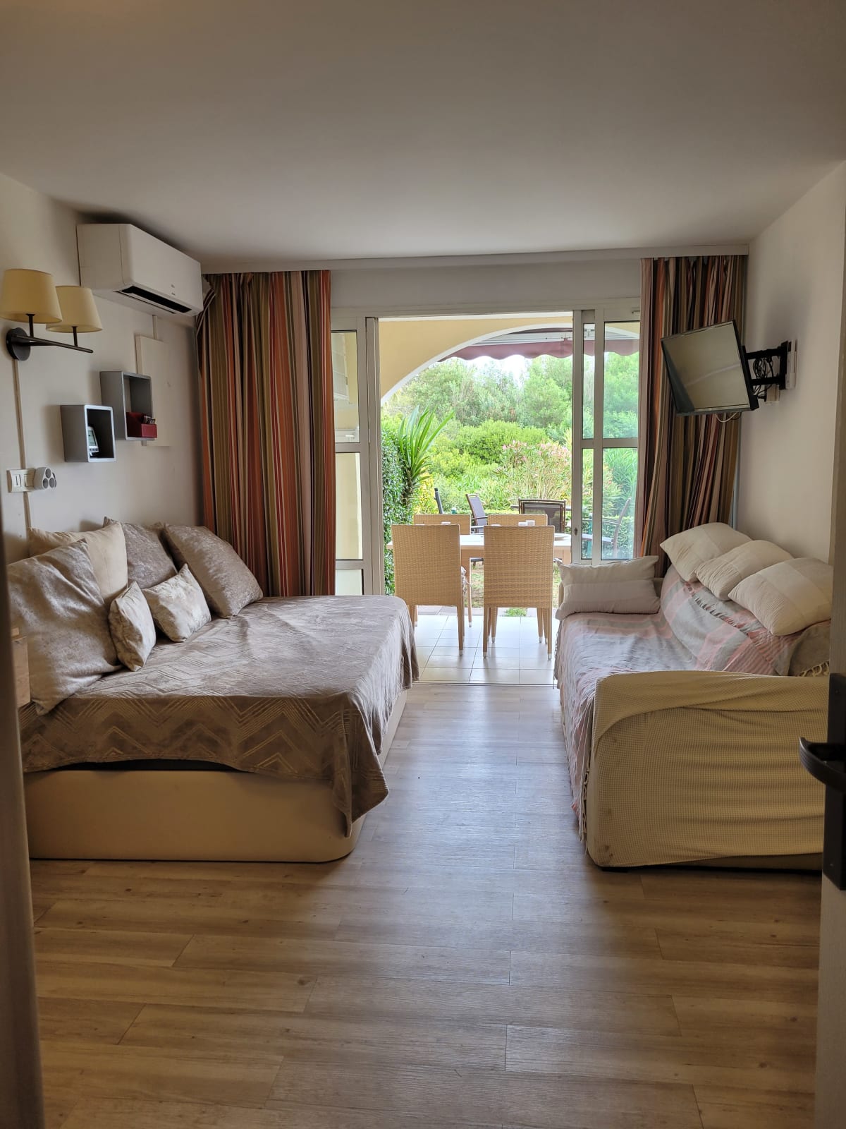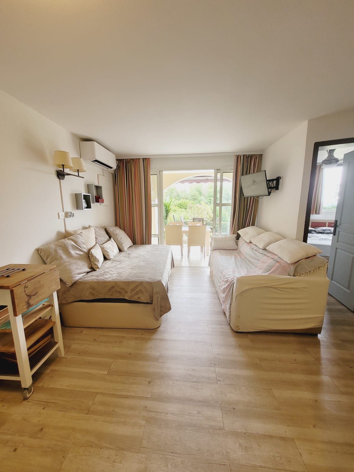 Le logement est de type Appartement, avec climatisation, et peut accueillir jusque 5 personnes (1 chambre avec lit double et deux sofa bed dans le salon) ; un lit parapluie et une chaise haute sont également à disposition sur place. Une TV dans la chambre et une dans le salon.