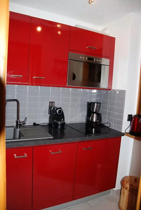 - Cuisine équipée avec réfrigérateur, petit congélateur, plaques électriques, micro-ondes grill, lave-vaisselle, cafetière à filtre, appareil à raclette avec pierrade