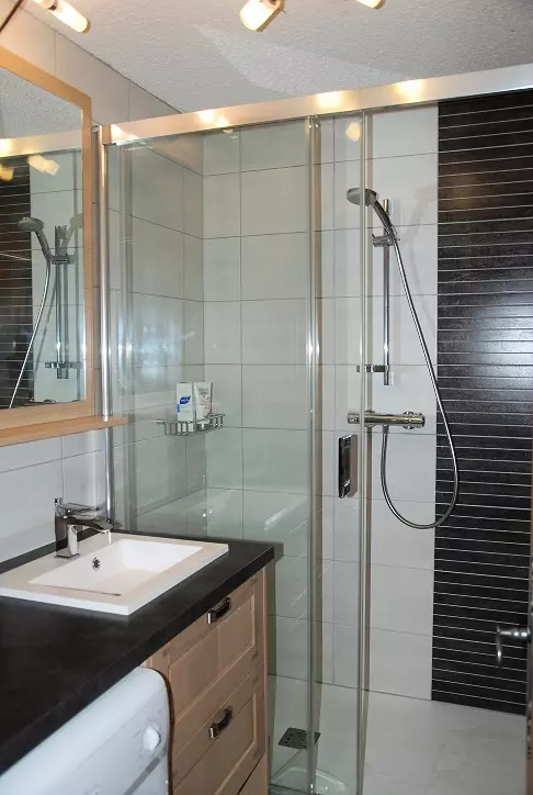 - Salle de bain avec grande douche, sèche-serviette et machine à laver