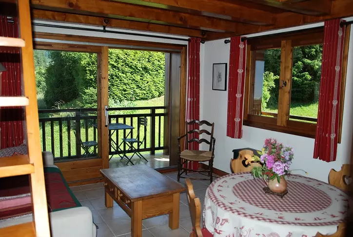 - Séjour avec canapé-lit 140cm, poêle électrique, télévision et coin repas 4 à 6 couverts, accès balcon avec vue Mont-Blanc et pâturages