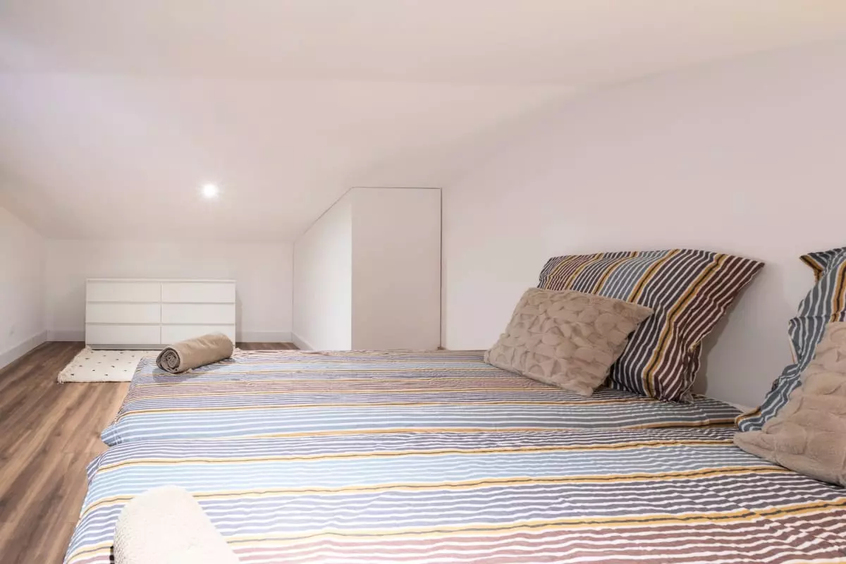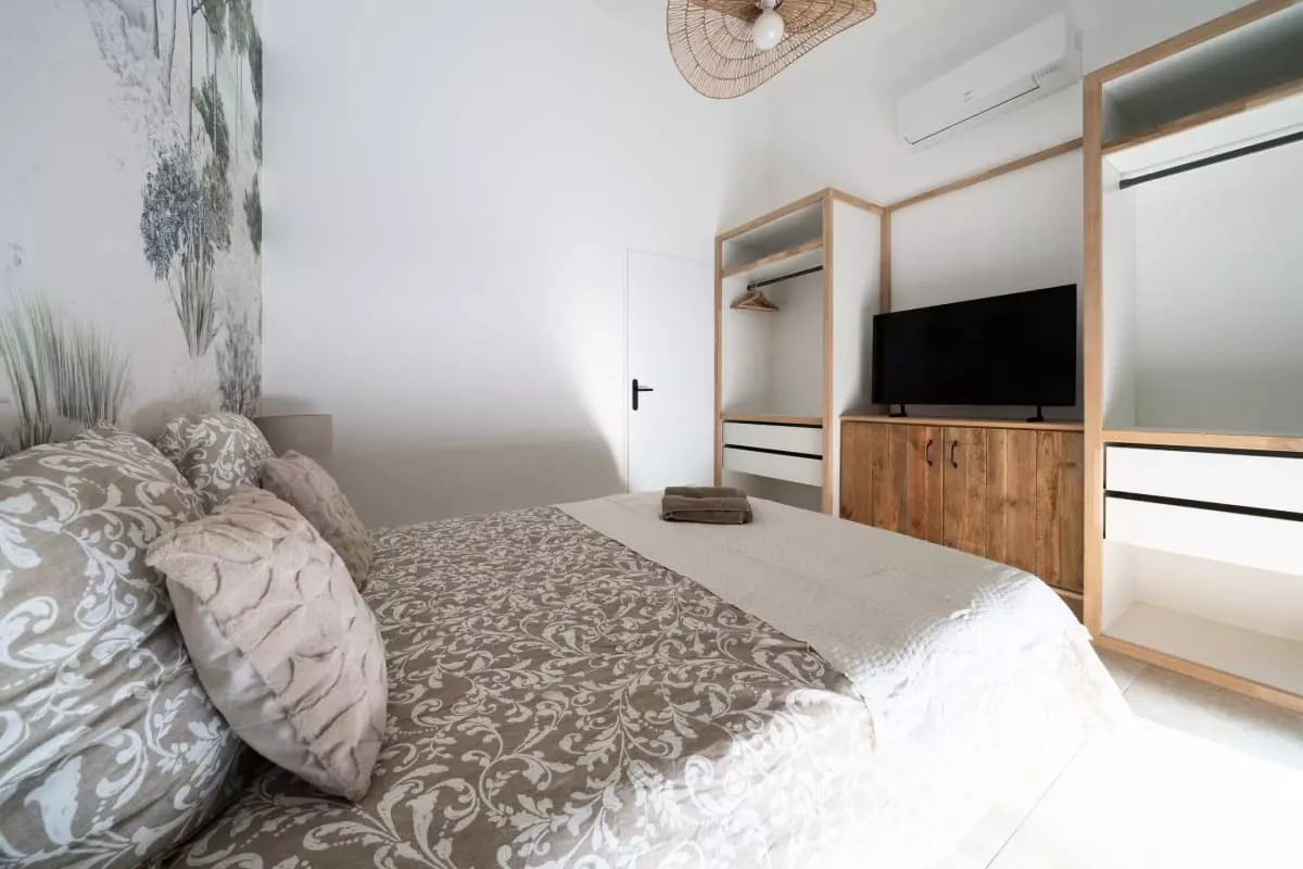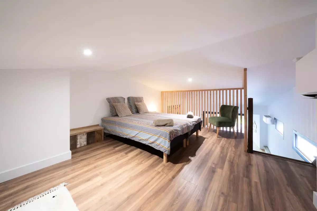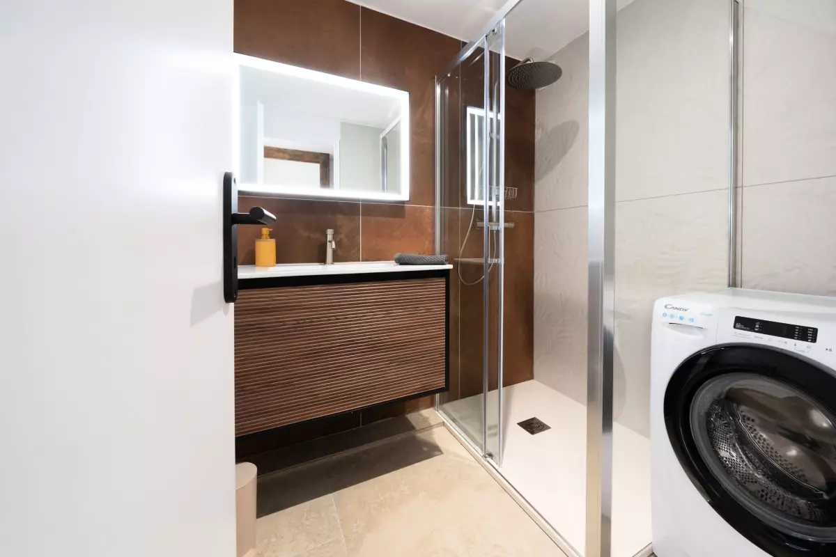 L'espace de vie s'ouvre sur un salon chaleureux avec canapé, parfait pour vos moments de détente après une journée de découverte. La cuisine est entièrement équipée avec tout le nécessaire : four, micro-onde, lave-vaisselle, réfrigérateur et machine à café. Vous profiterez également d'une salle de douche moderne, d'un lave-linge et d'un fer à repasser pour un quotidien facilité.