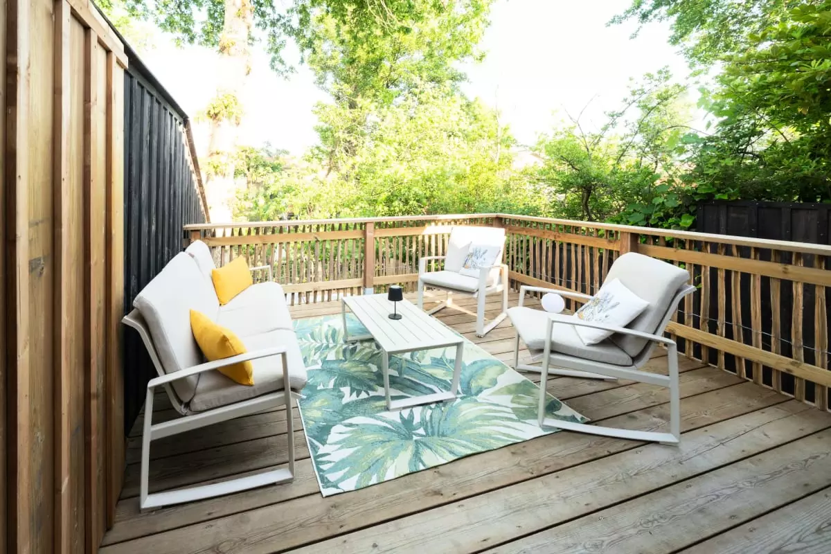 L'extérieur est le véritable joyau de cette maison avec deux terrasses distinctes. La terrasse arrière abrite un spa privé pour vos moments de relaxation absolue, tandis que la terrasse avant vous permet de profiter du grand air à chaque instant de la journée.