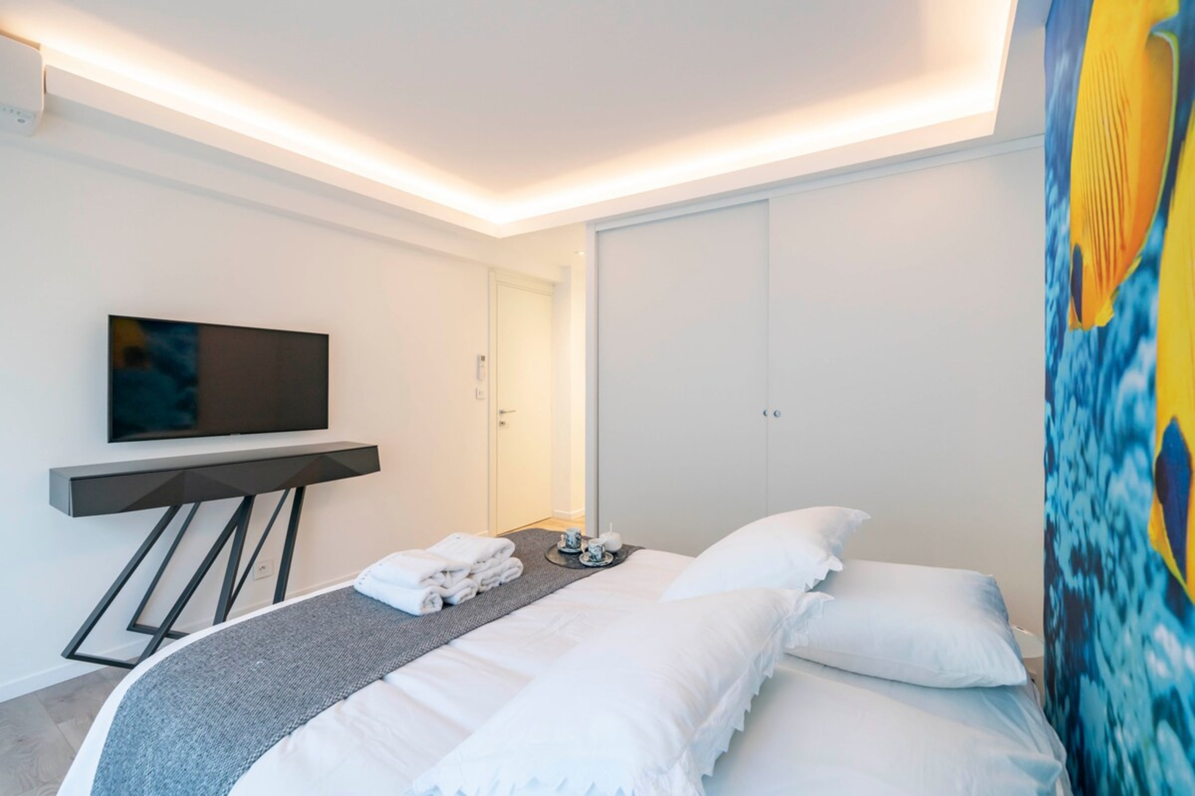 L'espace nuit est constitué de deux belles chambres, chacune avec salle de bains ensuite. L'ensemble du mobilier de l'appartement est neuf et de très bonne qualité. Vous profiterez également d'une belle terrasse avec aperçu mer.