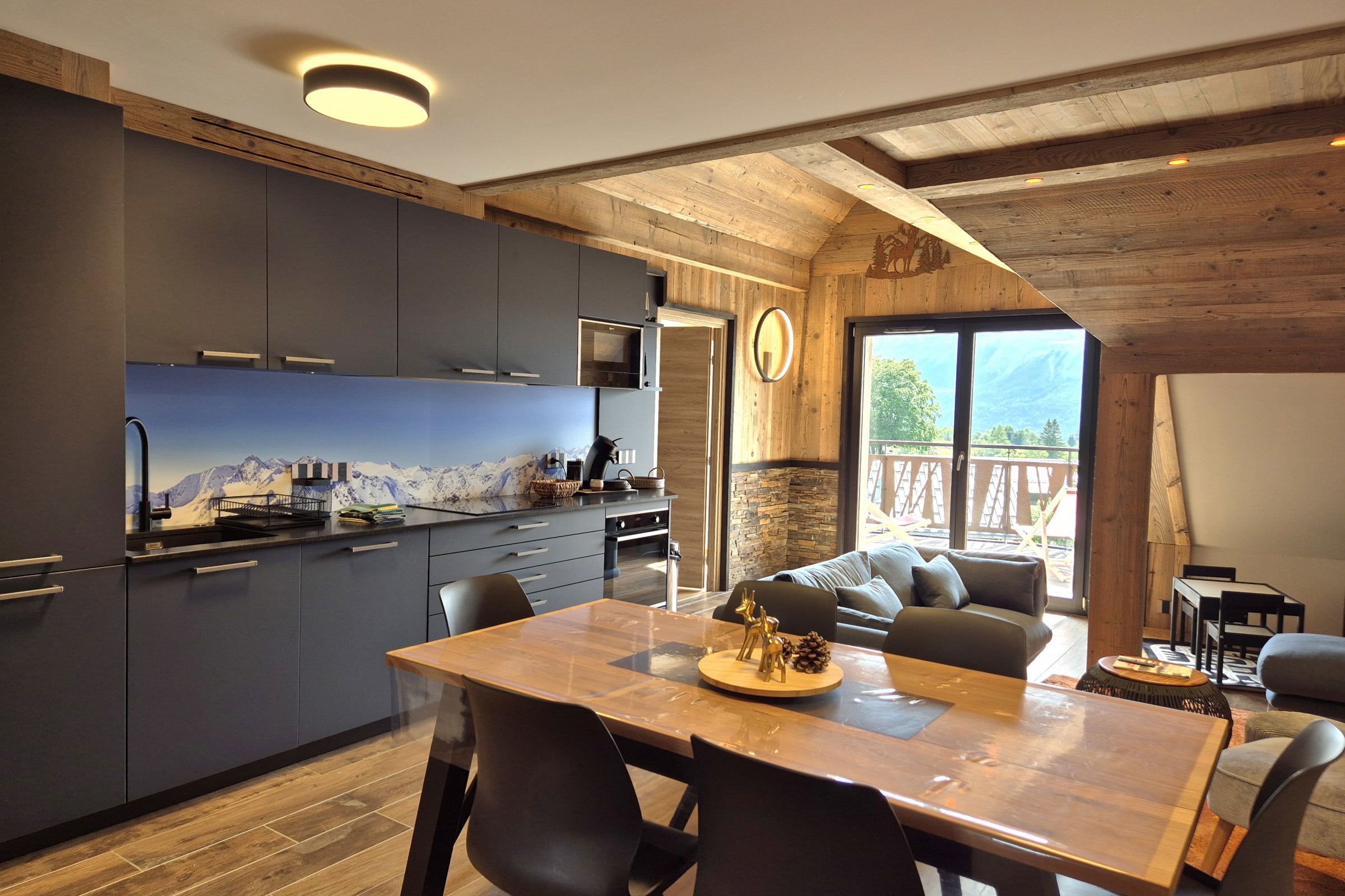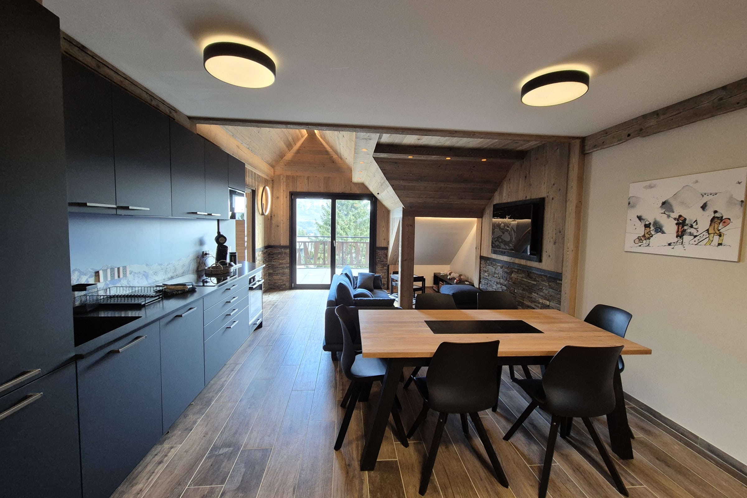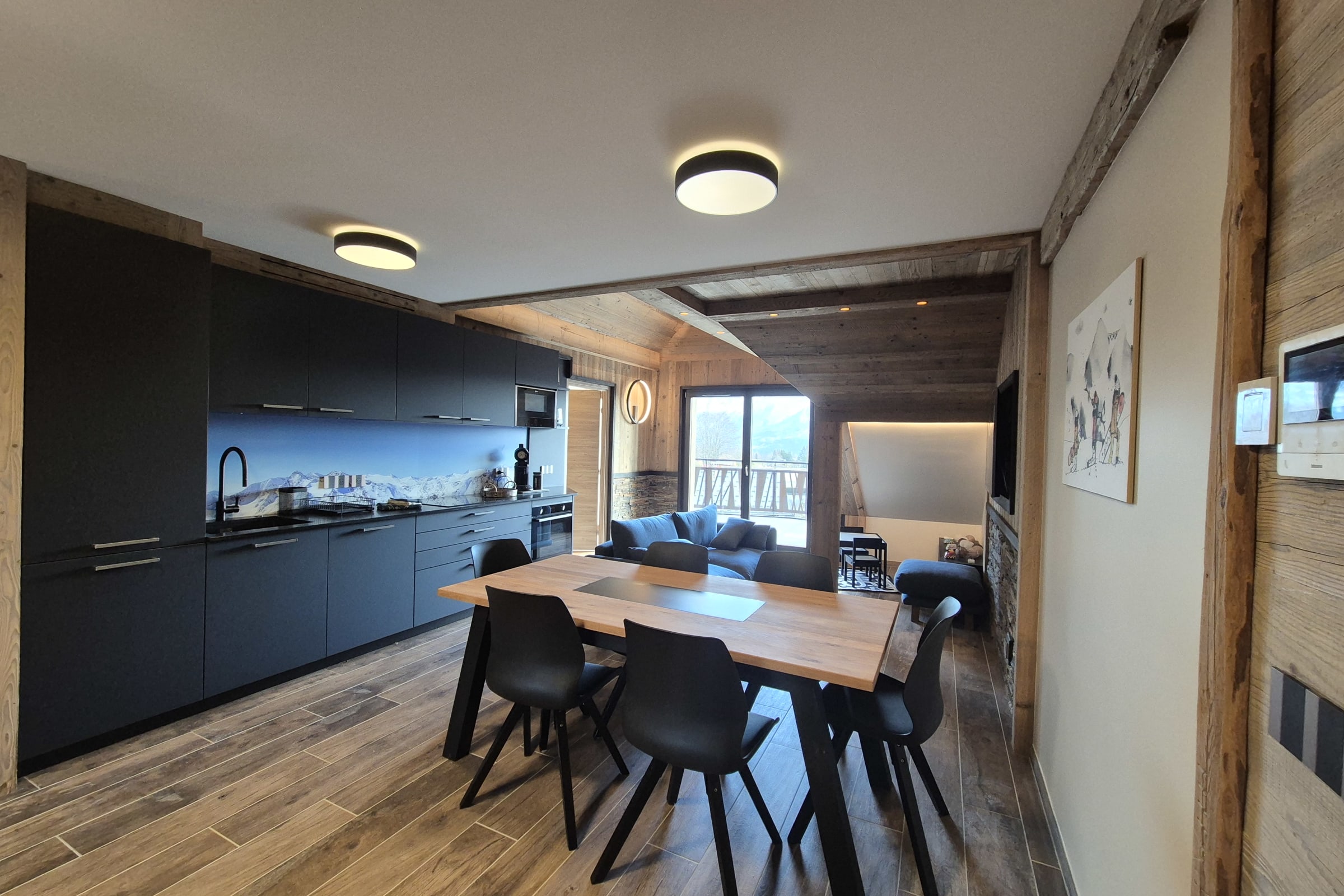 Le salon, à la fois spacieux et confortable, est doté d’un canapé cosy et d’une télévision à écran plat. De grandes baies vitrées donnent accès à une grande terrasse, parfaite pour admirer la vue et partager des moments conviviaux. Une grande table à manger accompagne une cuisine ouverte et entièrement équipée, avec tout le nécessaire : four, plaques de cuisson, lave-vaisselle, cafetière, bouilloire ...