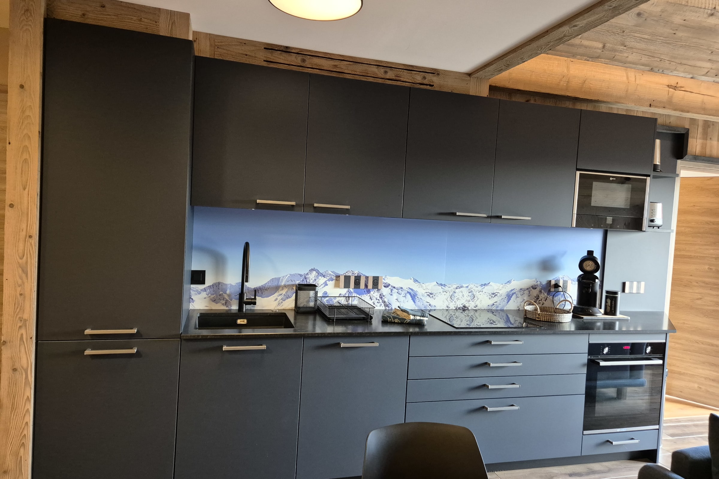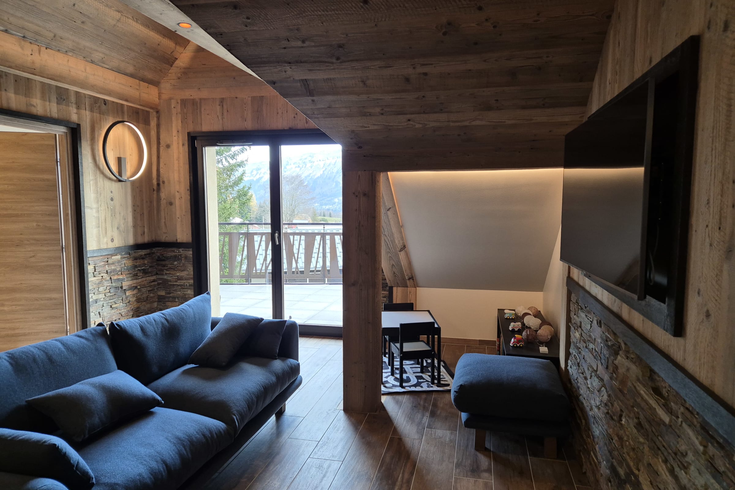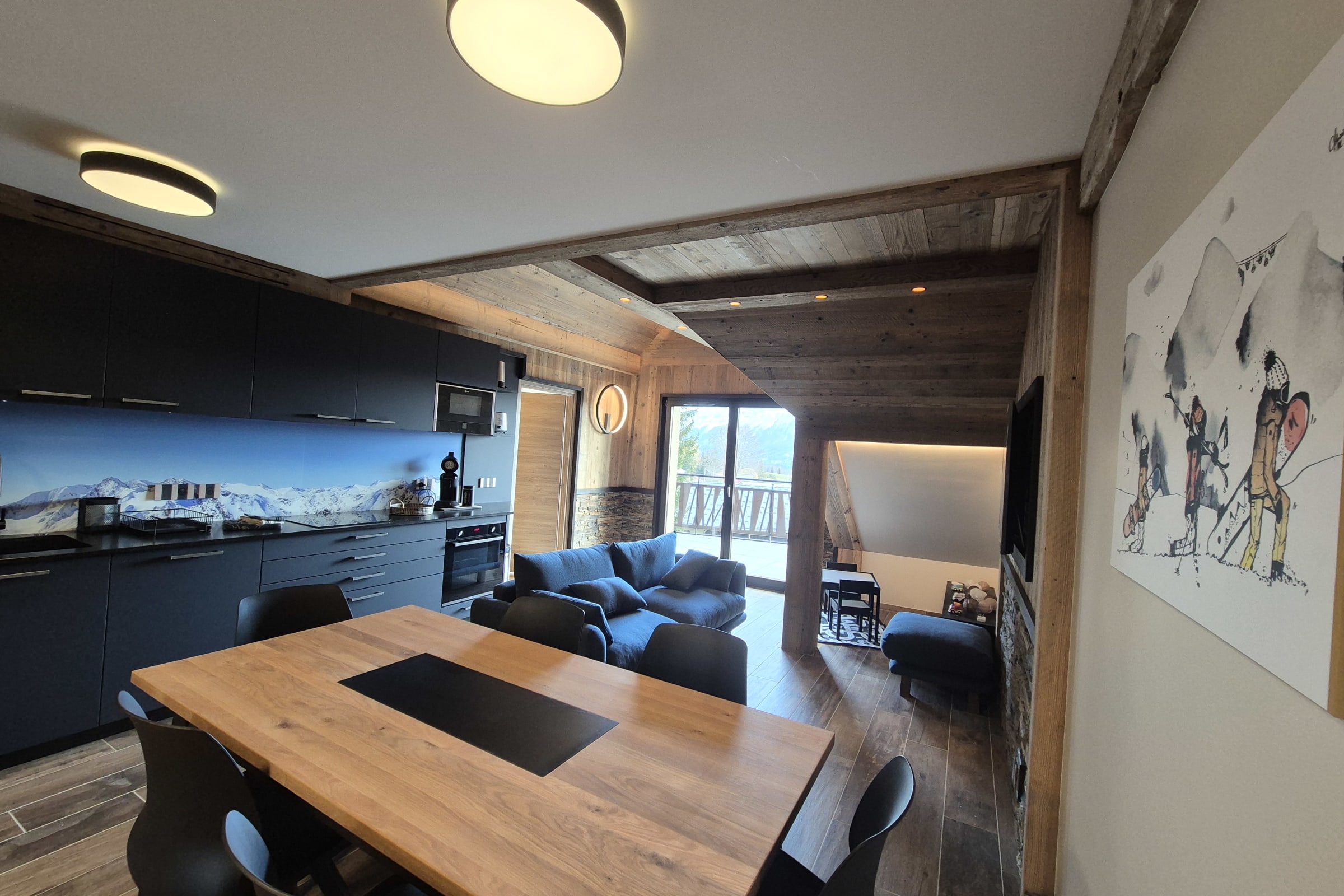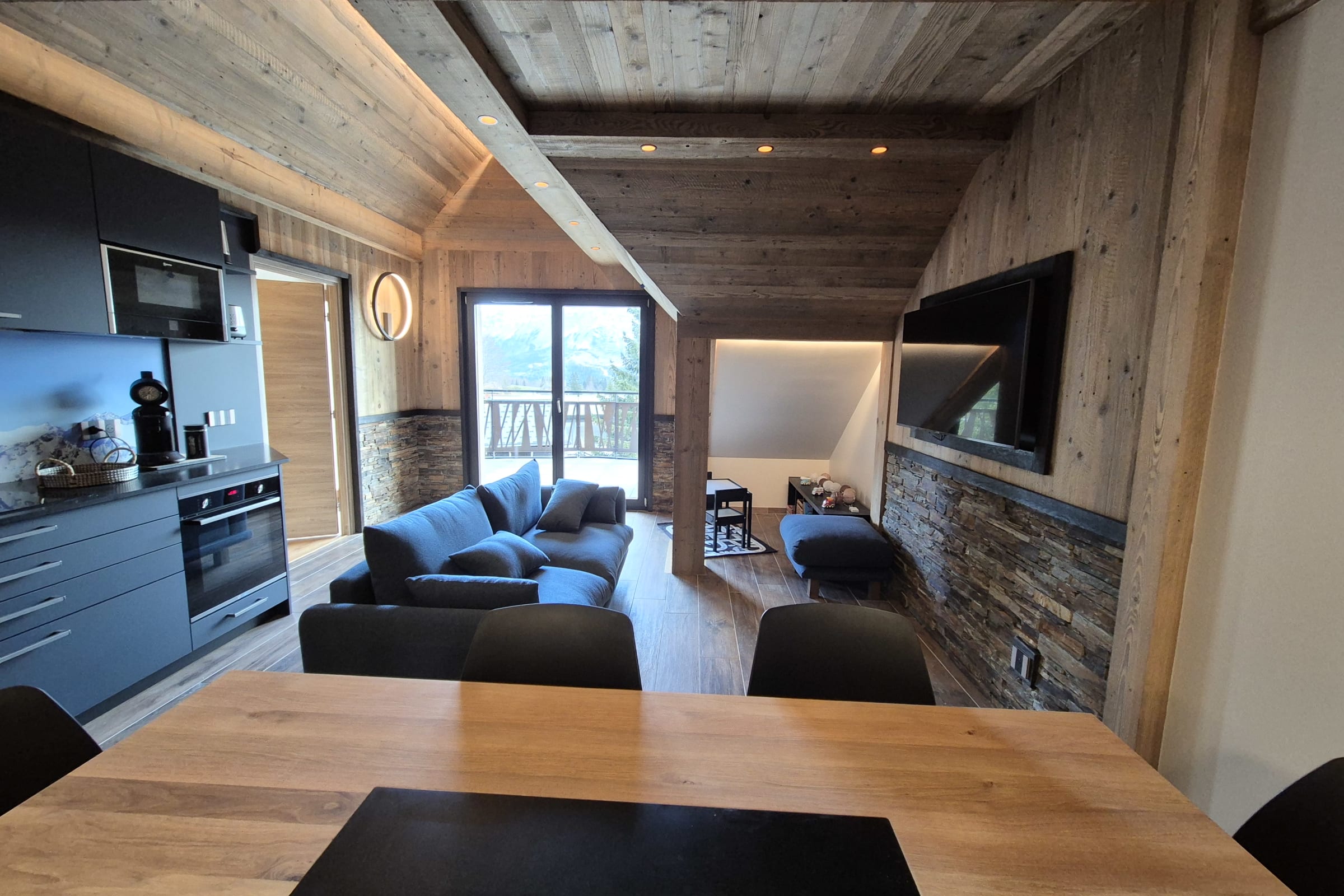 Le salon, à la fois spacieux et confortable, est doté d’un canapé cosy et d’une télévision à écran plat. De grandes baies vitrées donnent accès à une grande terrasse, parfaite pour admirer la vue et partager des moments conviviaux. Une grande table à manger accompagne une cuisine ouverte et entièrement équipée, avec tout le nécessaire : four, plaques de cuisson, lave-vaisselle, cafetière, bouilloire ...