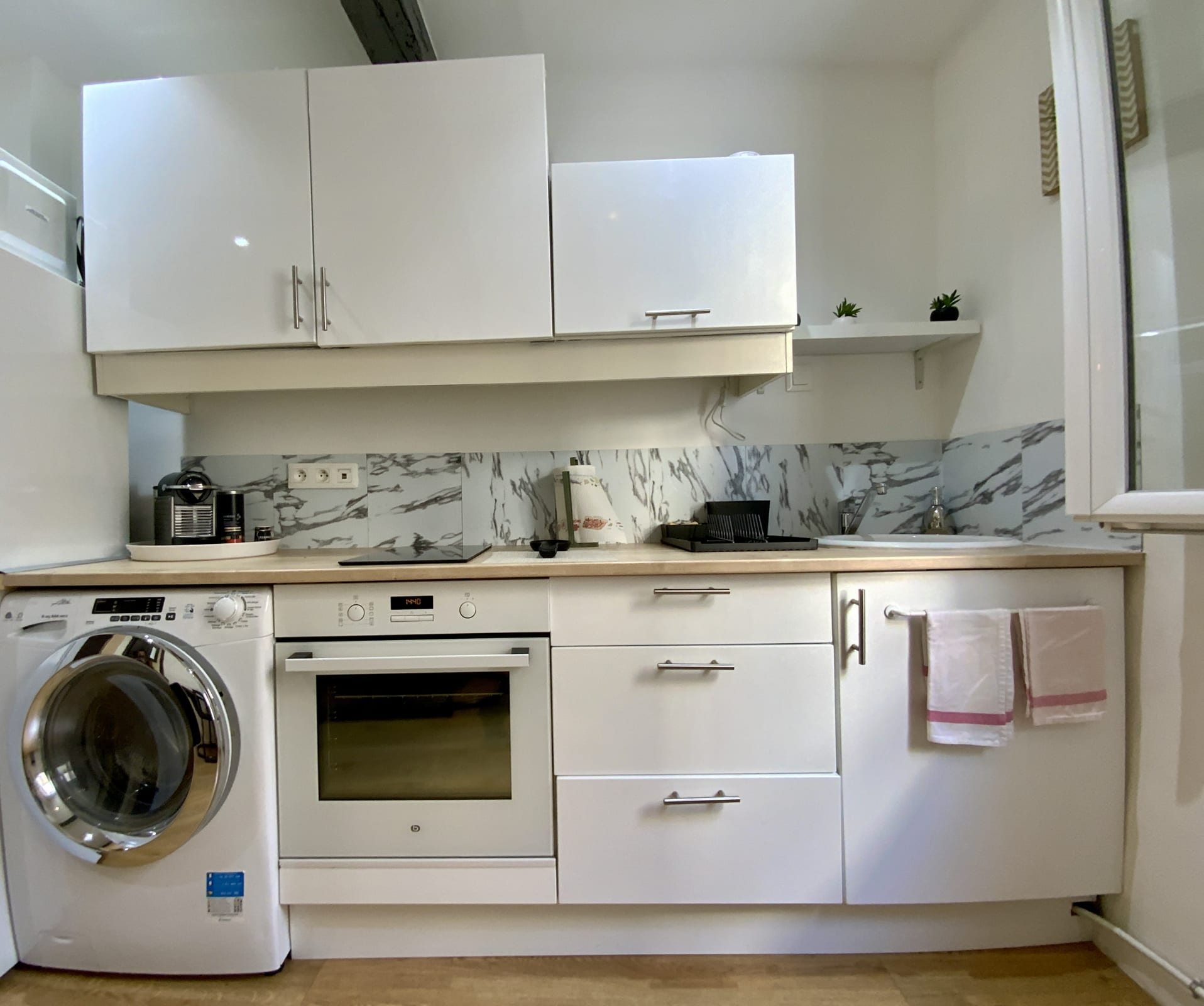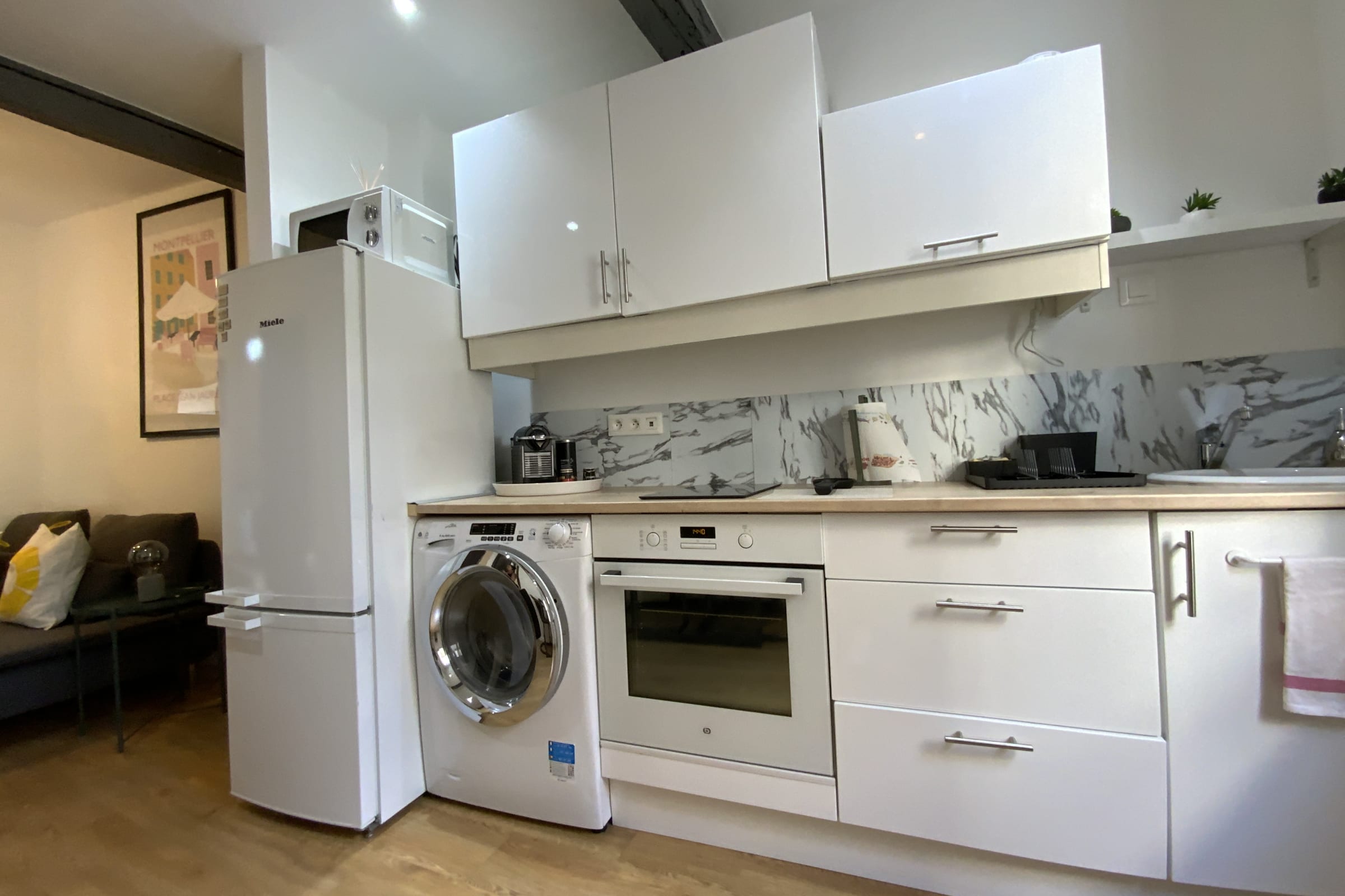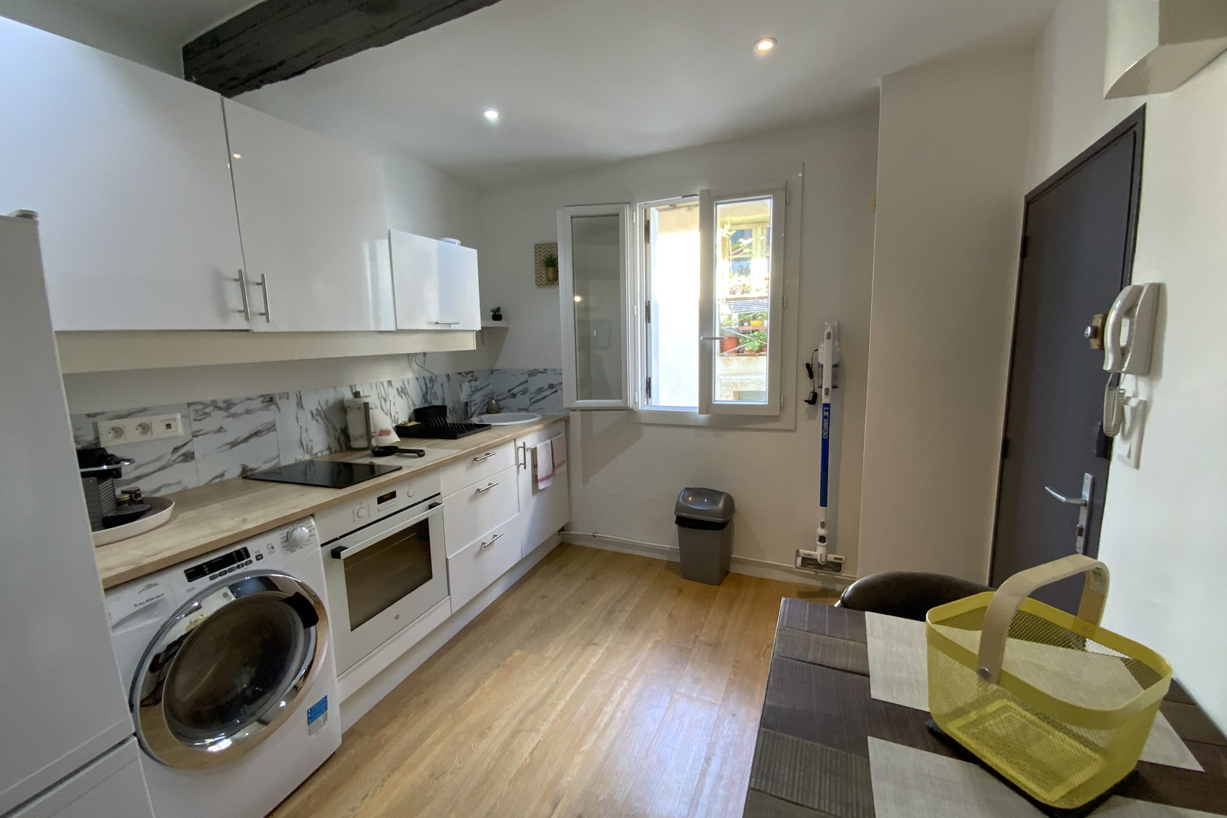 La cuisine ouverte propose de nombreux rangements, un grand plan de travail pratique et tout l'équipements électroménagers : machine à laver, four, plaque de cuisson 2 feux, micro-onde, combiné réfrigérateur/congélateur, bouilloire, grille-pain, machine à café Nespresso.