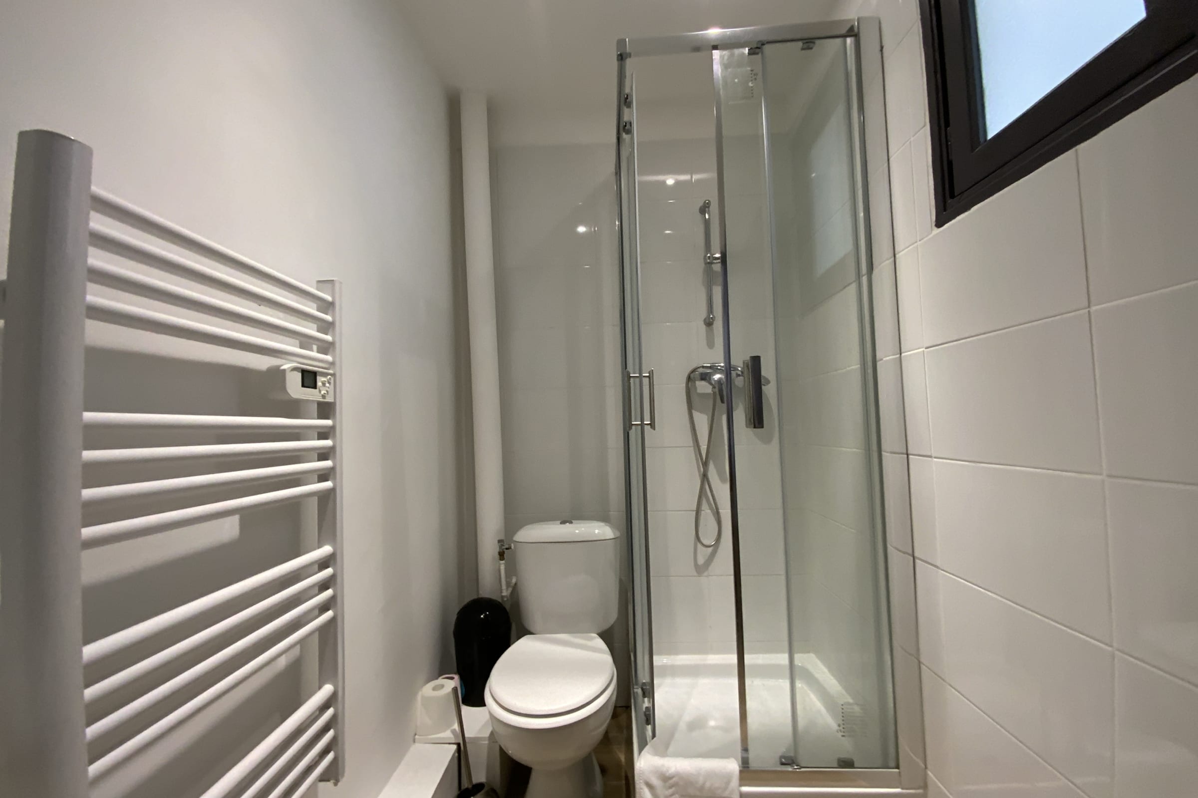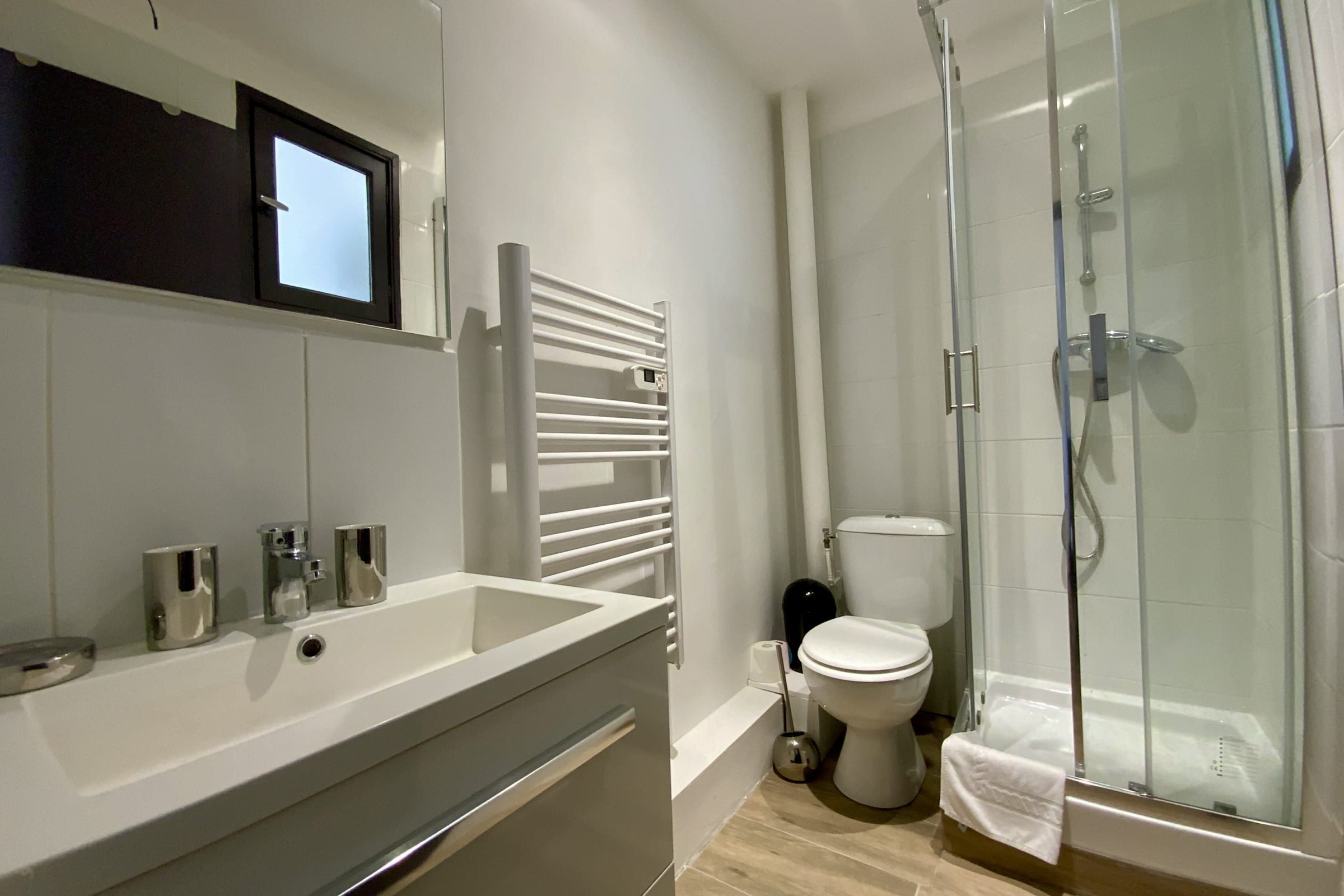- La salle d'eau propose une vasque simple avec son meuble, un WC, une cabine de douche et un sèche serviette