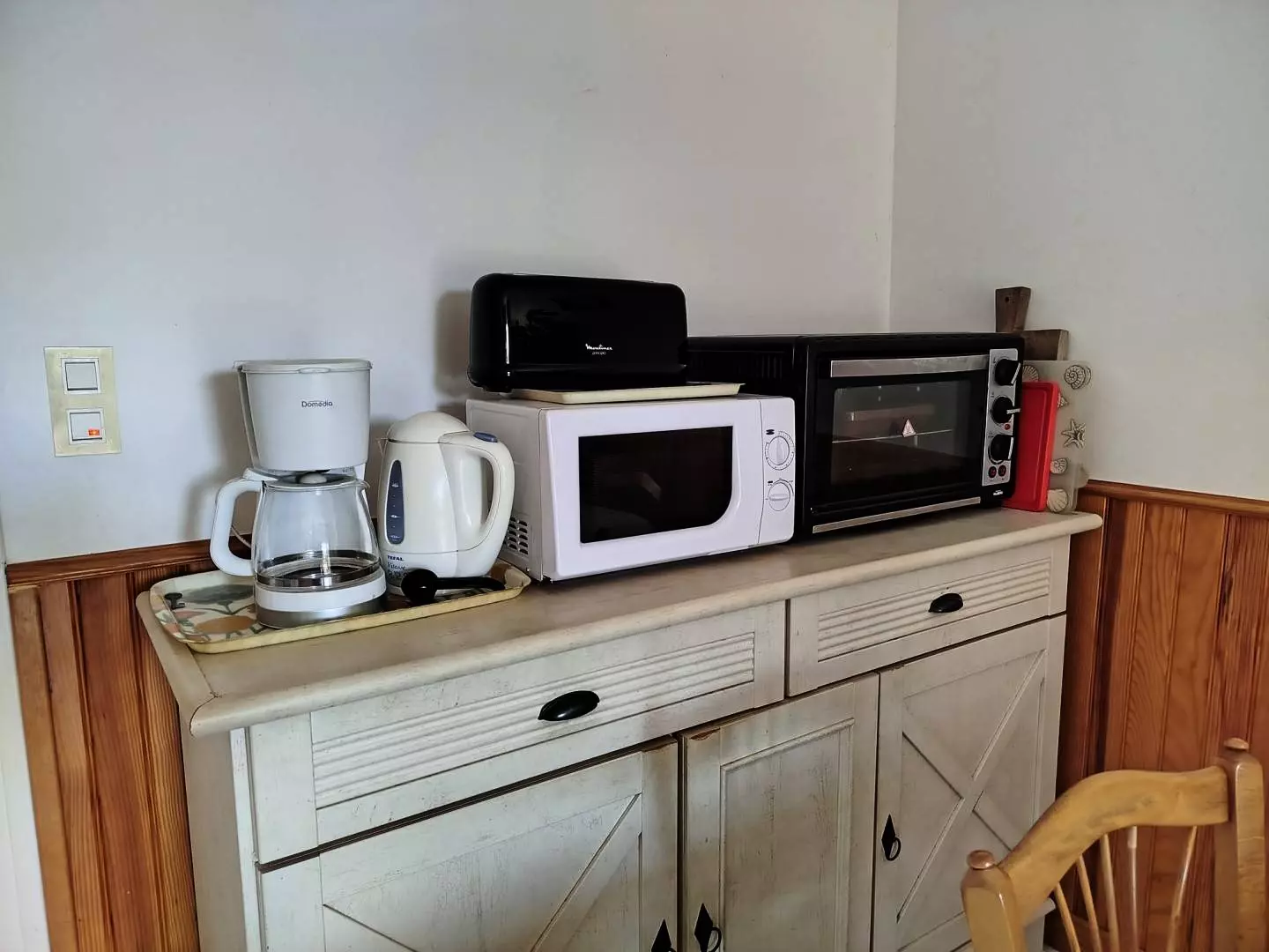 Coin repas et kitchenette (Réfrigérateur/congélateur, plaque de cuisson 2 feux induction,hotte, lave vaisselle, four, micro onde, cafetière filtres, bouilloire, grill pain..)
