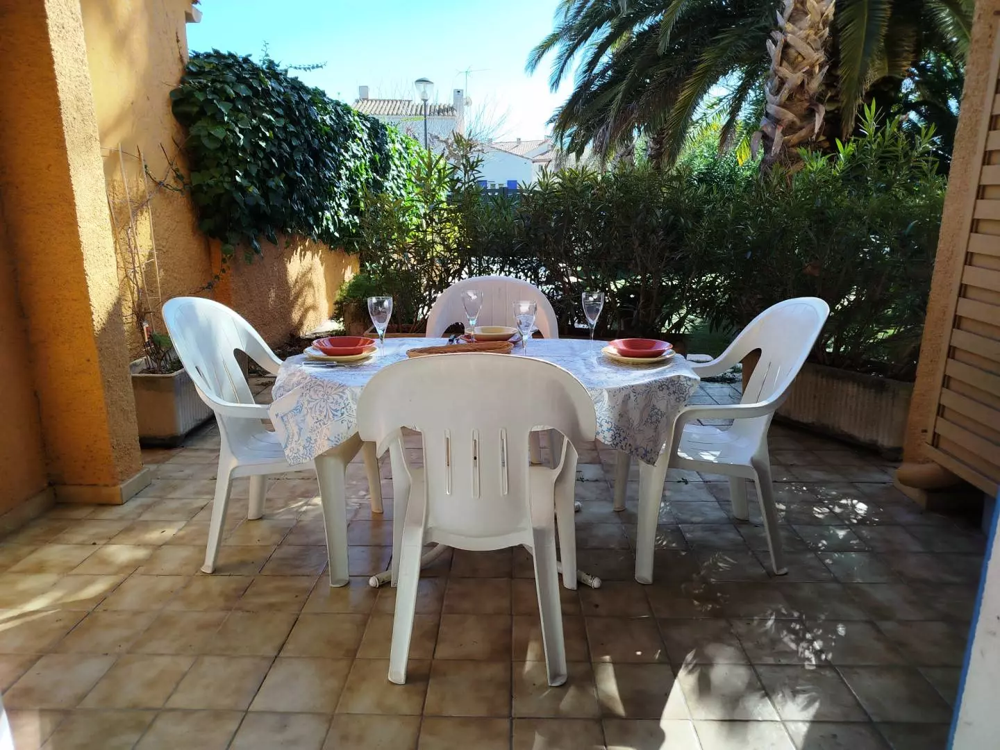 Belle terrasse couverte avec store banne et mobilier extérieur - Vue sur le jardin collectif de la propriété entièrement clôturée et fermée par un portail. Accessible aux différents locataires lors de votre séjour - idéal coin lecture & détente.
