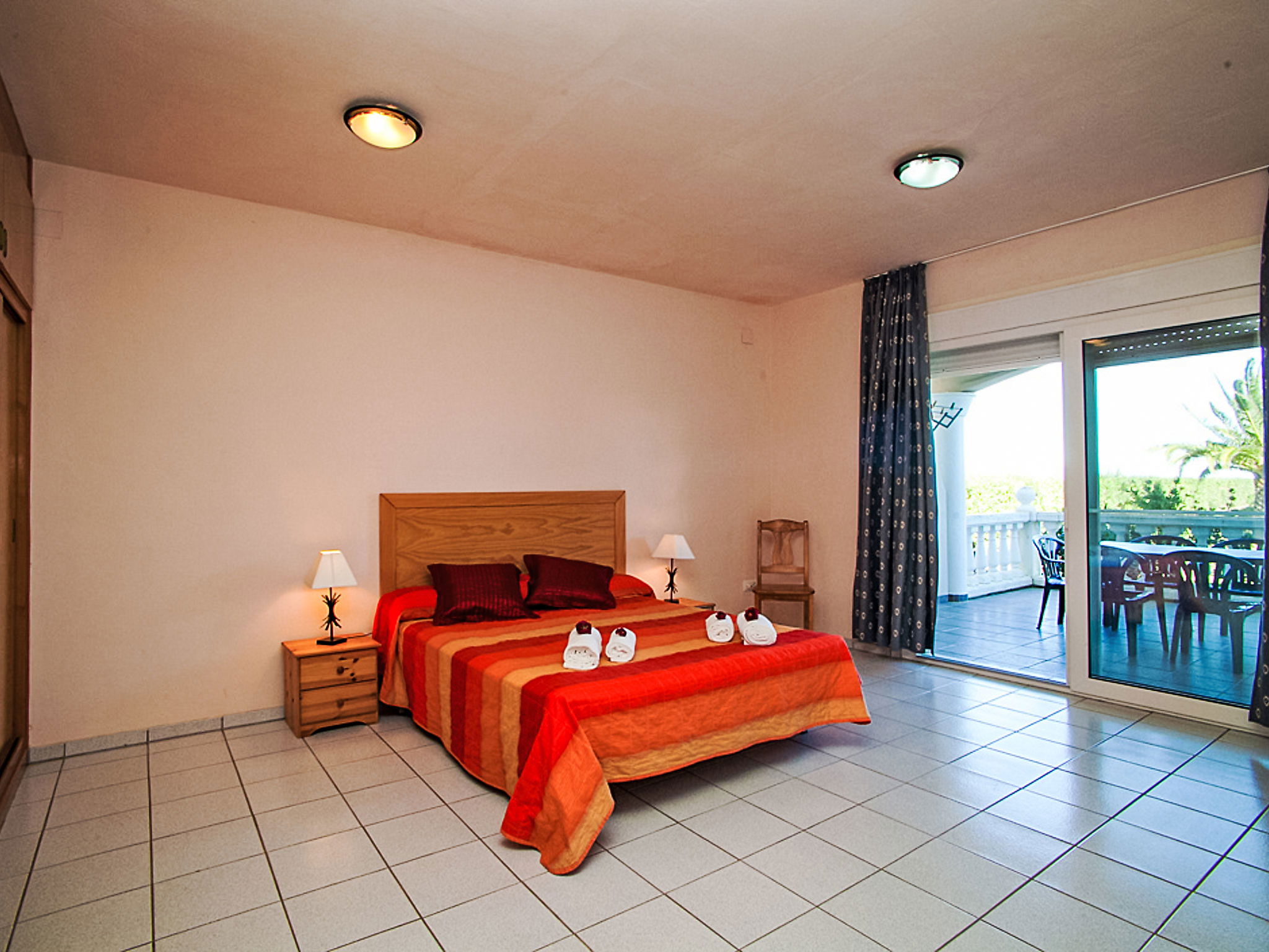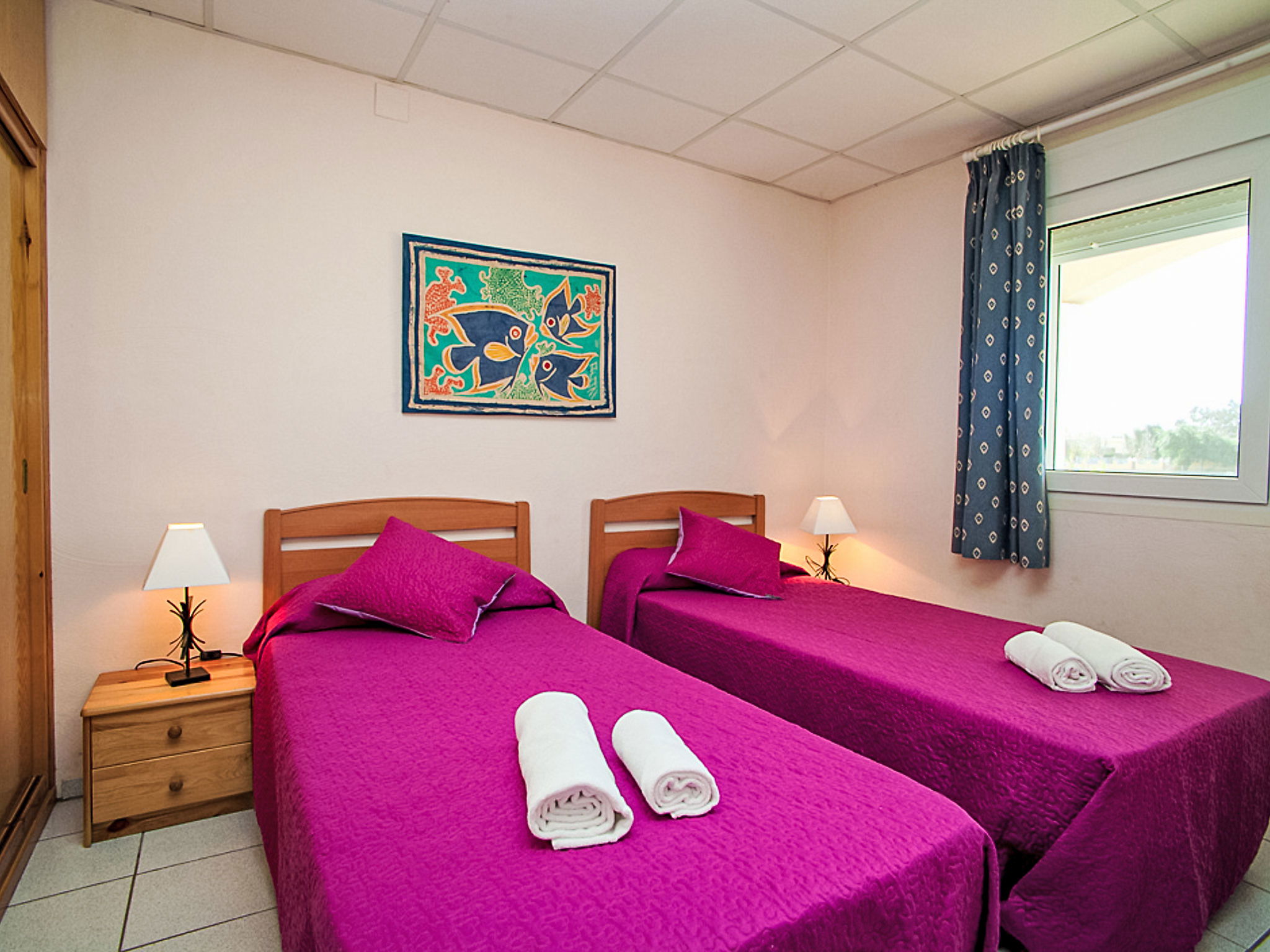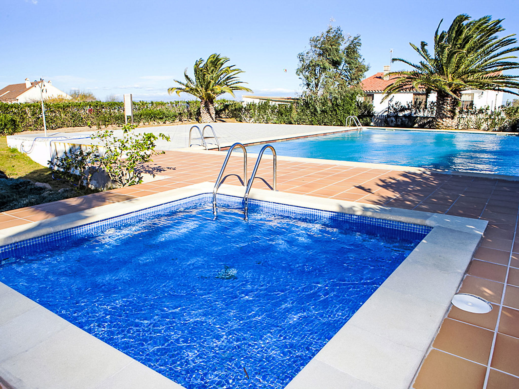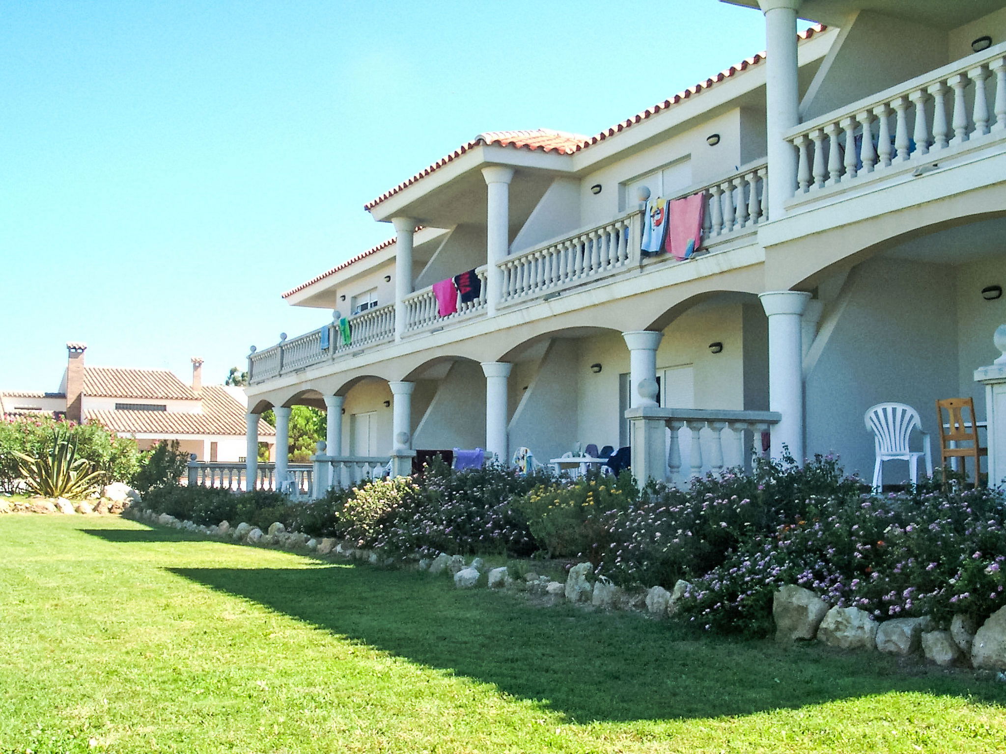 Riumar à 10 km de Deltebre: Belle petite résidence accueillante pour les enfants "Royal Delta", de 2 étages, environnée par les champs. 20 appartements dans la résidence. Situation tranquille, ensoleillée, à 50 m de la mer, à 50 m de la plage, accès direct à la plage. En commun: beau jardin avec pelouse, piscine rectangulaire (20 x 10 m, disponibilité saisonnière: 01.Jan. - 31.Dec.) avec marches intérieures. Bassin pour les enfants, douche extérieure, tennis, barbecue. Infrastructures de la Maison: Connexion WIFI. Place de parking sur le terrain. Magasins, restaurant 100 m, arrêt de bus "Riumar" 1 km. Veuillez noter: équipement pour bébés sur demande. Groupes de jeunes sur demande seulement. La photo ne montre qu’un exemple de location de vacances.