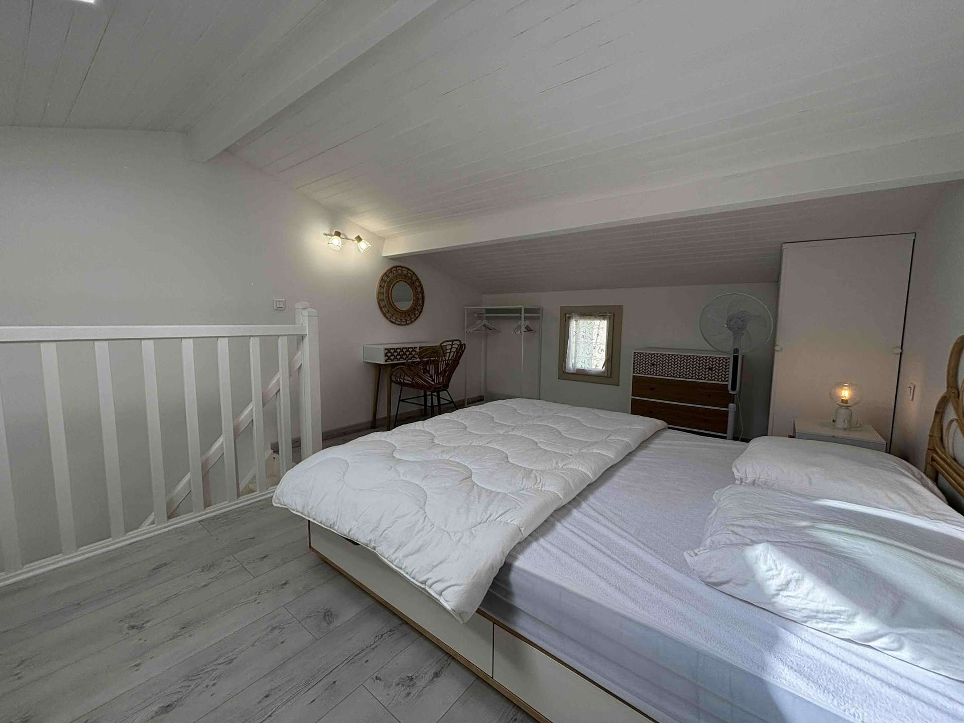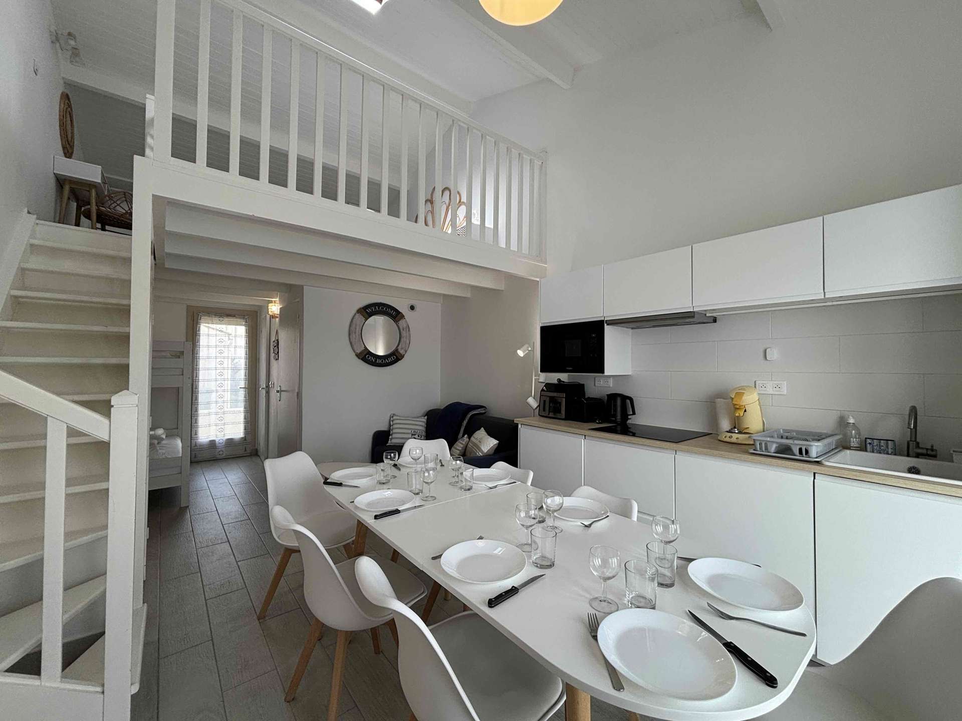 Le logement : Jolie petite maison de vacances à deux pas de la plage se composant d’une pièce de vie avec coin salon avec canapé convertible ( 140) et d' un espace nuit avec lits superposés( 90), d'une cuisine équipée et aménagée ( réfrigérateur et sa partie congélateur, lave-linge, airfryer, bouilloire, cafetière senseo, micro-ondes, lave-vaisselle), d’une première chambre avec deux couchages (160), d'une salle d'eau, et d'un WC indépendant. A l’étage, en mezzanine lit double deux couchages (160).