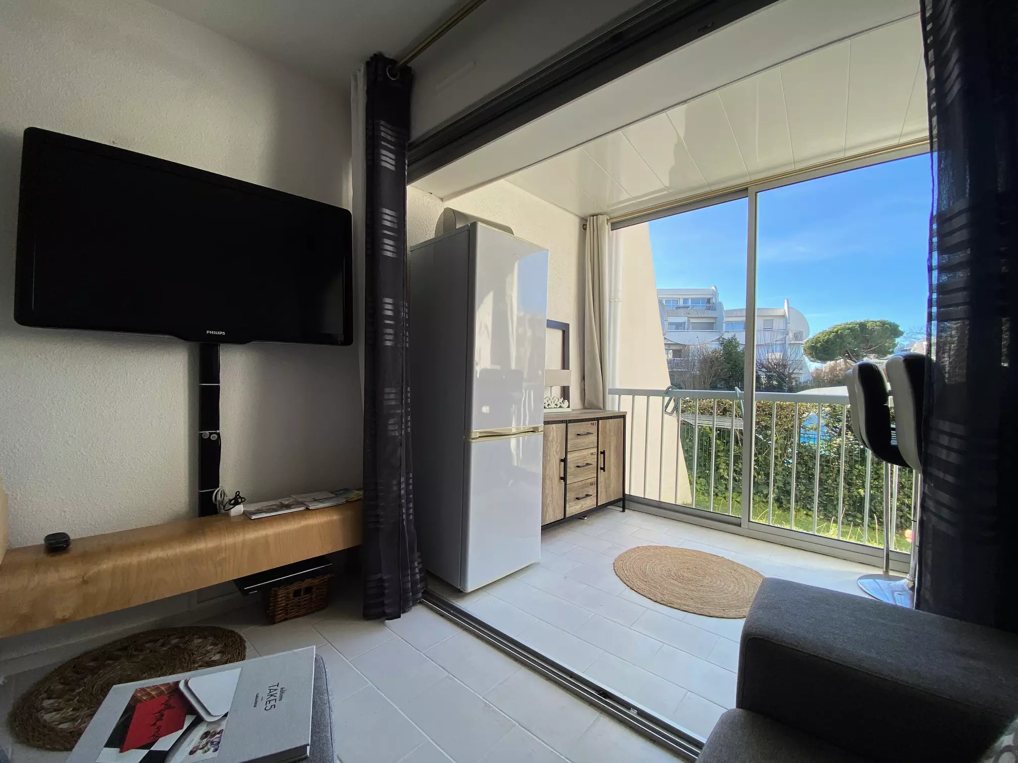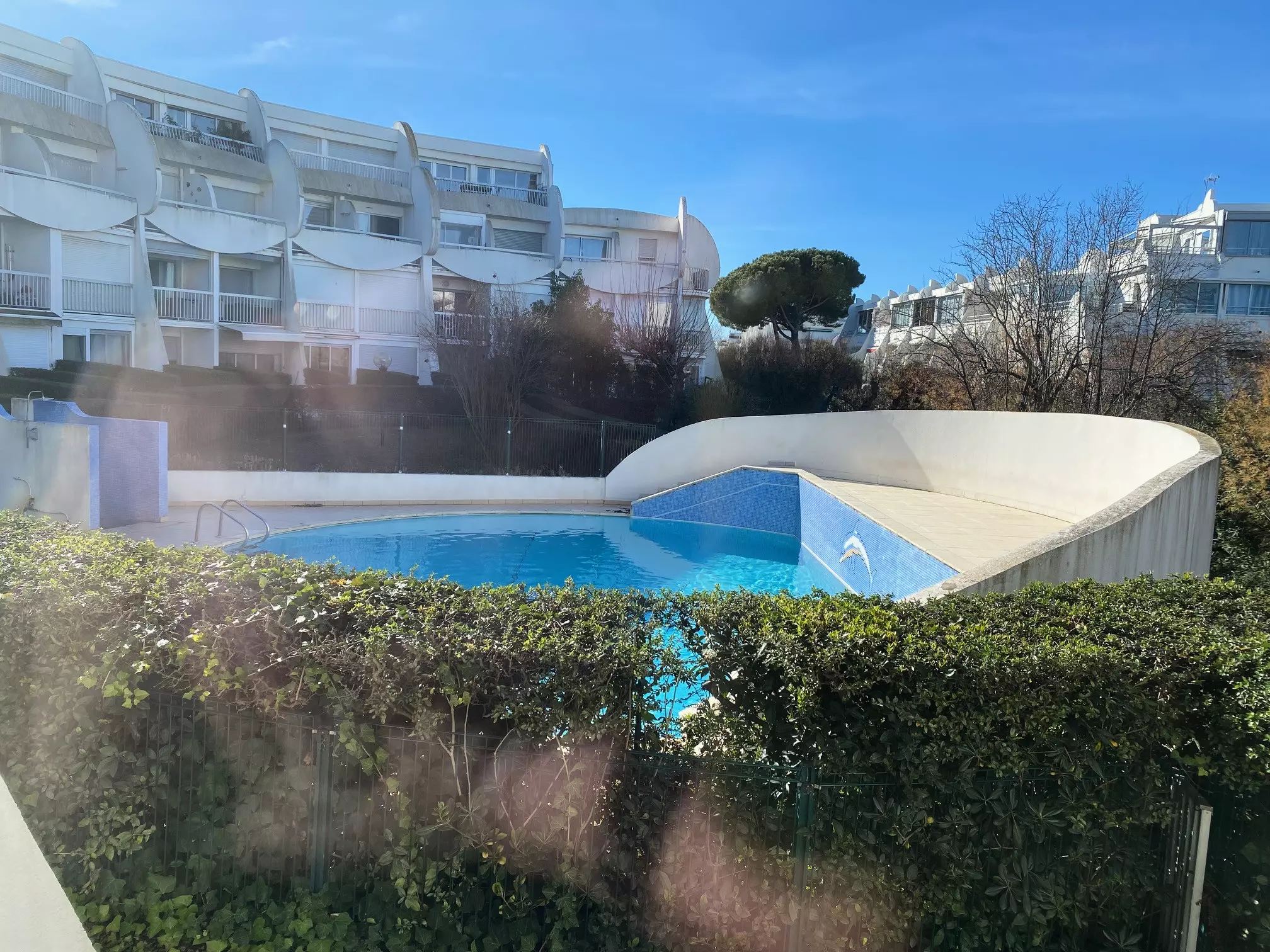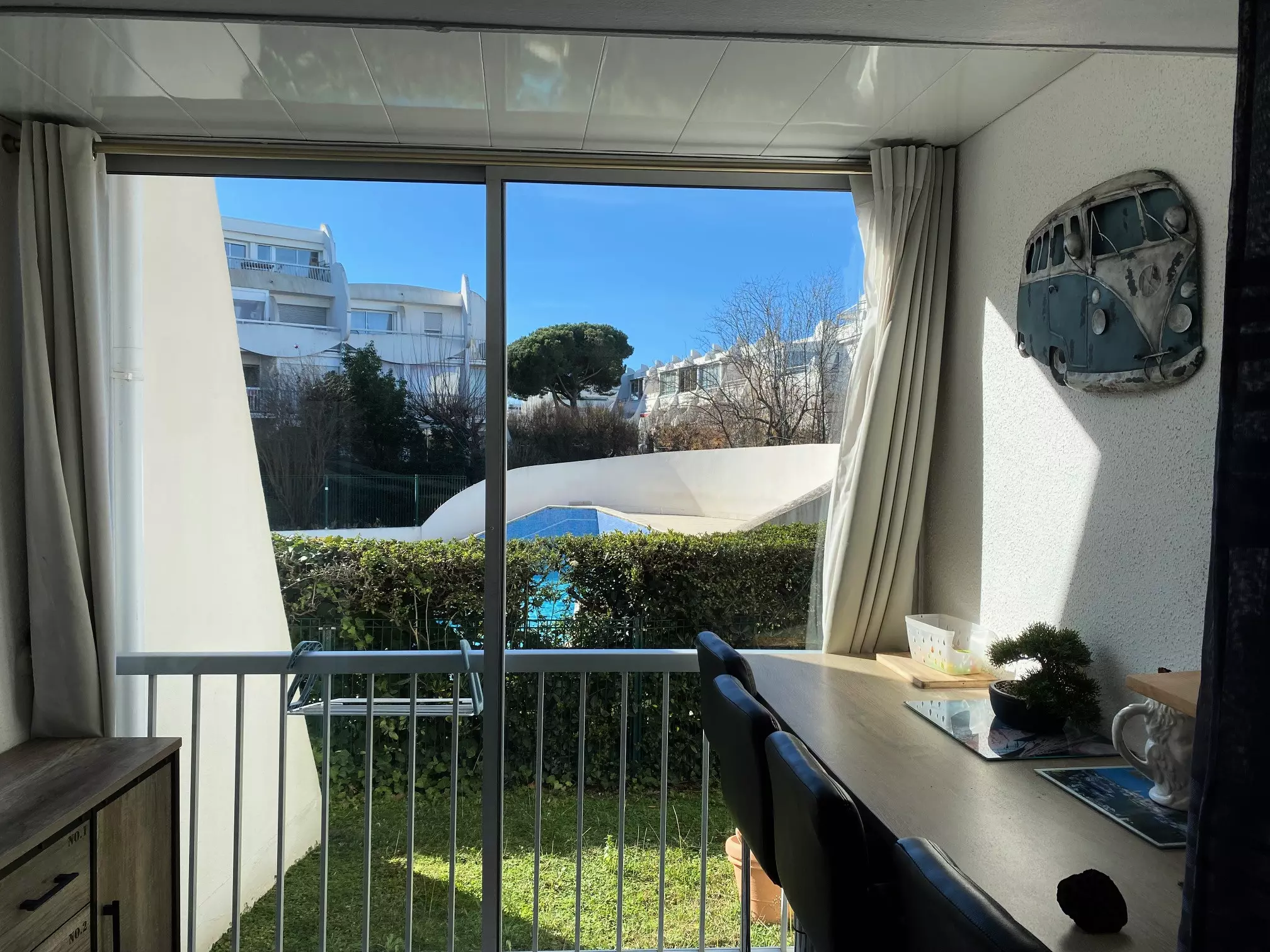 La grande baie vitrée offre une belle luminosité et une vue agréable sur la piscine de la résidence.