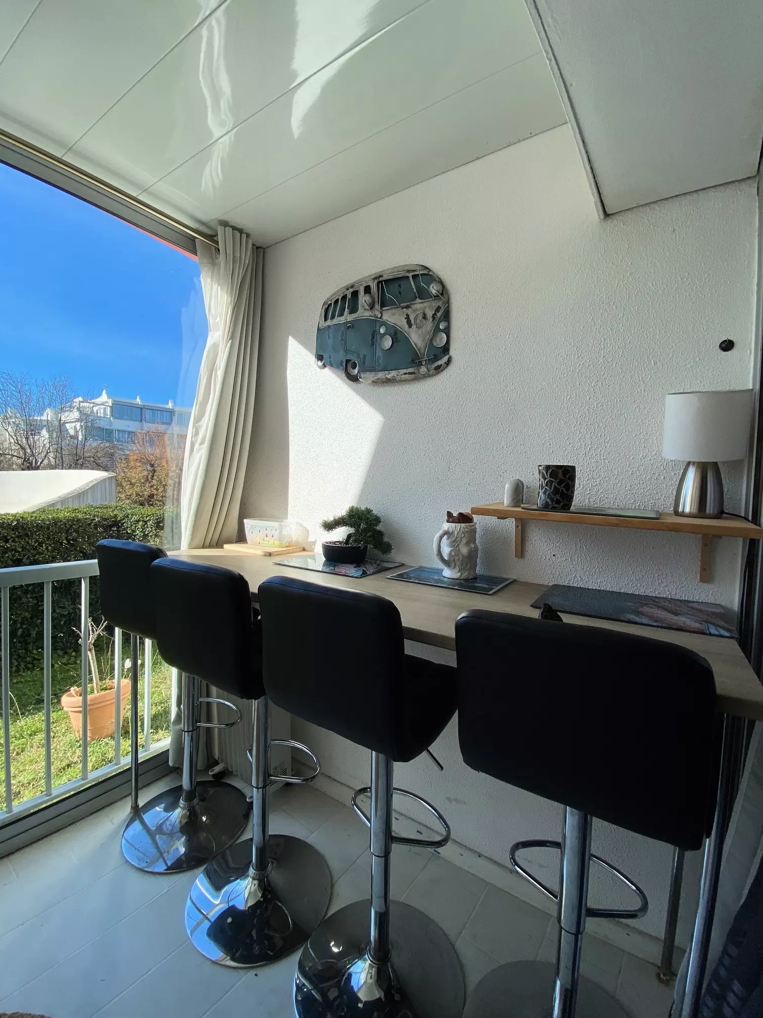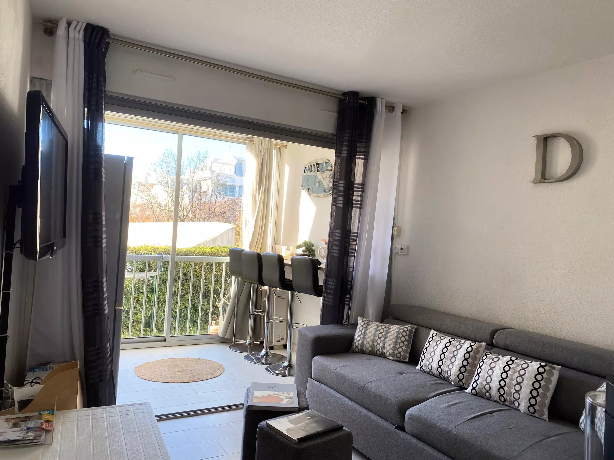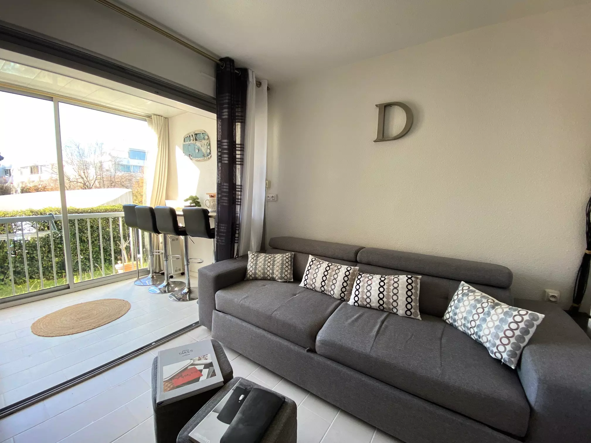 La grande baie vitrée offre une belle luminosité et une vue agréable sur la piscine de la résidence.