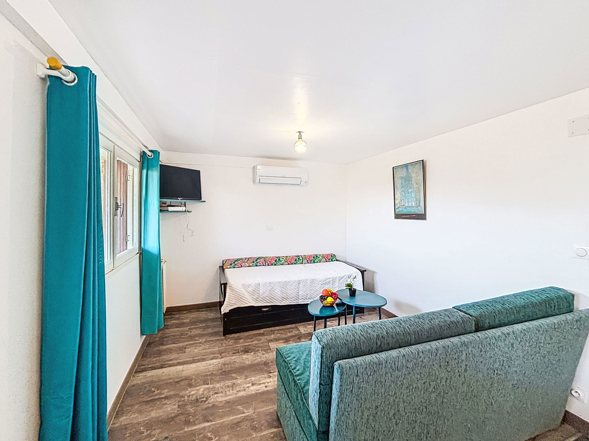 Maison 2 pièces 45 m2, au rez-de-chaussée. Aménagement agréable: salon avec 1 lit gigogne (2 pers. 2 x 90 cm, longueur 190 cm), TV (écran plat), air-conditionné. 1 chambre avec 1 grand-lit (1 x 140 cm, longueur 190 cm), ventilateur. Cuisine ouverte (four, lave-vaisselle, 4 feux, grille-pain, bouilloire électrique, micro-ondes, congélateur, cafetière électrique) avec table pour les repas. Sortie sur la terrasse. Douche, WC séparé. Chauffage électrique. Terrasse 20 m2. Meubles de terrasse, chaises longues (2). Vue sur la mer. A disposition: fer à repasser. Internet (Connexion WIFI, gratuit). Place de parking. Veuillez noter: détecteur de fumée. Annonce d'un particulier (art 155, IV du CGI).