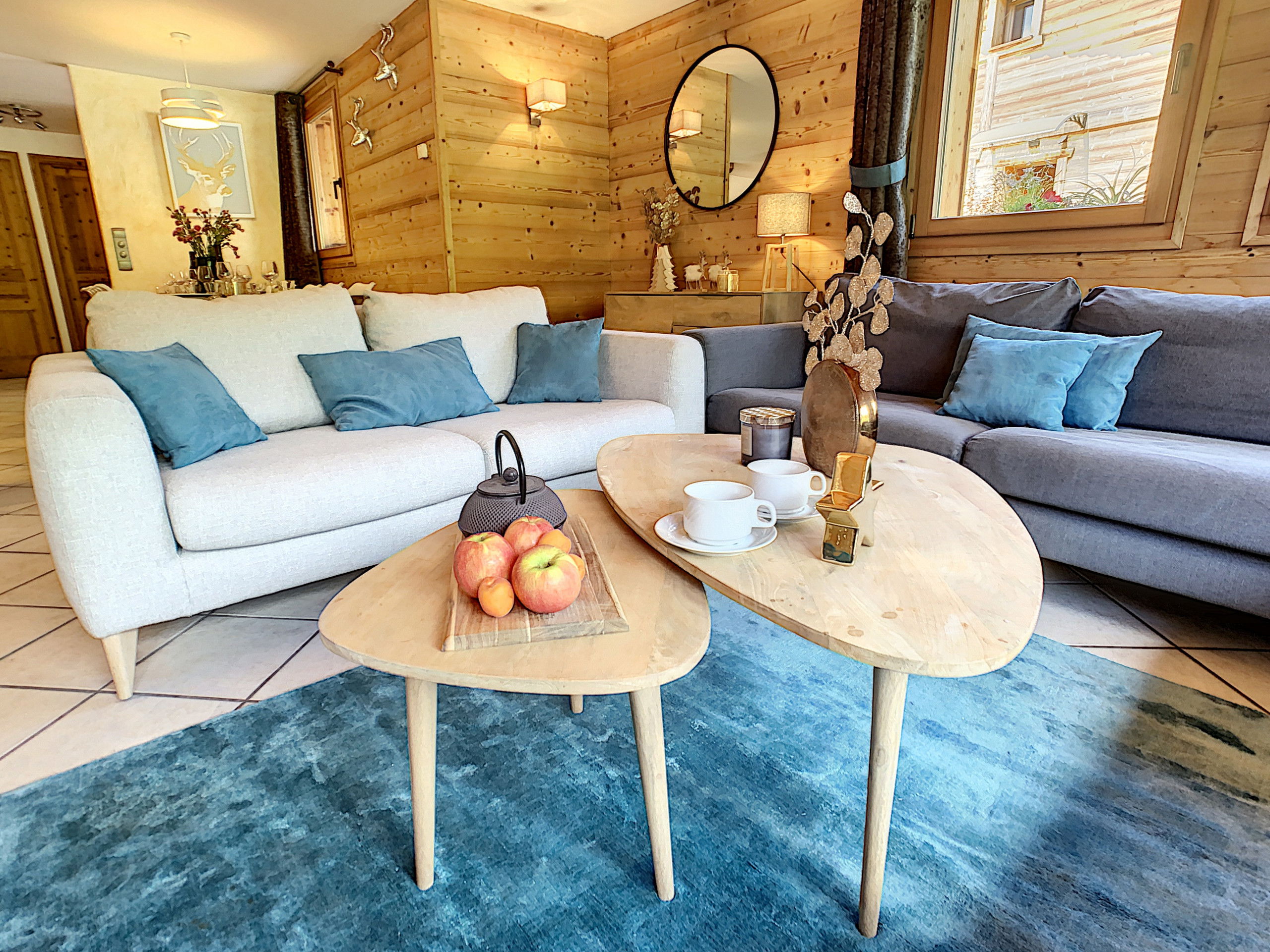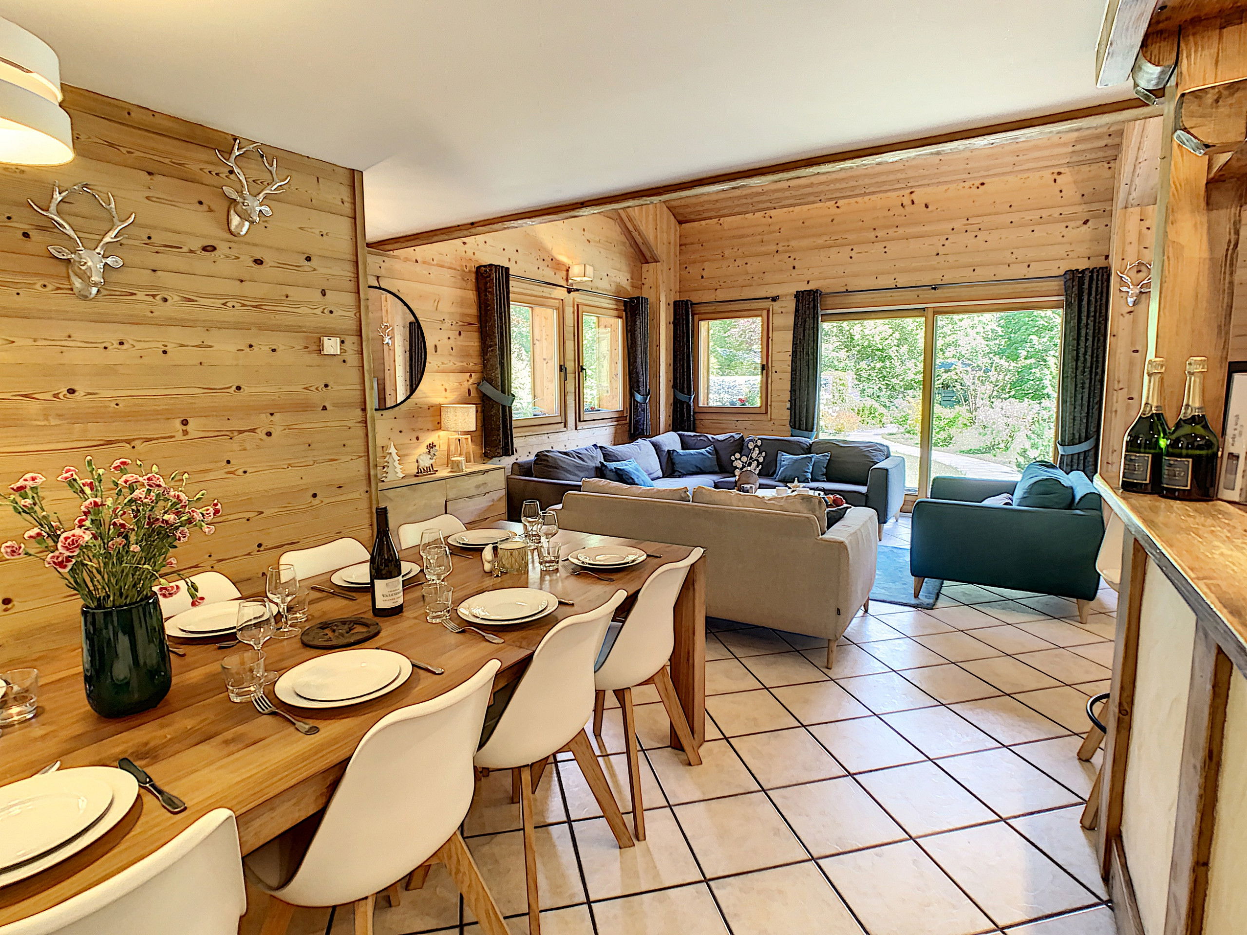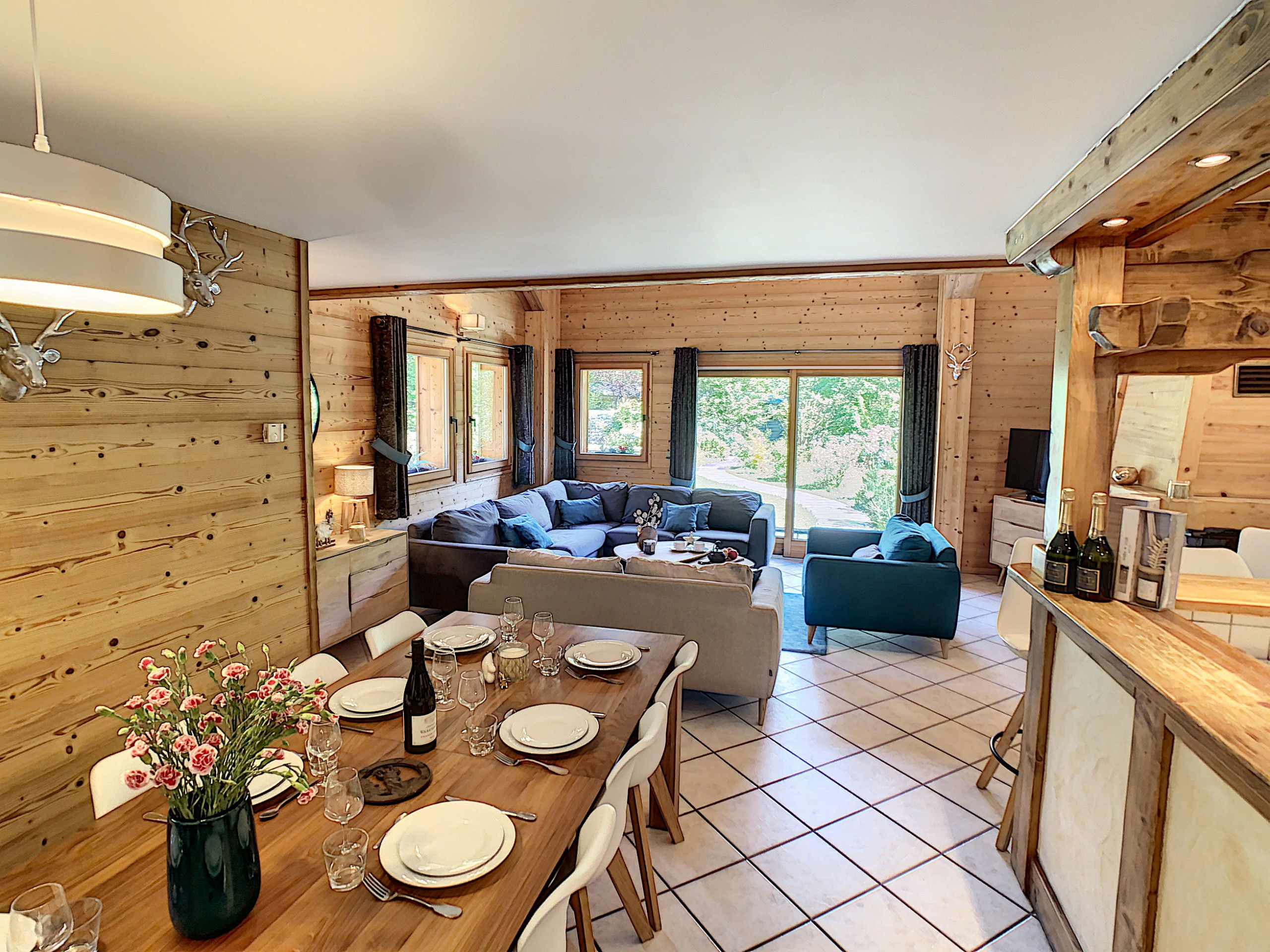Dès votre arrivée, s'installe avec un grand séjour baigné de lumière, doté d'une télévision et d'un coin salon avec une cheminée accueillante. L'accès à la terrasse offre une vue imprenable sur les montagnes, créant le cadre parfait pour des moments conviviaux.