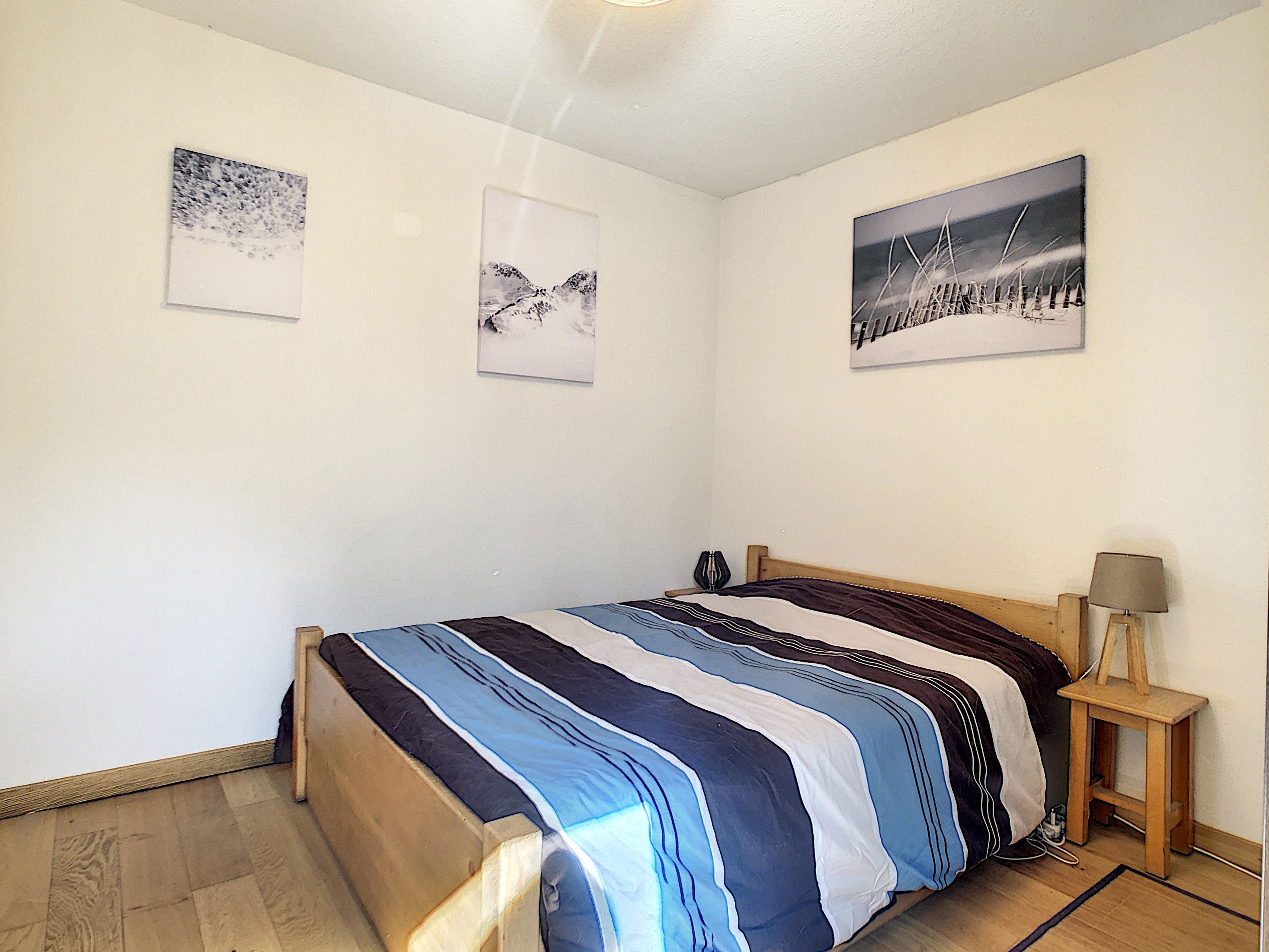 La chambre est équipée d'un lit double et de rangement, avec un accès direct sur le balcon-terrasse depuis sa porte-fenêtre.