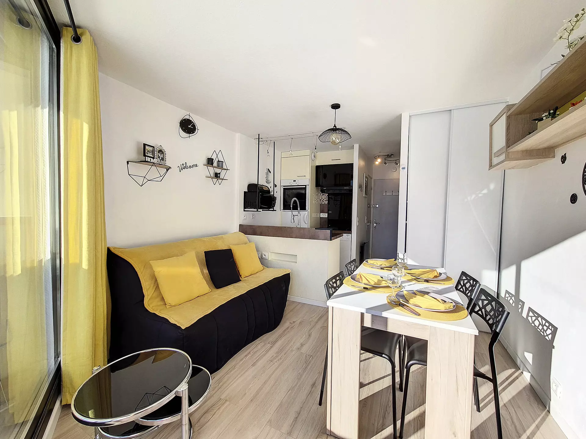 Cuisine ouverte équipée de 4 plaques vitro céramiques, réfrigérateur, four traditionnel et micro-ondes, bouilloire, grille-pain et cafetière.
