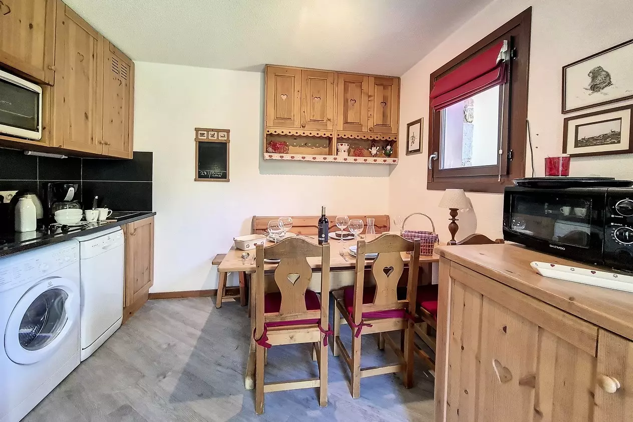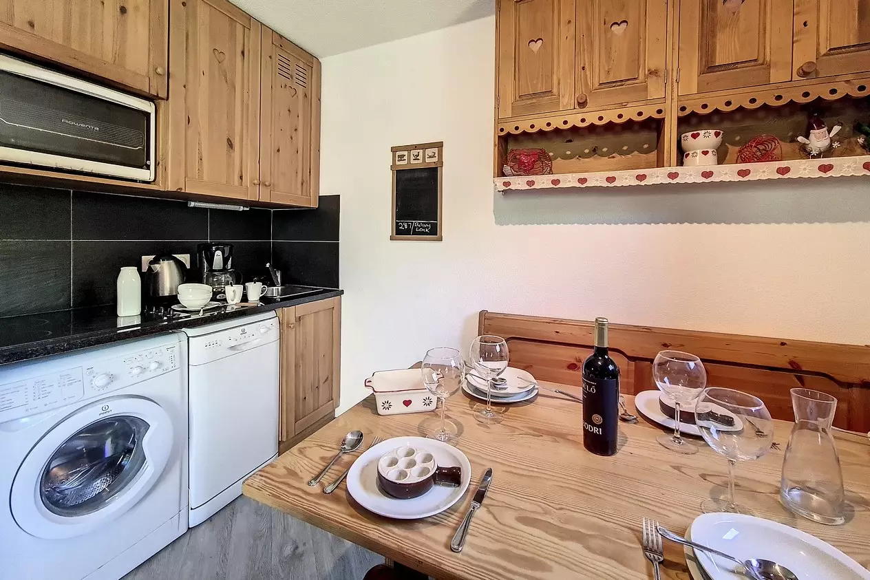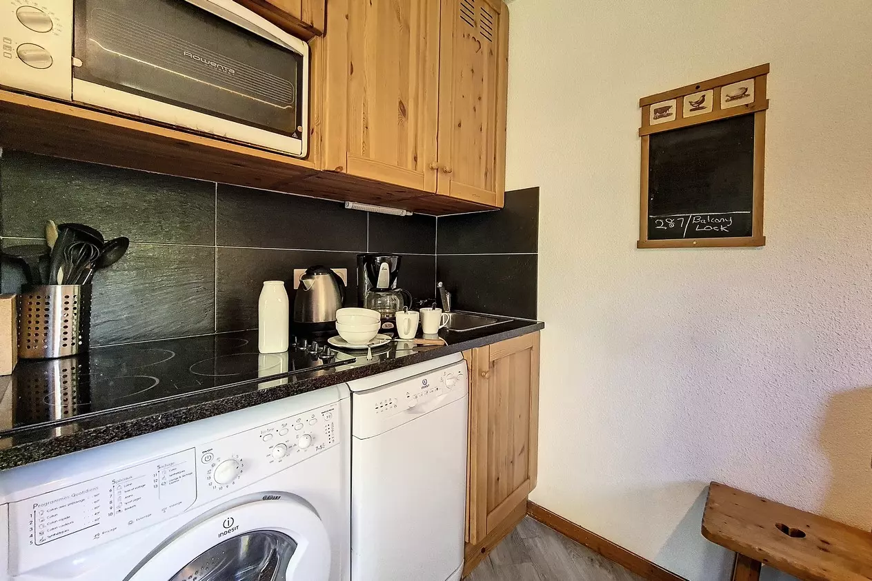 Cuisine : 4 plaques vitrocéramiques, four traditionnel, micro ondes, réfrigérateur et grand congélateur, lave-vaisselle, grille-pain, bouilloire et cafetière. Le lave linge est situé sous les plaques de cuisson.
