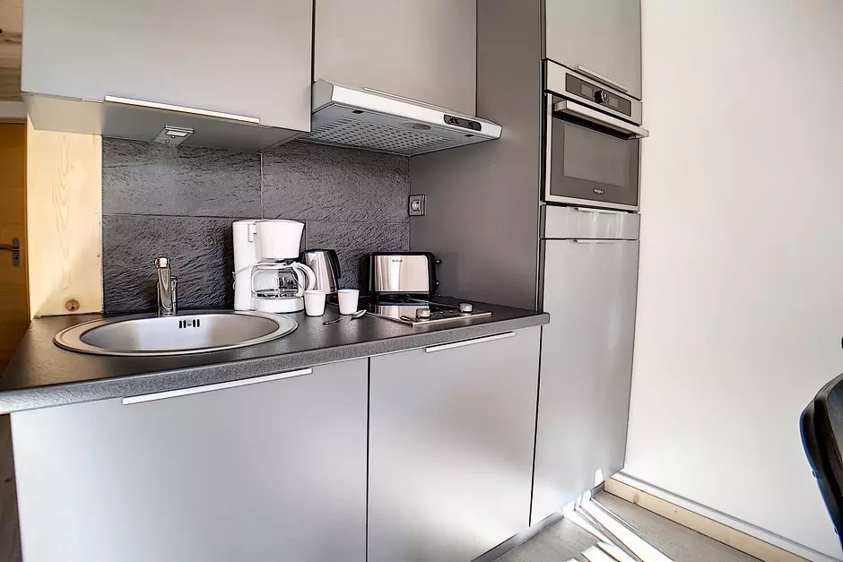 Cuisine équipée de 2 plaques vitrocéramiques, four micro-onde grill combiné, réfrigérateur, lave-vaisselle, bouilloire, grille-pain et cafetière. appareil raclette/pierrade