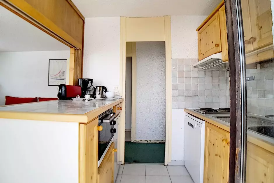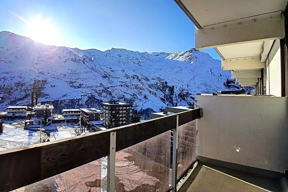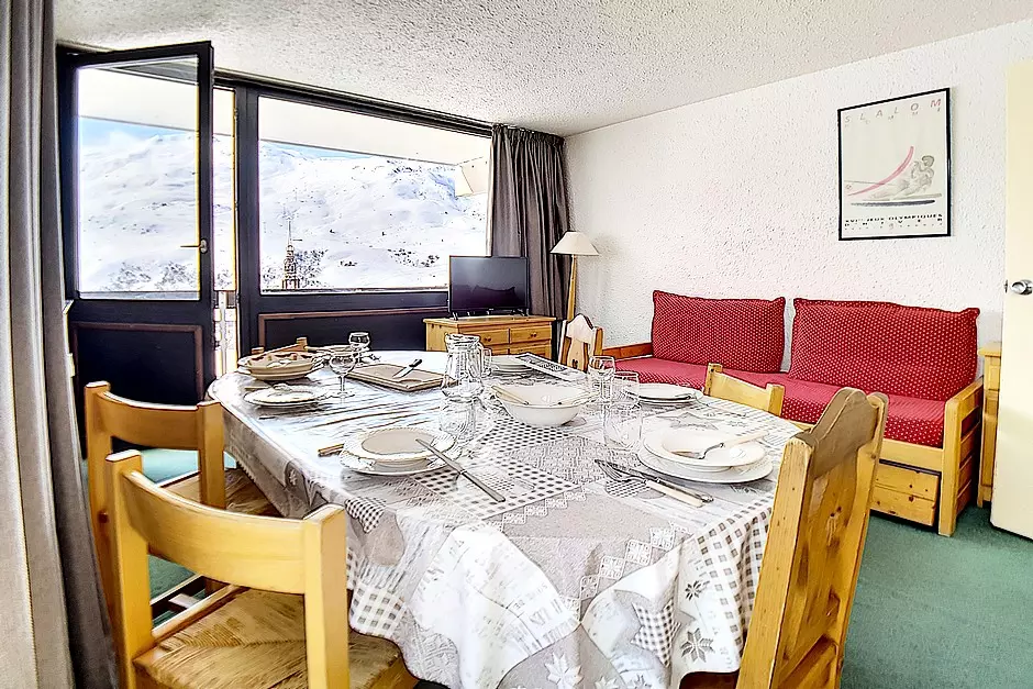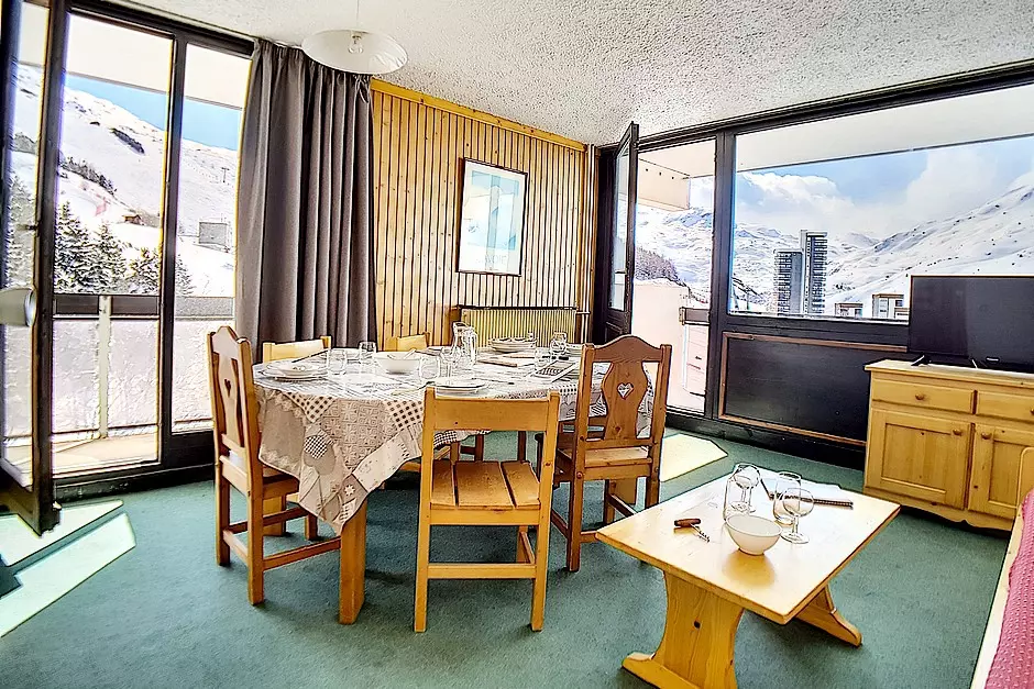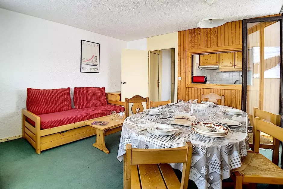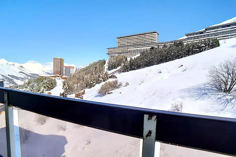 Appartement de 3 pièces 48m² pour 8 personnes. Il est situé au 8ème étage avec ascenseur. Il a un balcon exposé Sud avec la vue sur les pistes.