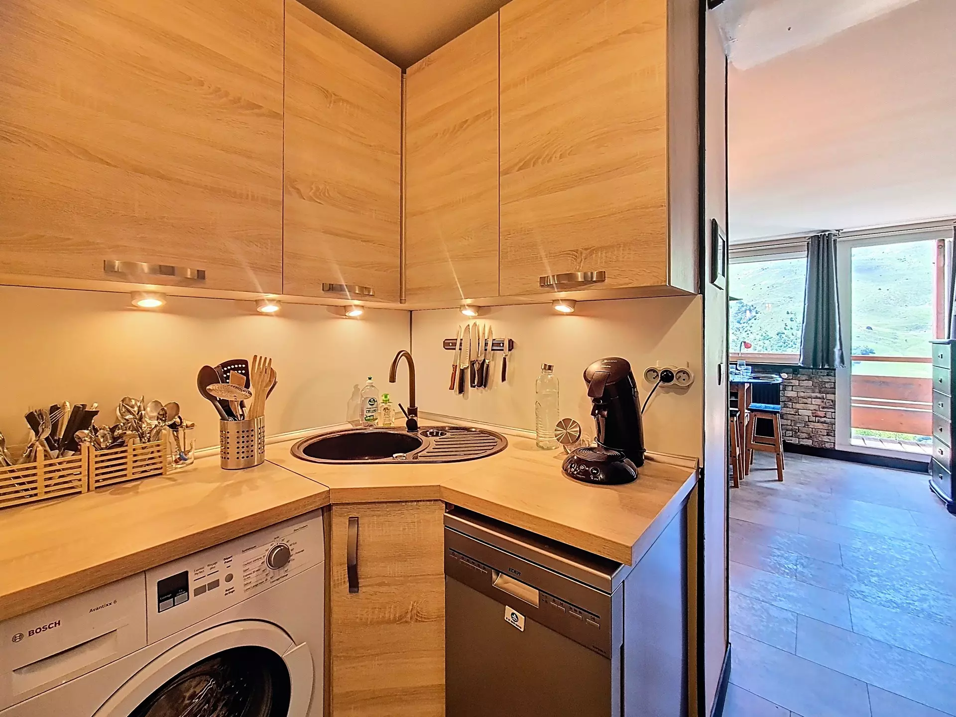 Cuisine incorporée avec 3 plaques vitrocéramiques et hotte, four, four micro-ondes, grand réfrigérateur et congélateur, lave vaiselle, lave linge, grille-pain, bouilloire et cafetière Senseo
